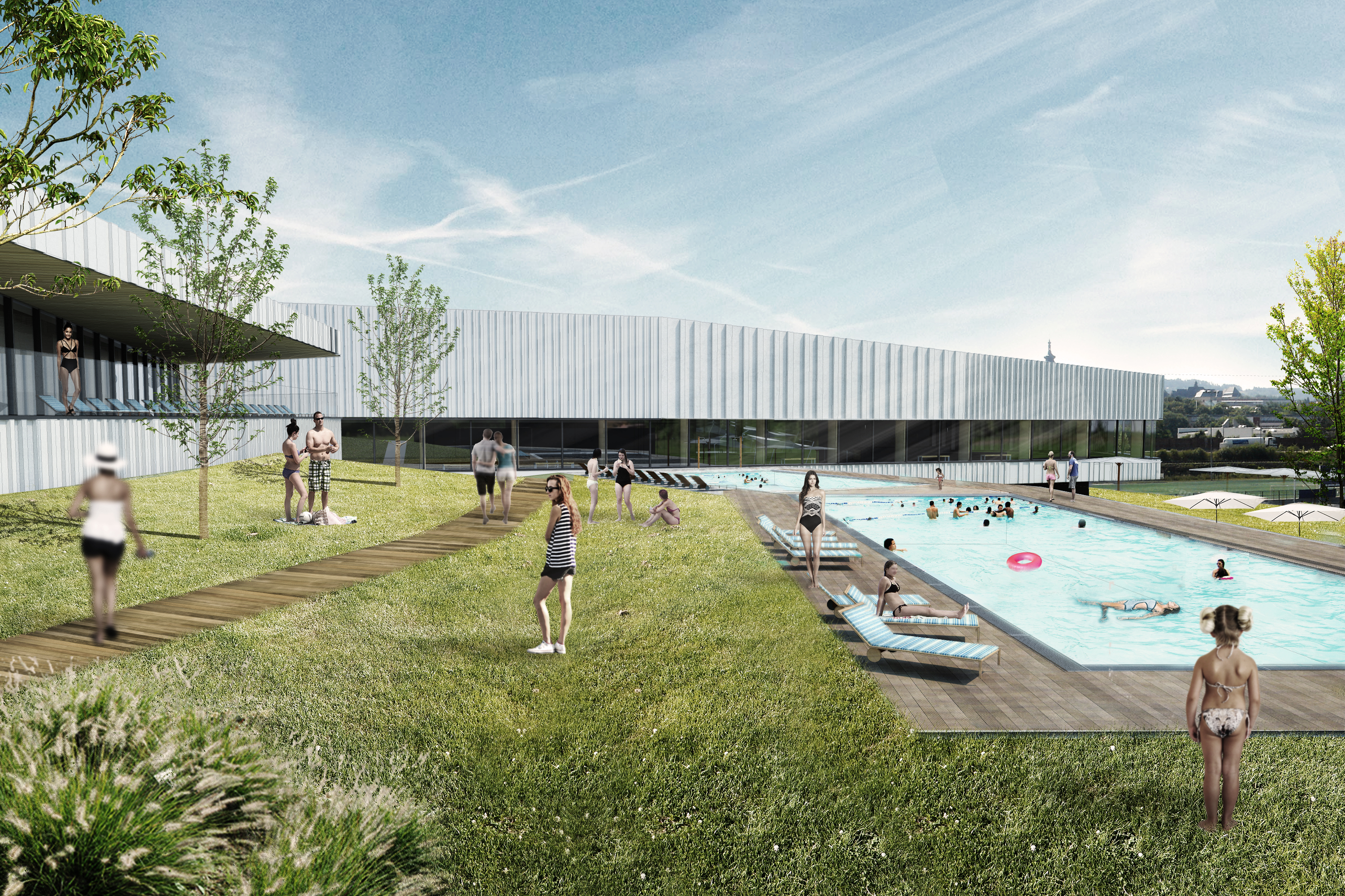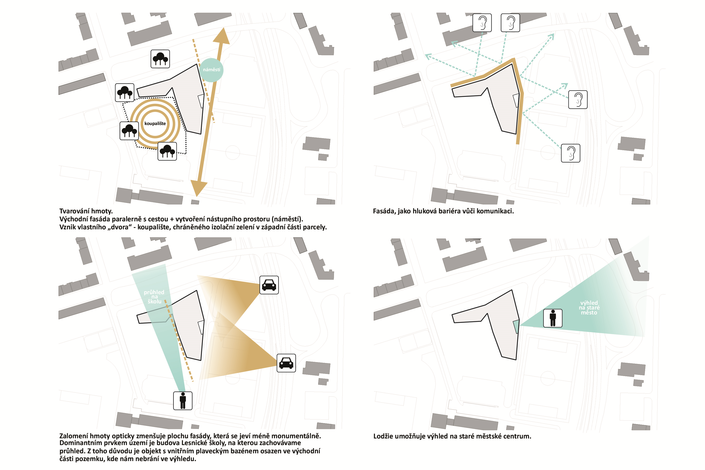 Návrh obsahuje dispozičně kvalitní řešení a to jak vnitřních prostor bazénu tak i jeho venkovní části. Dispozičně je návrh bezbariérový. Návrhem je prokázaná bezkolizní etapovost výstavby. Koncepce uložení objektu – resp. jeho hmota svou modelací vytváří polouzavřený jihozápadní venkovní prostor, který je tak ochráněn od sousedních rušných komunikací. Návrh obsahuje kvalitní technologicko dispoziční řešení. Dopravně je projekt kvalitně zvládnutý.