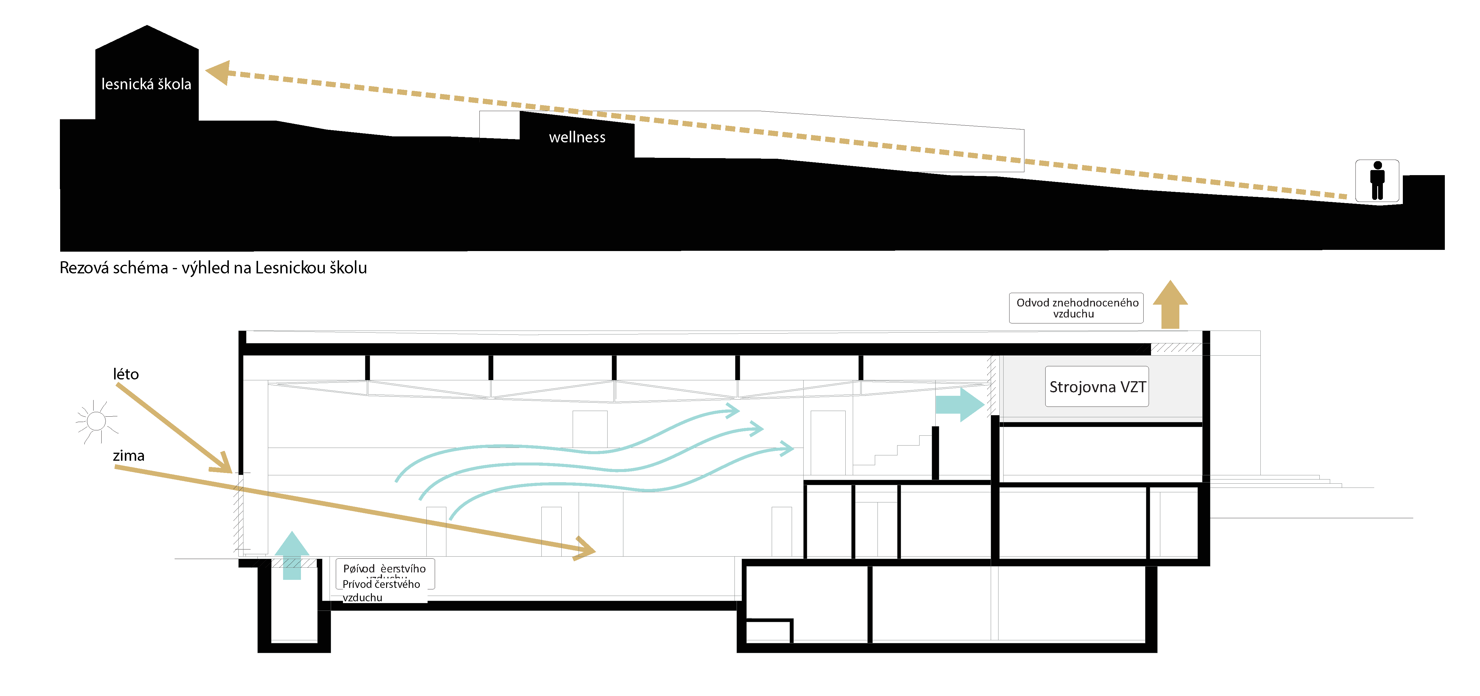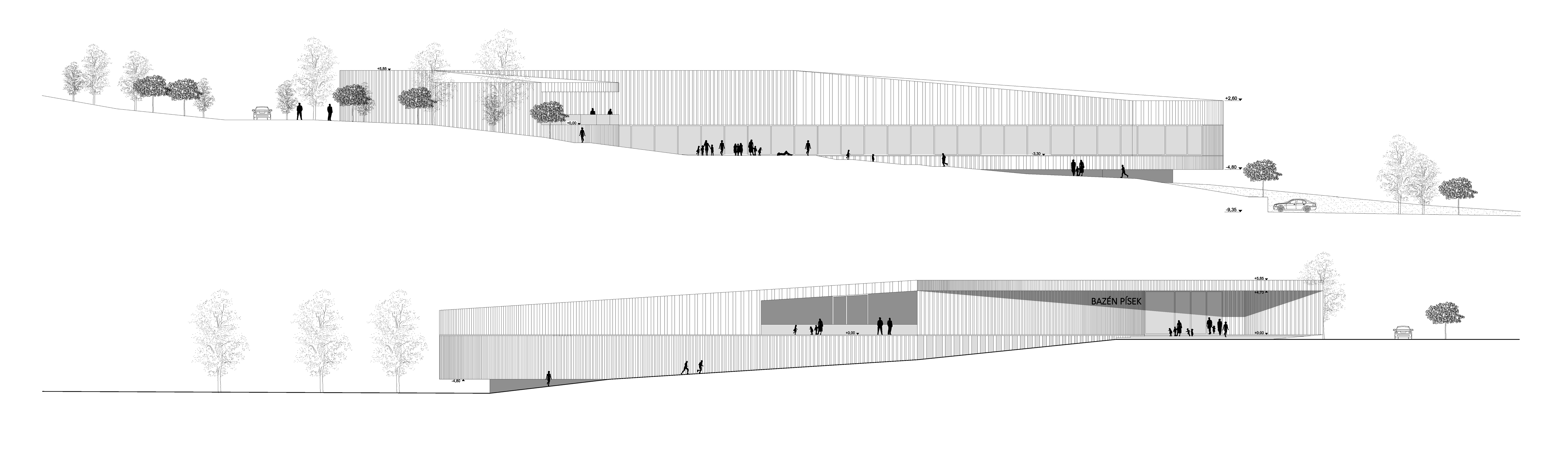 Nový plavecký areál v Písku sa vďaka svojmu prírodnému charakteru stáva jednou z najcennejších rekreačných zón mesta. Hmota stavby je tvarovaná a osadená v prostredí tak, aby mala v jednotlivých pohľadových uhloch príjemné merítko a aby rešpektovala morfológiu terénu. Veľký objem plavárne je súčasne bariérou od dopravnej tepny a železnice. Menšia hmota wellness svojou výškou umožňuje pohľad na dominantu územia - Lesnícku školu, čím zachováva kontinuitu v prostredí.