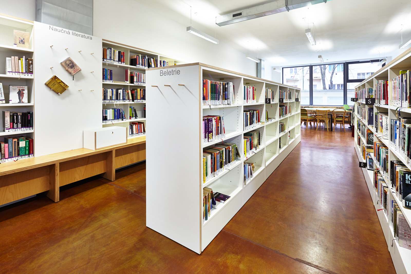 Interiér je dle požadavku uživatele přehledný. Nikoliv ve smyslu kontroly, ale srozumitelnosti a snadné orientace pro návštěvníka. Byly odstraněny všechny vestavby prodejny potravin. Přízemí je jeden velký prostor dělený pouze knižními regály a prosvětlený z ulice i vnitrobloku. Je z ulice přístupný bezbariérově. Jednotlivé návštěvnické niky jsou uspořádány s ohledem na míru využívání od nejaktivnějších blíže vstupu po soustředěnější v odlehlejší části. Niky mají svoje barevné akcenty. Suterén je pak specifickým prostředím, které je ale stále, díky hlavnímu foyeru ve středu, přehledné.
