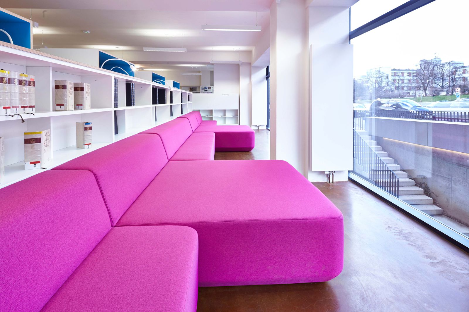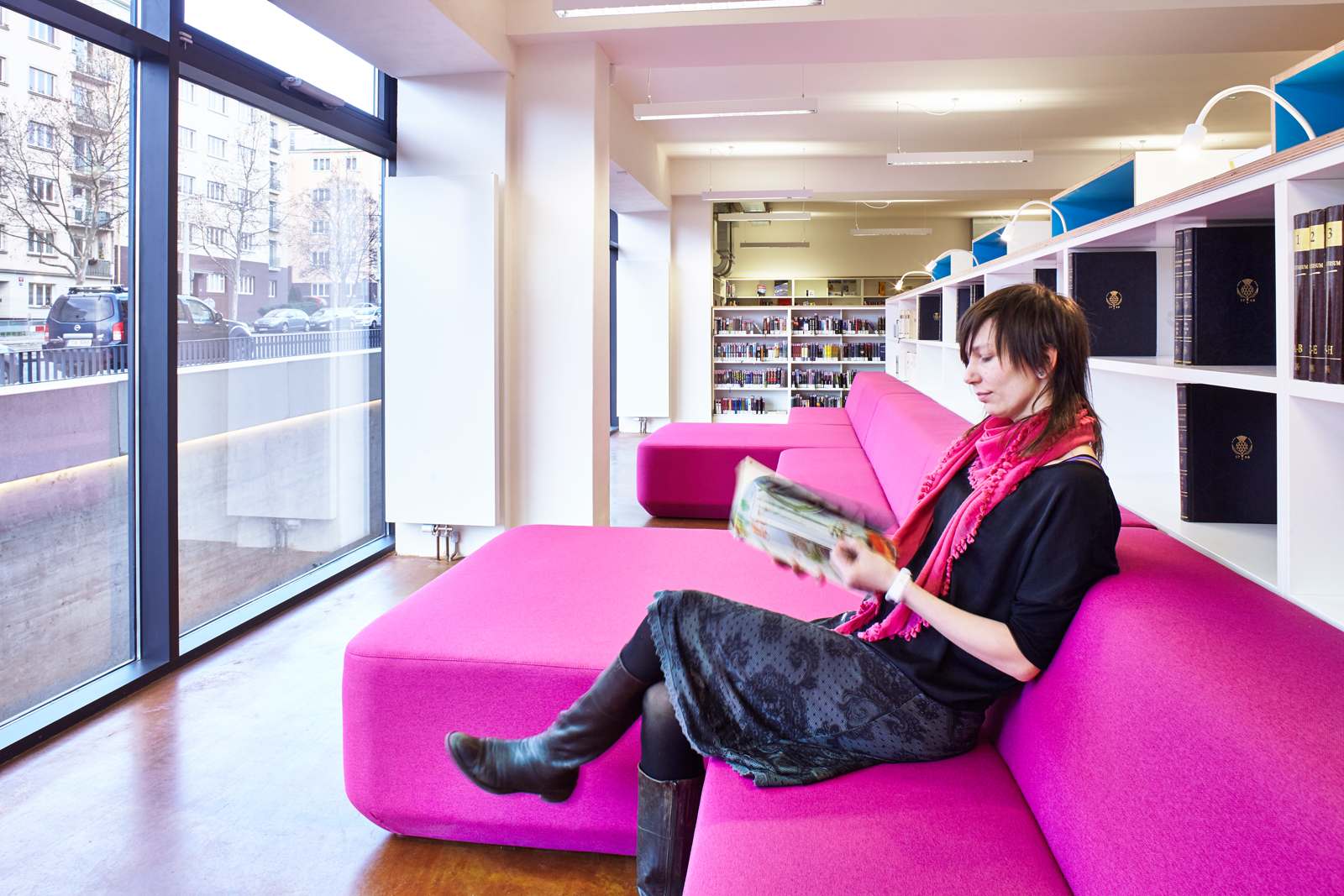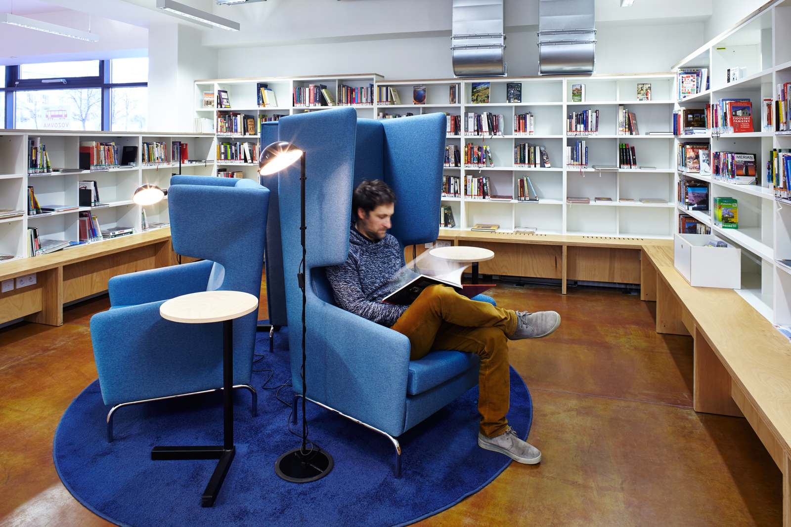 Vedle čítárny je v rohu umístěna intimní studovna s několika pohodlnými křesly se stolky a stojacími lampami. Naproti ní je pak společná studovna soustředěná okolo velkého stolu. Podél zóny služeb je přístup ke schodišti a plošině do suterénu a na zásobovací dvůr. Dvůr je přístupný jak ze schodiště, tak z mezipodesty výtahu. Ve středu dispozice s nejmenší intenzitou přirozeného světla jsou umístěny volné knihovní regály nižší, aby nebránily přehlednosti interiéru. Knižní regály přízemí přecházejí i do schodišťového prostoru, kde slouží více informativnímu účelu v návaznosti na volnější program suterénu. Je zde možné umístit plakáty na akce.