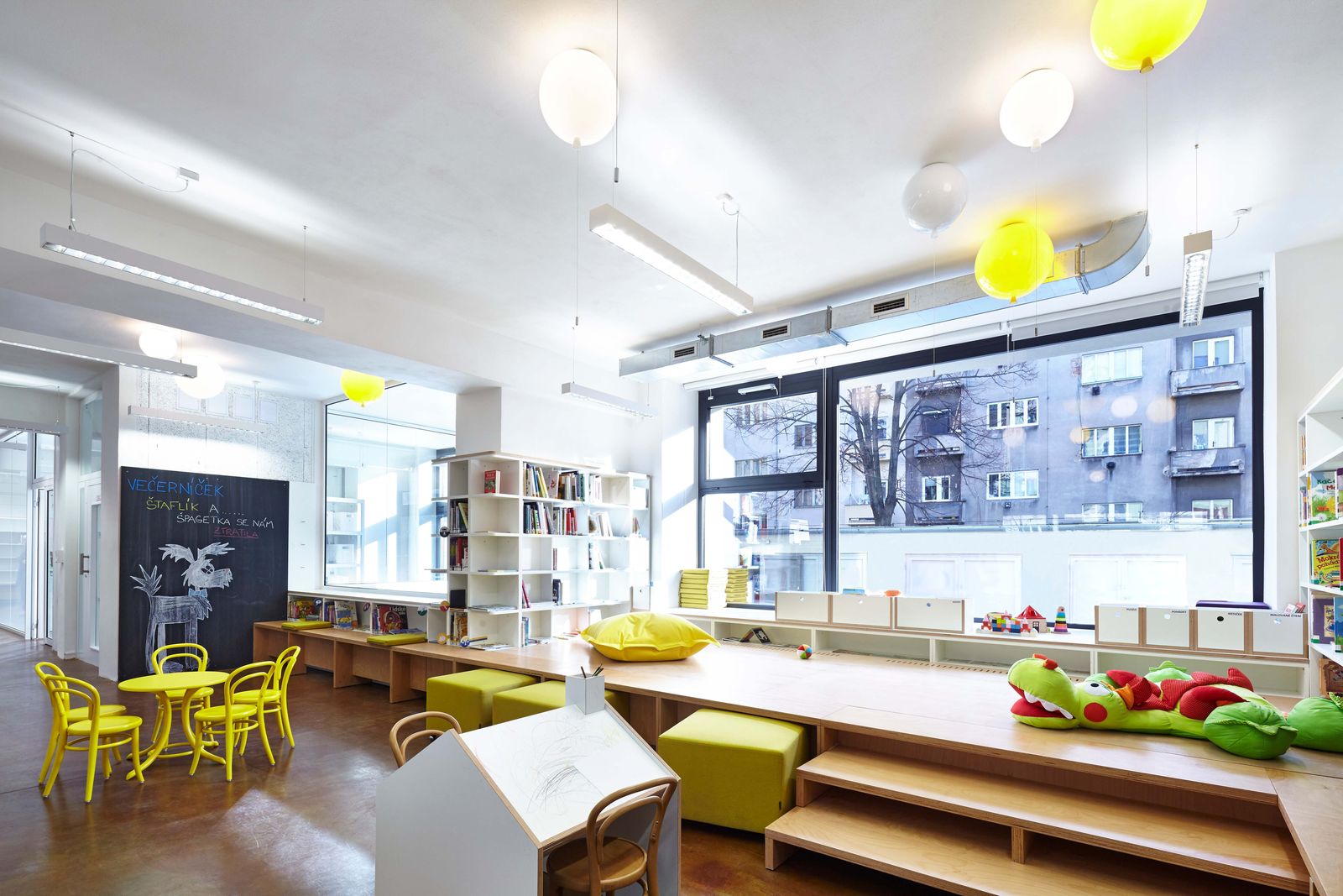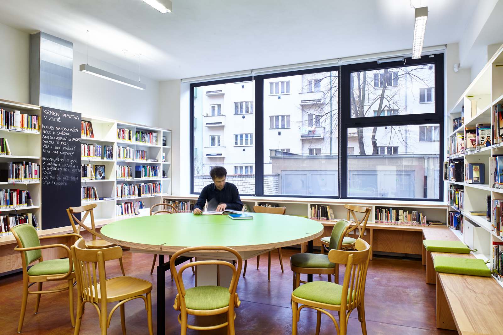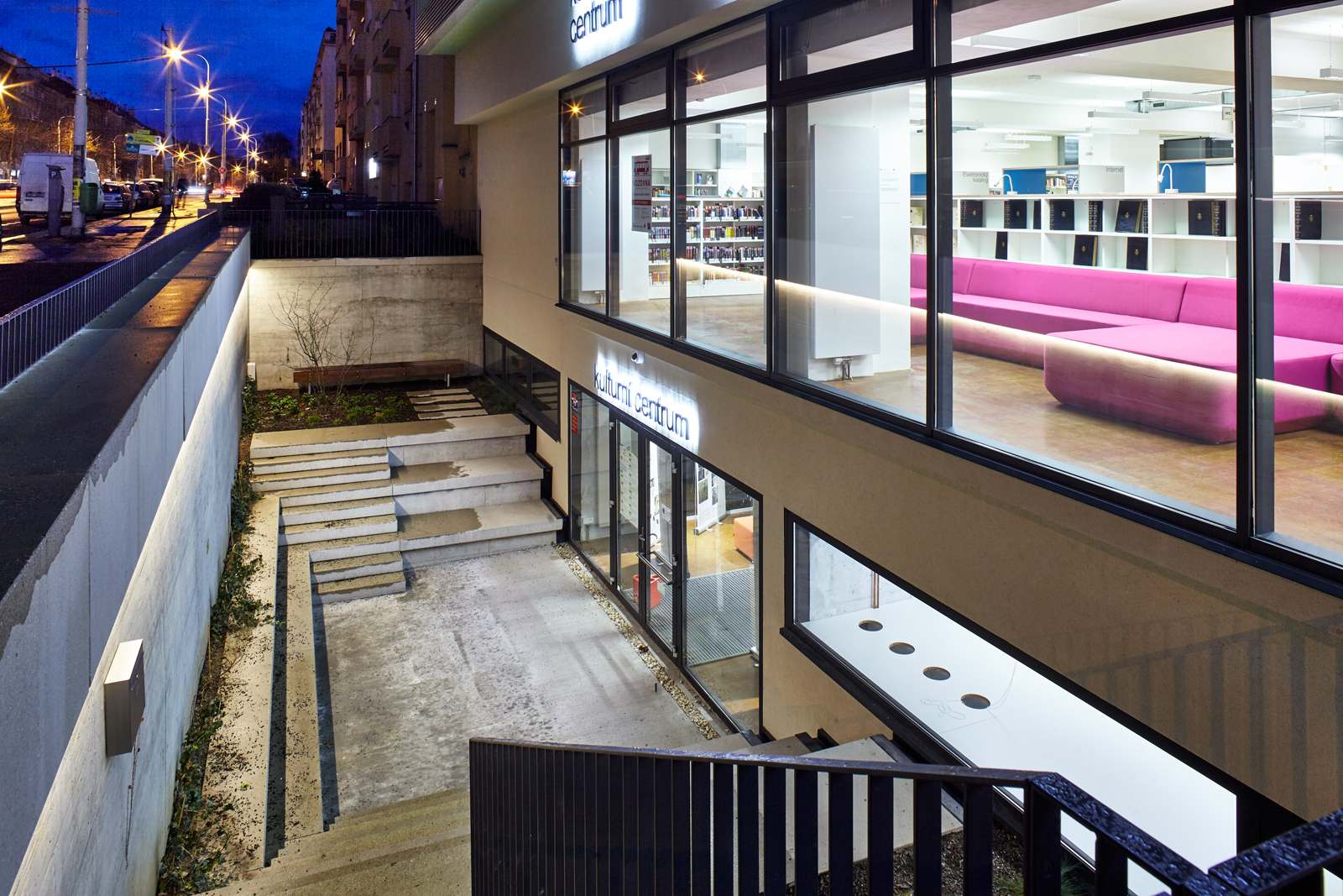 Prostory pro pobočku Městské knihovny a Kulturní centrum MČ Praha 3 byly vytvořeny přeměnou bývalé prodejny potravin spojené s nevyužívaným podzemním skladem v bytovém objektu ze 70. let 20. století. Knihovna využívá přízemí, kulturní centrum podzemí, které bylo zpřístupněno a prosvětleno velkým anglickým dvorkem. Knihovna má velkorysý bílý prostor s nikami s barevnými akcenty pro odlišné činnosti. Kulturní centrum má ponechané syrové betonové stěny a je rozděleno skleněnými příčkami na sály různých velikostí. Spojení knihovny a kulturního centra tvoří schodiště, které zároveň vytváří stupňovité hlediště a prosvětluje centrum z druhé strany, než je anglický dvorek.