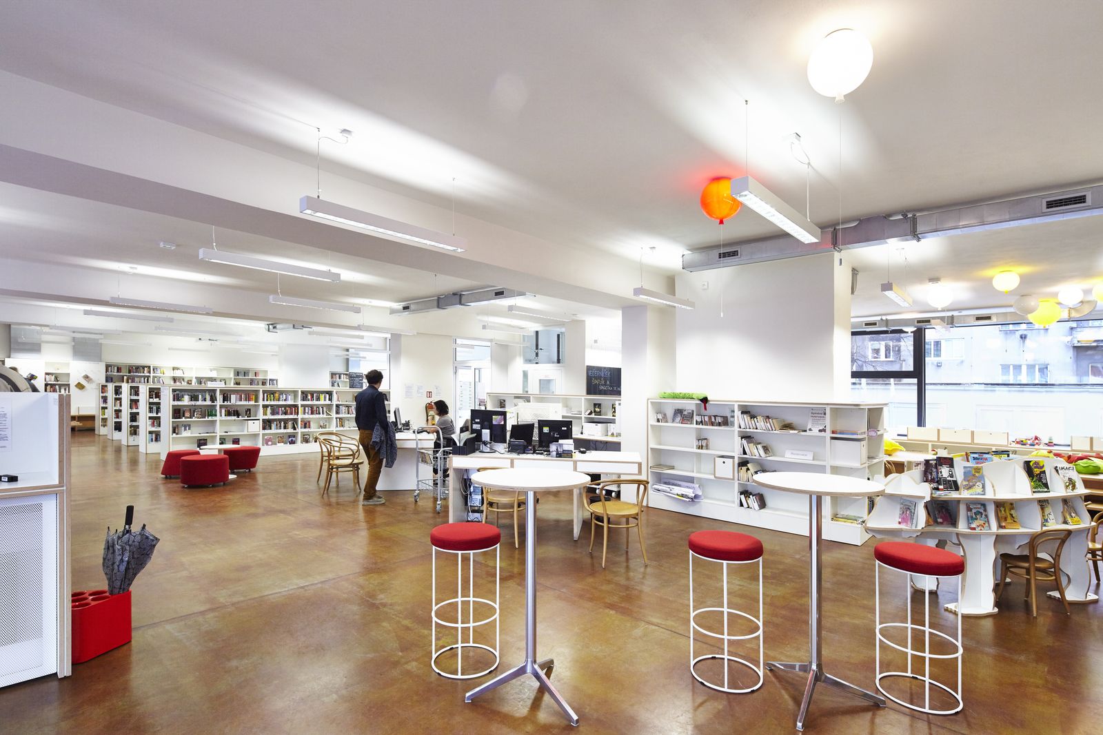 Prostor u hlavního vstupu slouží jako přechodová zóna s možností neformálního sezení při čekání na knihovnické služby, nebo schůzku. Regálová stěna zde obsahuje především knižní novinky a další rychloobrátkové informace. Mírně ke středu půdorysu v kontaktu se vstupní zónou i zásobovacím vstupem ze dvora je zóna služeb se dvěma pracovními místy a jejich zázemím. Výpůjční pult tvoří dva oddělené stoly, takže nevzniká přísná hradba mezi knihovníkem a čtenářem, ale naopak vlídné pozvání. Naproti vstupu, blízko obslužnému místu je dětské oddělení. Před oknem je vyvýšené podium jako herní kout. Dětské oddělení má dostatek prostoru i pro případné dětské kočárky. Jsou v něm i atypické prvky – regál-lední medvěd a stůl-domeček. Při výkladci do ulice Koněvova je umístěna dlouhá sedačka, které jej využívá a které slouží jako čítárna s vyšší obrátkovostí. Sedačka zve kolemjdoucí k návštěvě knihovny a zároveň odstiňuje vnitřní prostor od ruchu ulice V jejích zádech jsou zabudována individuální místa ke studiu a internet.