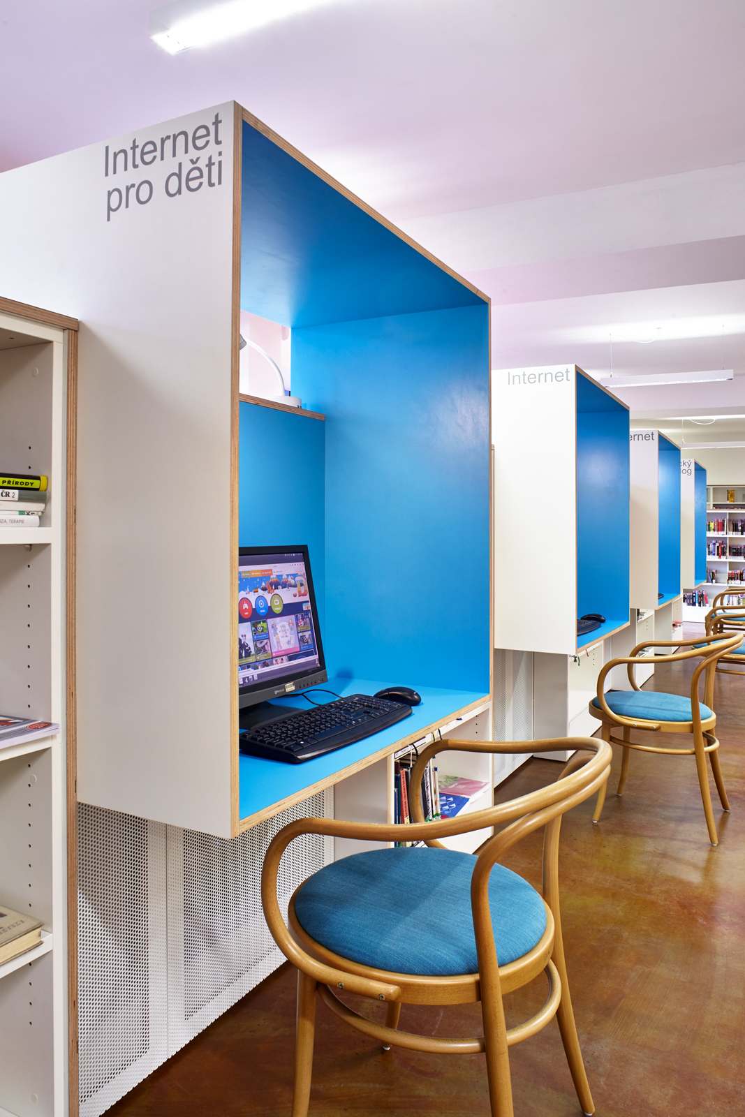Většina mobiliáře je navržena jako samonosná truhlářská konstrukce z aglomerované desky na bázi dřeva. Takové konstrukce mají knižní regály, opláštění vzduchotechnických prostupů a montované dělící příčky. Barevný koncept je pro celkové vyznění interiéru zásadní. Navazuje na střídmost objektu ze 70. let. Přízemí je v základě více střídmé, neboť zdůrazňuje především barevnost samotných knih. Suterén je výraznější ve vložených prvcích, neboť již nemá knižní regály a jako suterénní prostor vyžaduje jisté oživení. Přízemí má bílé stěny a strop. K nim je pak navržena zemitě barevná podlaha. Knižní regály jsou bílé s přiznanými hranami překližky. Spodní předsunutý regál-lavice v přirozené barvě dřeva spíná prostor. Toto základní pozadí je doplněno barevnými akcenty v čistých barvách dle základního barevného diagramu skládání světla podle vlnové délky. Těmito barvami, akcentovanými na sedácích nebo deskách stolů, jsou odlišeny jednotlivé niky se specifickými prostředími. Vstupní zóna je, i s ohledem na korporátní barvy městské knihovny červená (sedačky). Od ní pokračuje barevné spektrum žlutým dětským oddělením (polštářky, koberec, sedačky, světla), zelenou studovnou (stůl), modrými individuálními studijními boxy, tmavě modrou tichou studovnou (koberec, sedačky) až k vínové čítárně (sedačka). Celek je znovu sjednocen použitím více druhů židlí v jedné povrchové úpravě (dřevo v přirozené barvě) a bílými světly. Pouze v dětském oddělení a u vstupu jsou doplňková barevná světla – balonky.