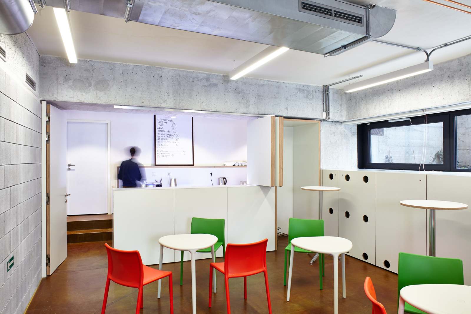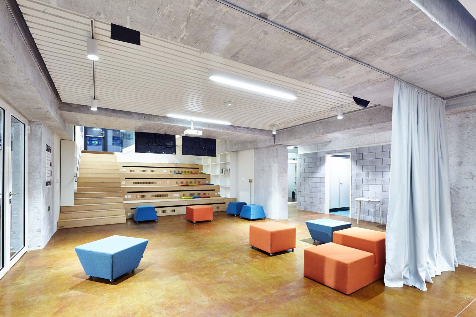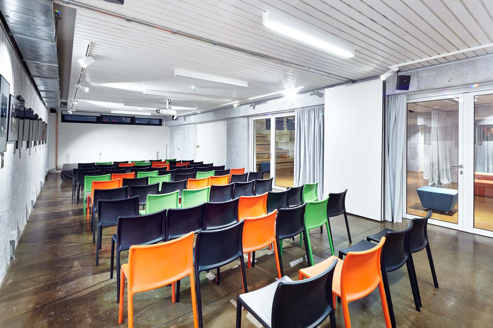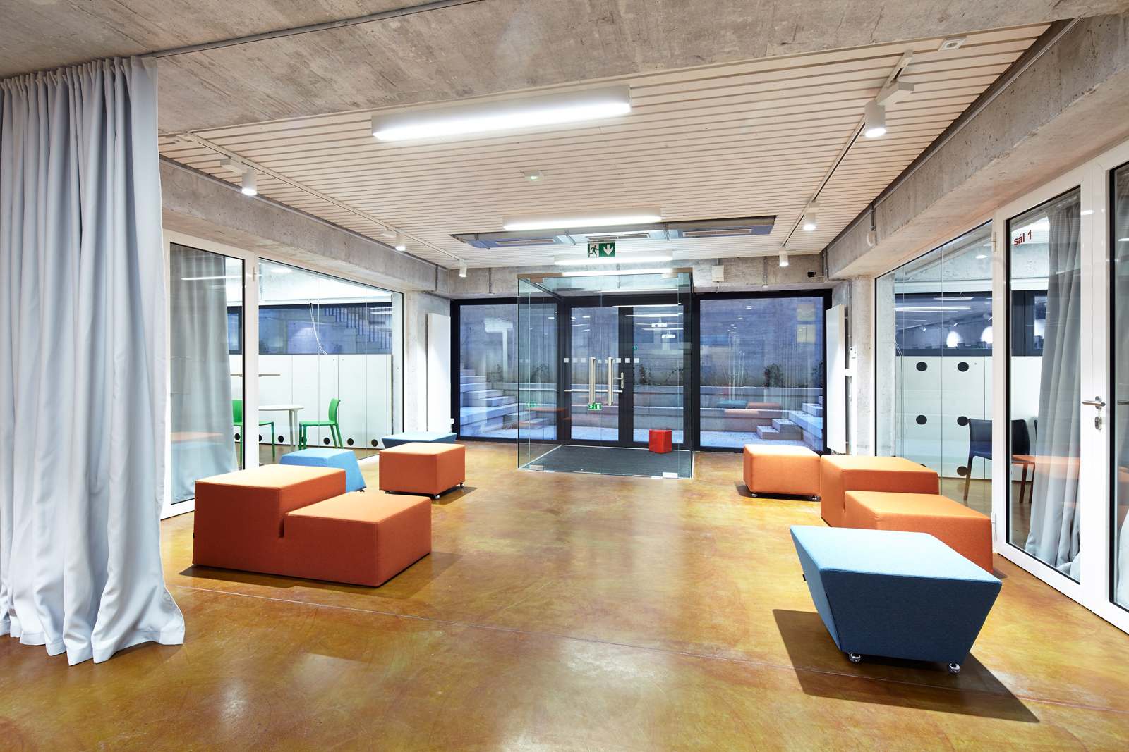 Díky závěsům se dají sály navzájem spojovat a oddělovat podle potřeby. Flexibilita a řada neformálních prostorů umožňuje uspořádat v kulturním centru řadu různých společenských akcí, od jednotlivých vystoupení, malých festivalů, dětských kroužků, seminářů, přes společenská setkání po burzy. Prostor je připraven pro fantazii provozovatele i uživatelů. Zázemí je řešeno s důrazem na jednoduchost a trvanlivost. S výjimkou kanceláře jsou ostatní místnosti technického charakteru. Kancelář je v těsné blízkosti zdvižné plošiny a umožňuje tak rychlé zásobování. Kancelář má část prostoru převýšenou až ke stropu přízemí a díky tomu jímá přirozené světlo. Na boku je převýšený regál přes obě podlaží. Maximalizuje se tak skladovací kapacita kanceláře a je umožněn vizuální kontakt s přízemím. Anglický dvorek obsahuje pouze prefabrikované betonové schodišťové a jevištní stupně a lavici v zadní části u stromu. Zeleň se v budoucnu rozroste a popne celou stěnu dvorku.
