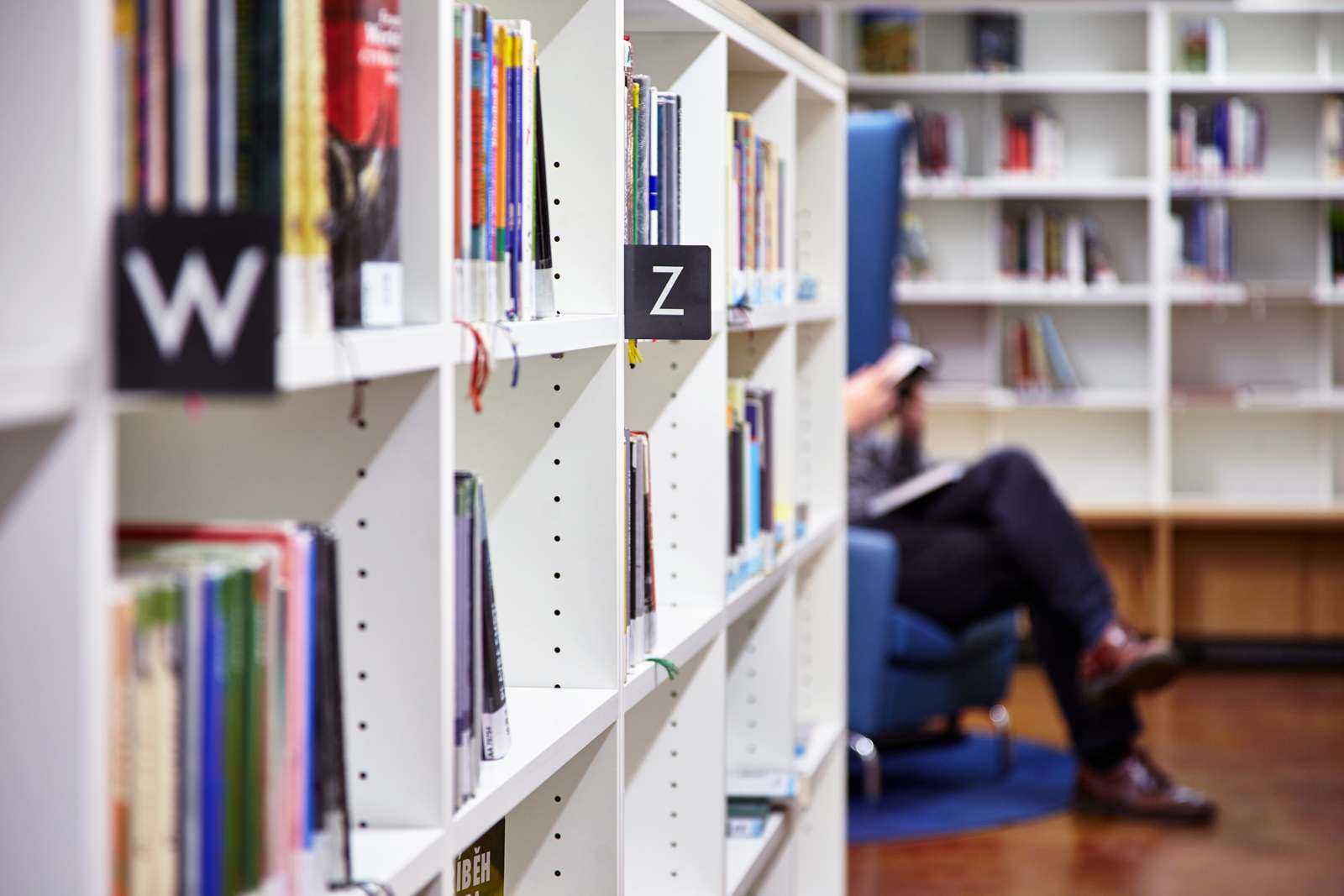 Hlavním tématem přízemí s volným výběrem jsou různé podoby sezení / pracovních míst návštěvníků a knihy v knižních regálech. Umístěním knihovních regálů jsou maximálně využity obvodové stěny. Vytváří se tak dojem místnosti plné a ohraničené knihami. Pro zvýšení účinku jsou regály s 6 policemi doplněny o jeden spodní regál, který je předsunutý a slouží jako stupátko, ale zároveň jako místo pro neformální sezení při prohlížení knih. Pro oddělení funkce stupátka a sezení slouží barevné polštářky. Policemi také zakrýváme rozvody vzduchotechniky, které vedou mezi suterénem a technickým mezipatrem nad přízemím. Jejich kryt tvoří tabule. V místech, kde by bylo využití vyšších polic provozně obtížné (dětské oddělení), jsou vyšší regály použity pro výstavní účely. Rozmístění regálů přirozeně vymezuje jednotlivé niky, určené svou atmosférou pro odlišné aktivity.