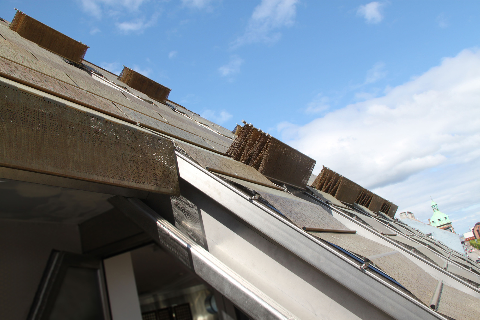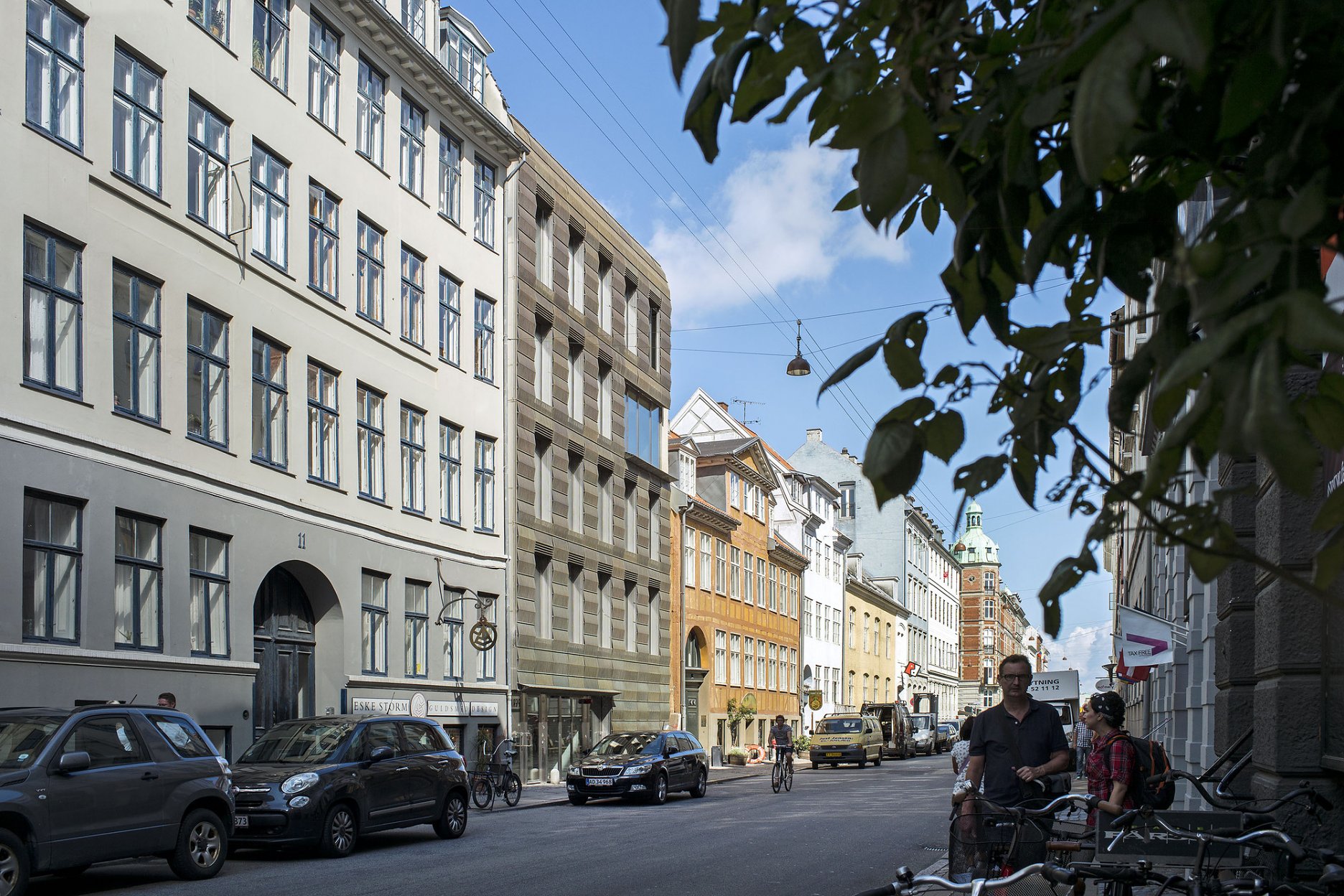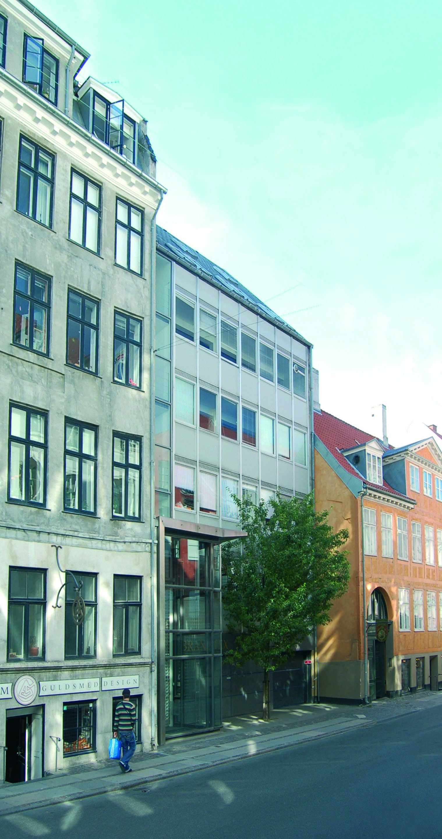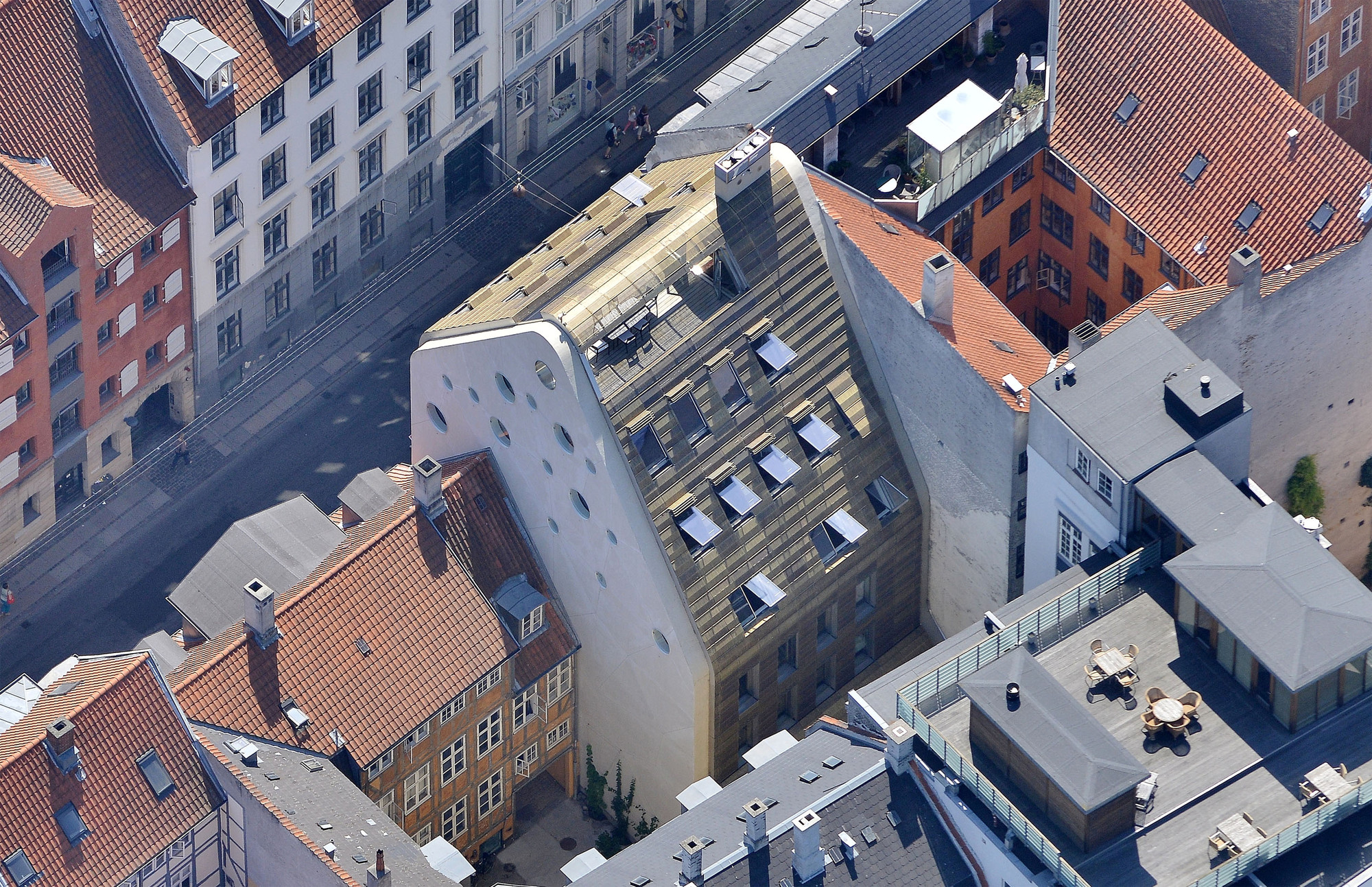 Typickým znakom historických budov v centre Kodane sú masívne štítové steny, ktoré kontrastujú s tektonikou fasády. V tomto prípade ich tvar rešpektuje manzardovú strechu susediaceho objektu. Steny sú perforované nepravidelne rozmiestnenými kruhovými otvormi.