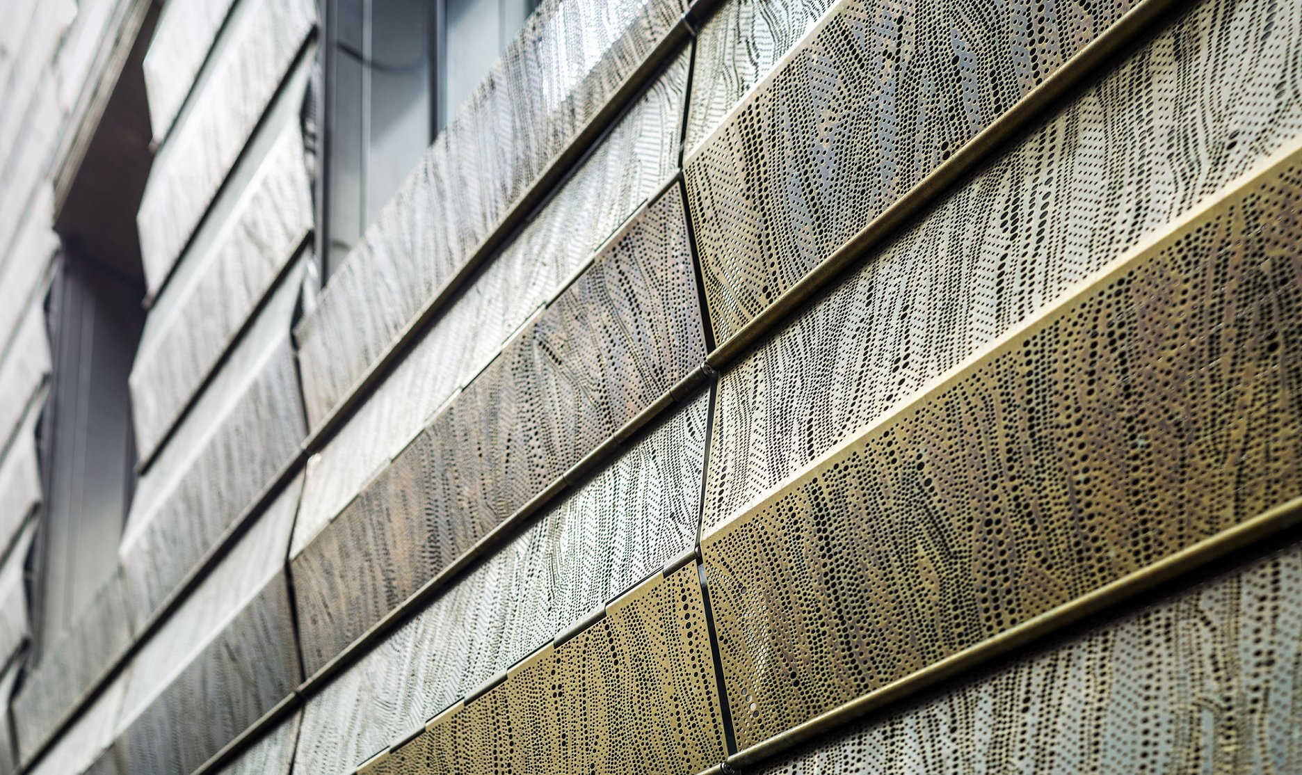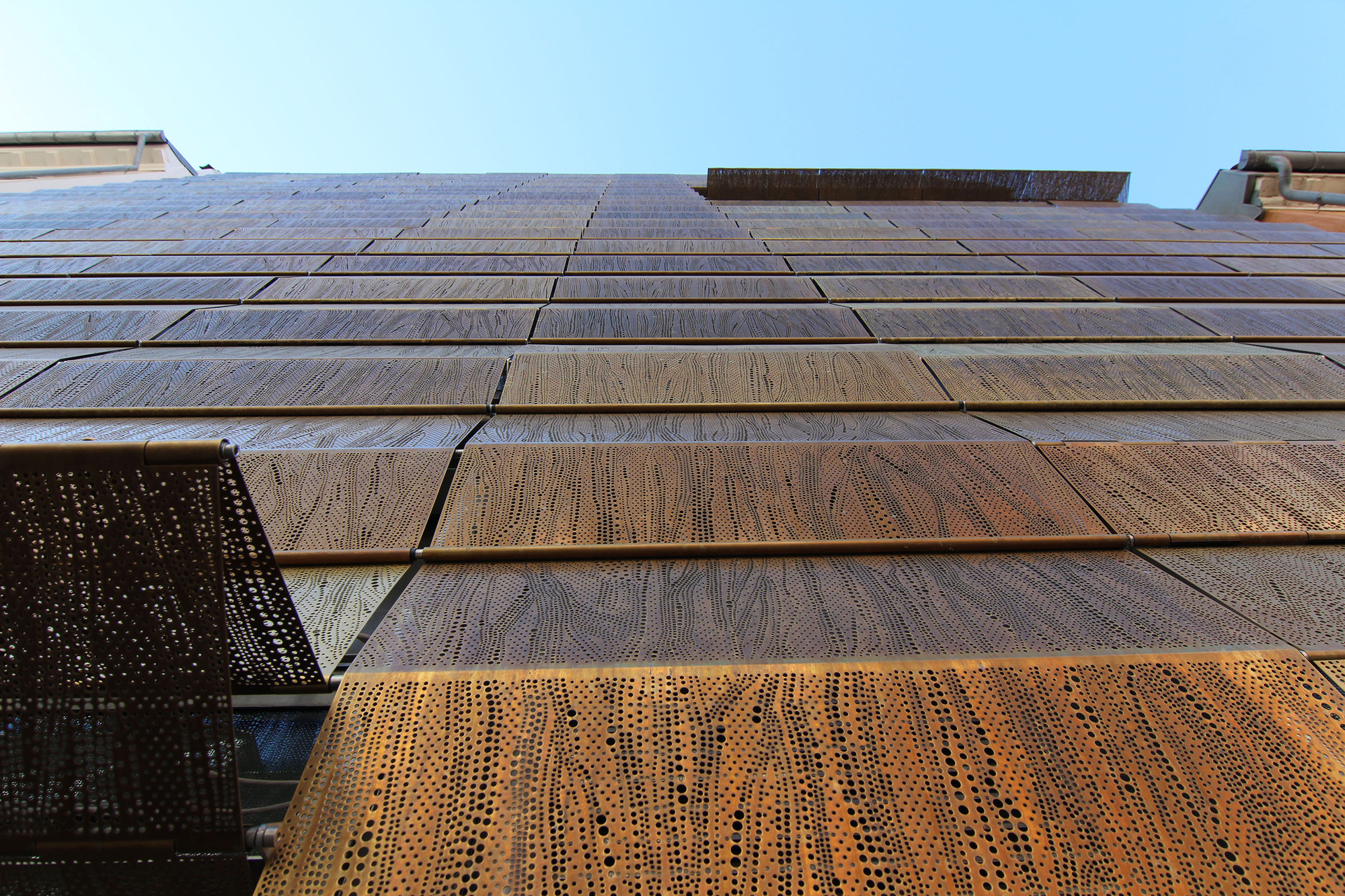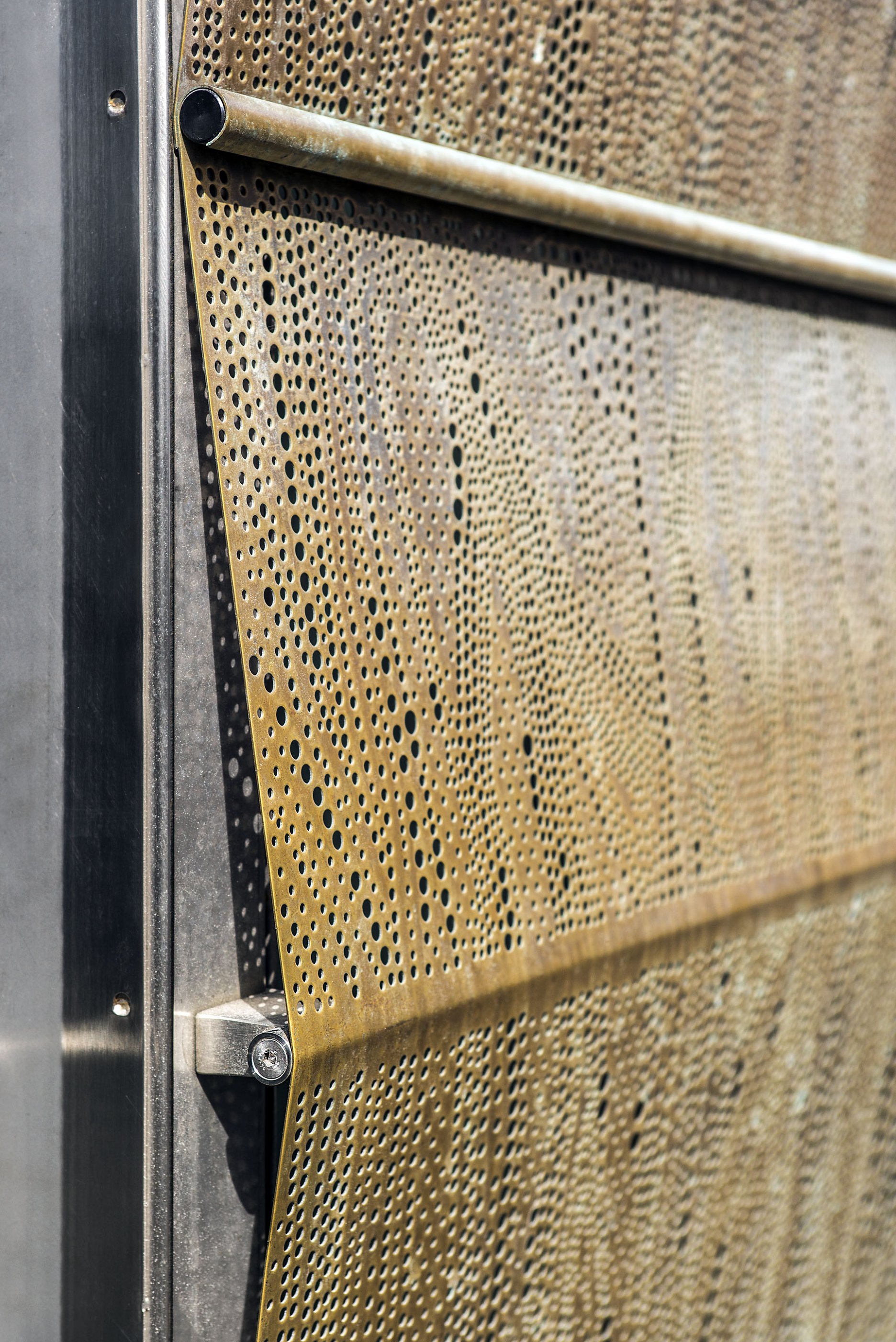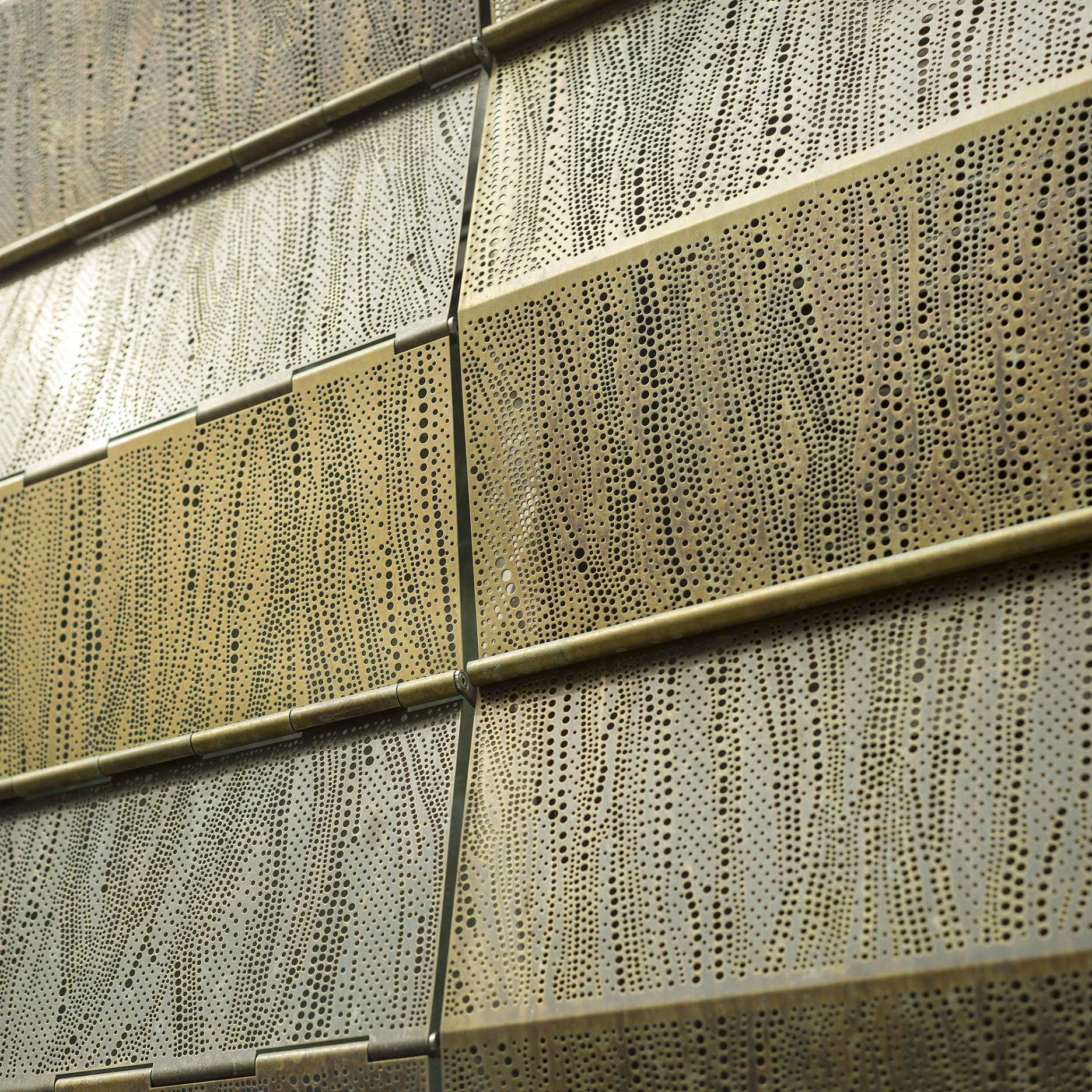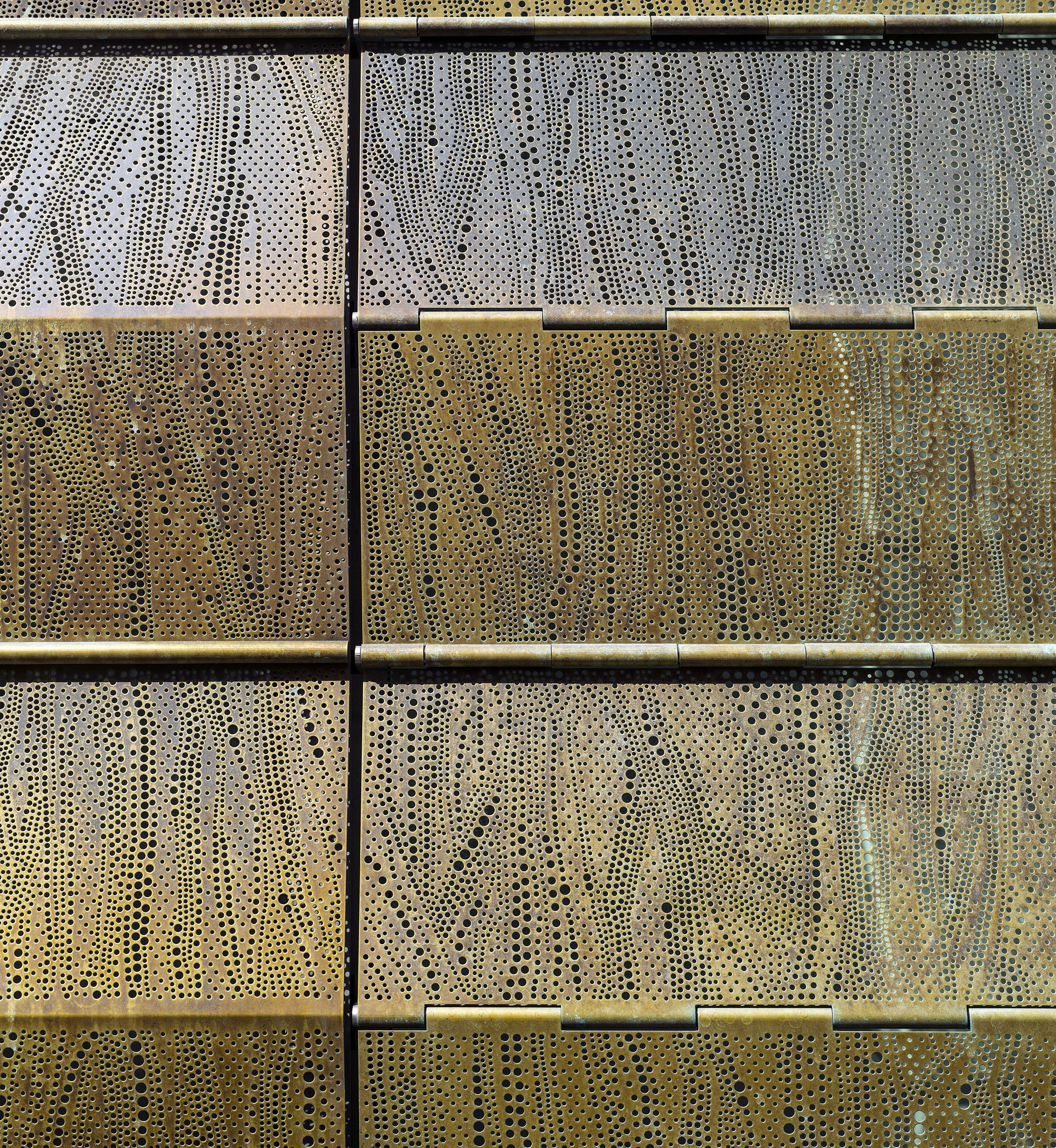 Poznávacím znakom budovy sa stal mosadzný plášť, ktorý je zavesený na fasáde. Slúži ako tienenie pre administratívnu a bytovú časť budovy aj ako bezpečnostná bariéra pre obchod.