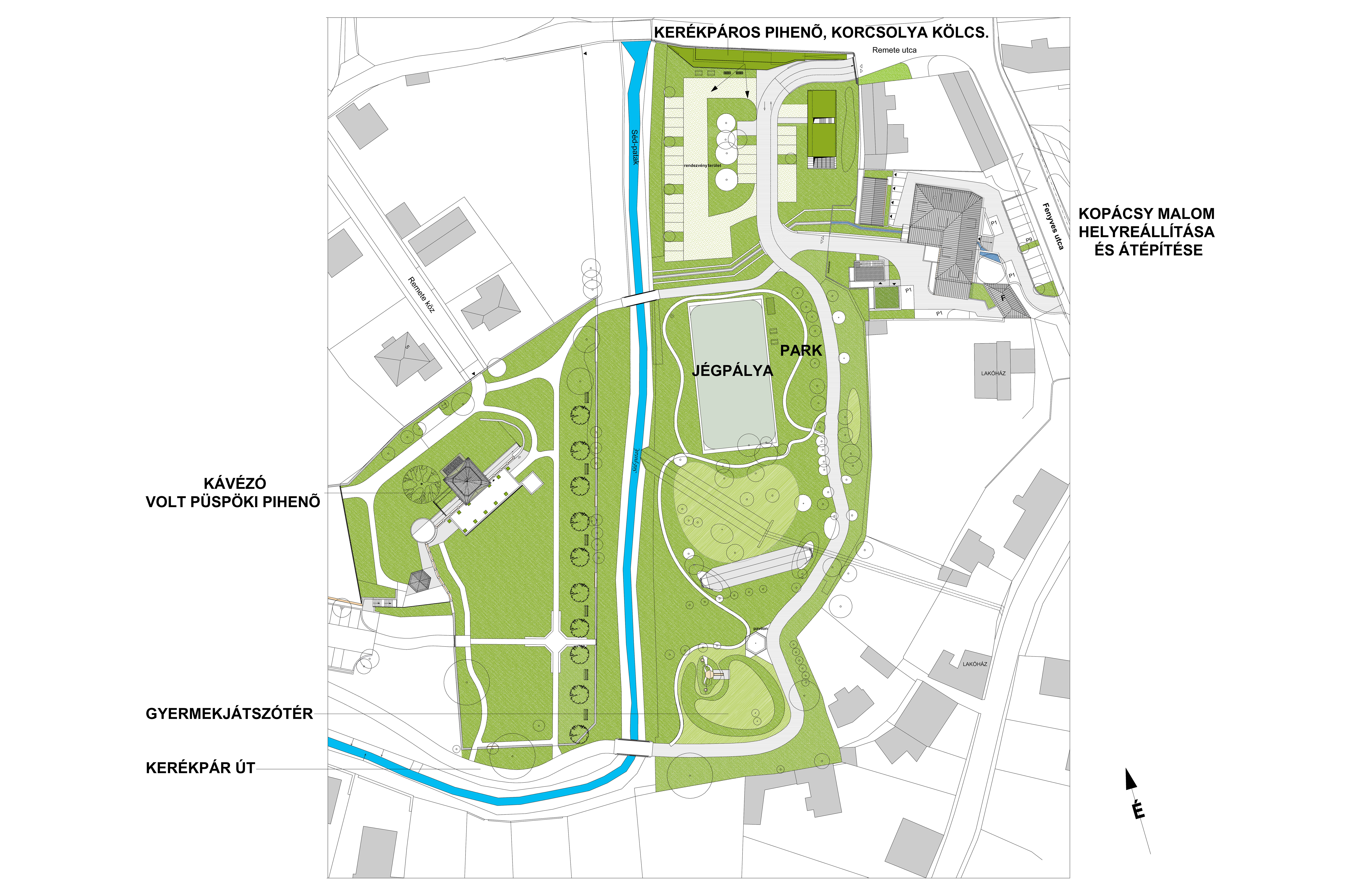 Objekt sa rozkladá v parku Pajtakert v údolí potoka Séd. Mestský park patril dlhé roky patril arcibiskupstvu, ale v roku 2011 kúpil park nový majitel’ (vlastník stavebnej firmy), pre ktorého architekti projektovali rekonštrukciu arcibiskupského pavilónu. Neškôr investor kúpil na opačnej strane parku historický mlyn Kopácsy a zadal ateliéru jeho úpravu a dostavbu.