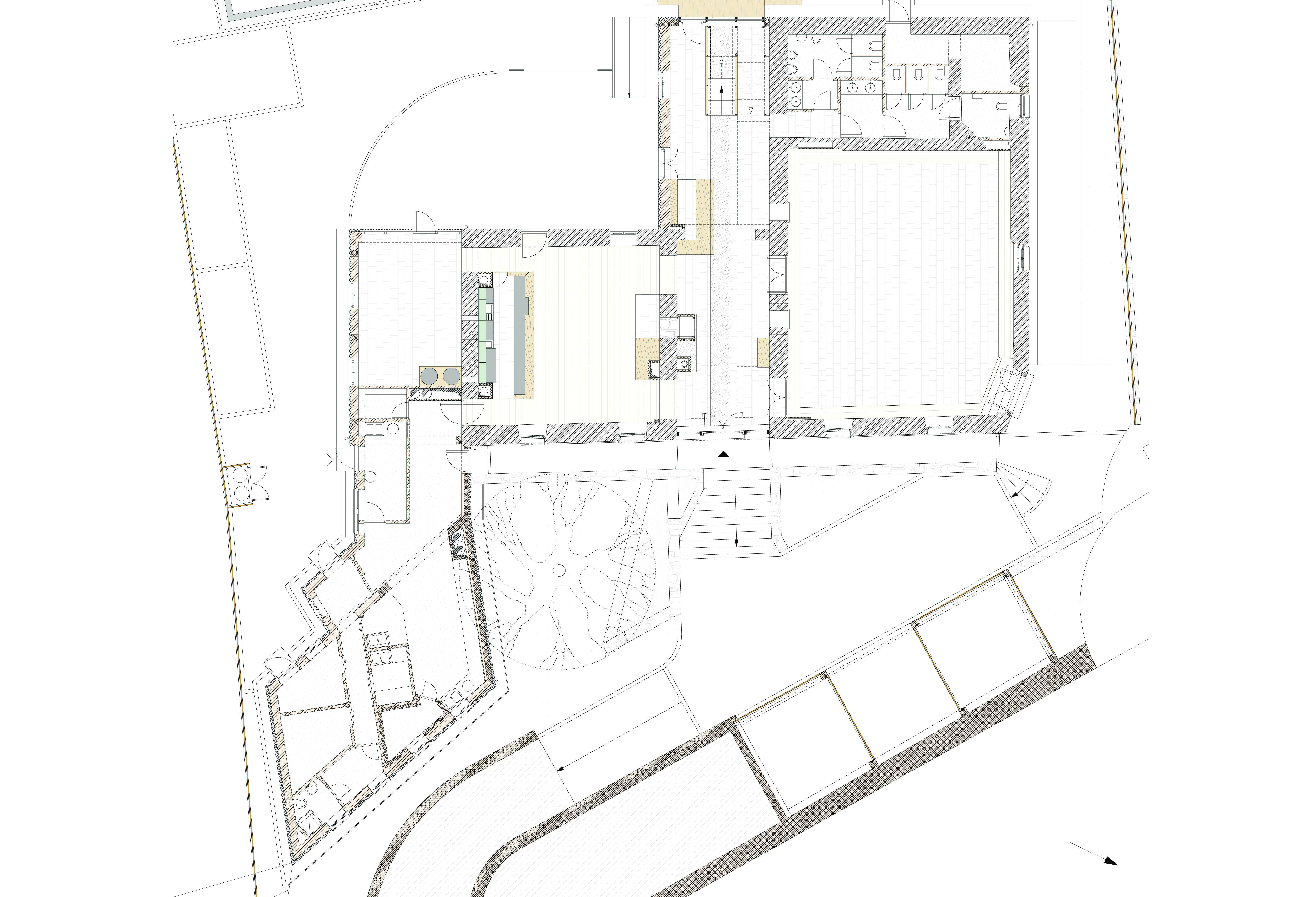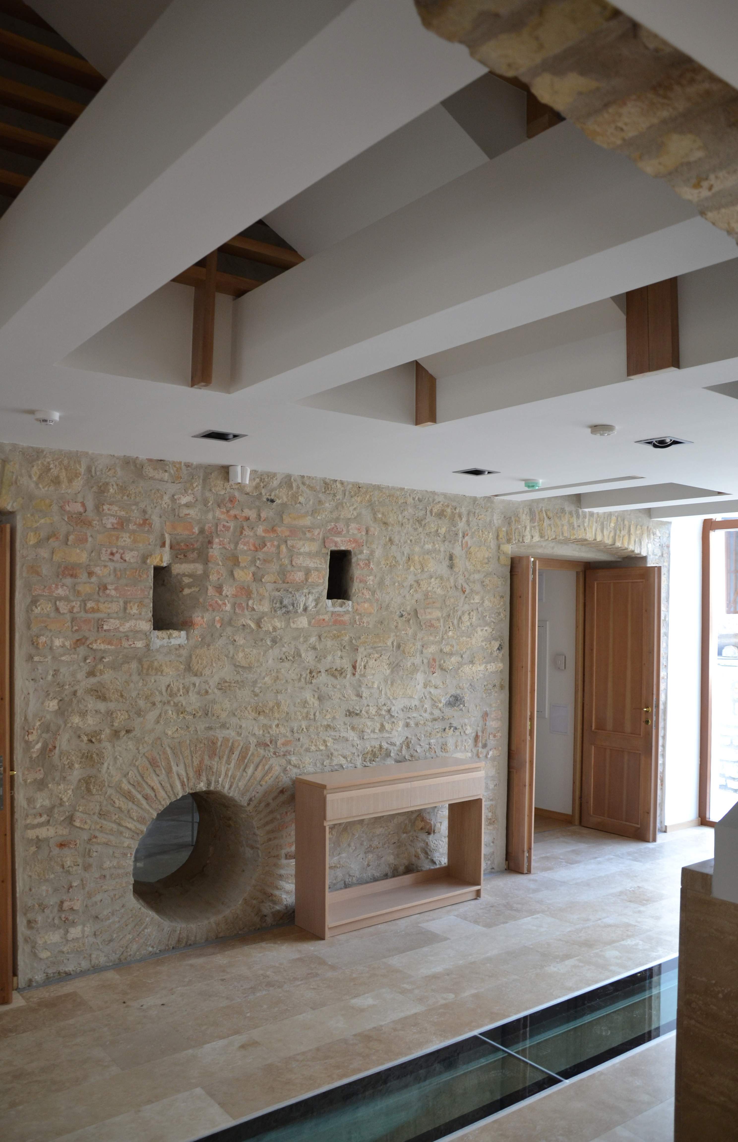 Vstupná hala bola vybudovaná v mieste pôvodného náhonu vody, ktorý symbolizuje sklo v dlažbe, pod ktorým tečie voda. Očistené sú pôvodné kamenné steny bez povrchovej úpravy s ponechanými miestami pre osy kolies.