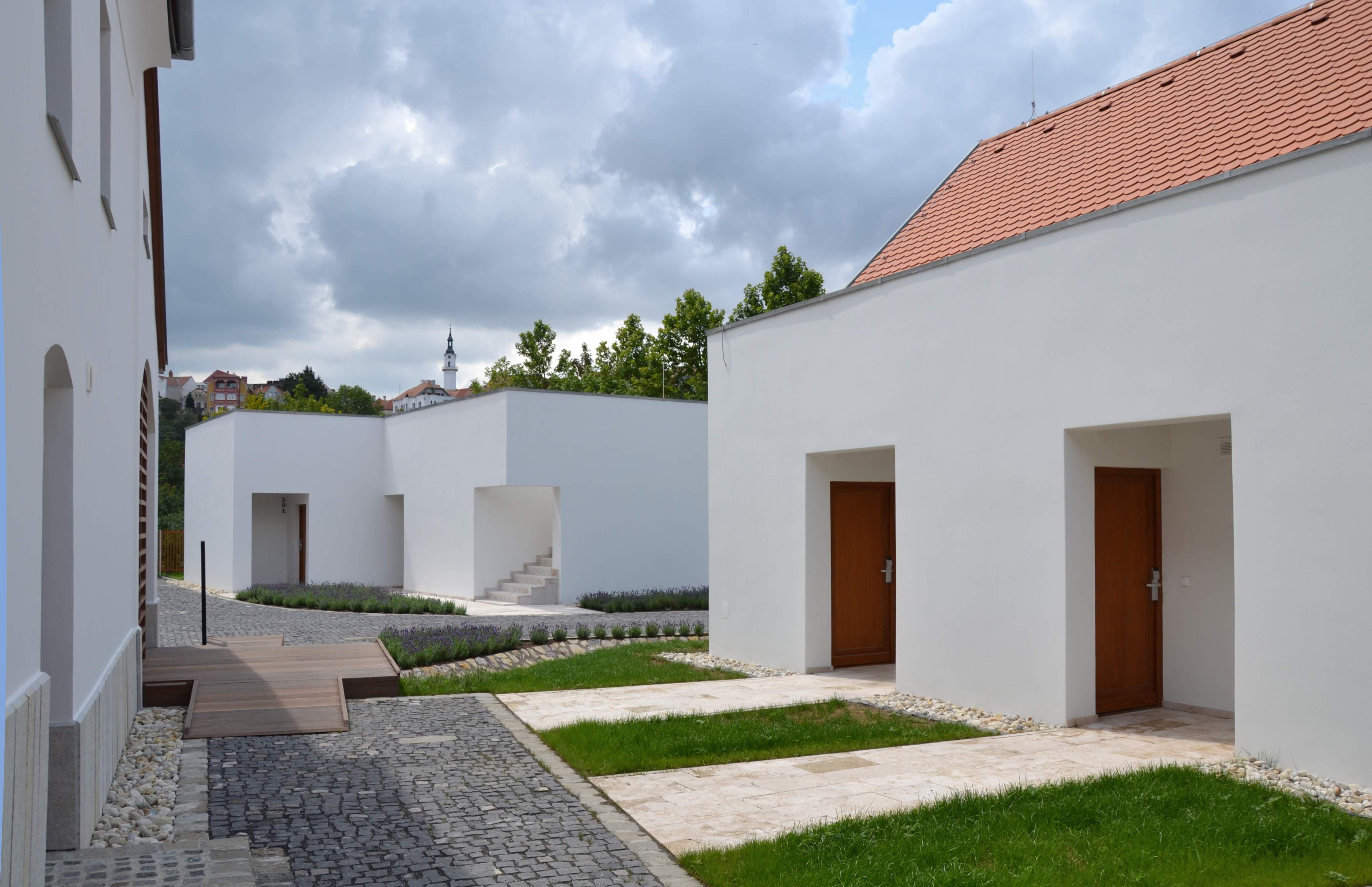 V dvoch nových prístavbách je šest’ nových apartmánov s terasami. Nechcú konkurovat’ starému mlynu, ale jednoduchosť’ou formovania hmotného riešenia a bielou farbou ho dotvárajú.