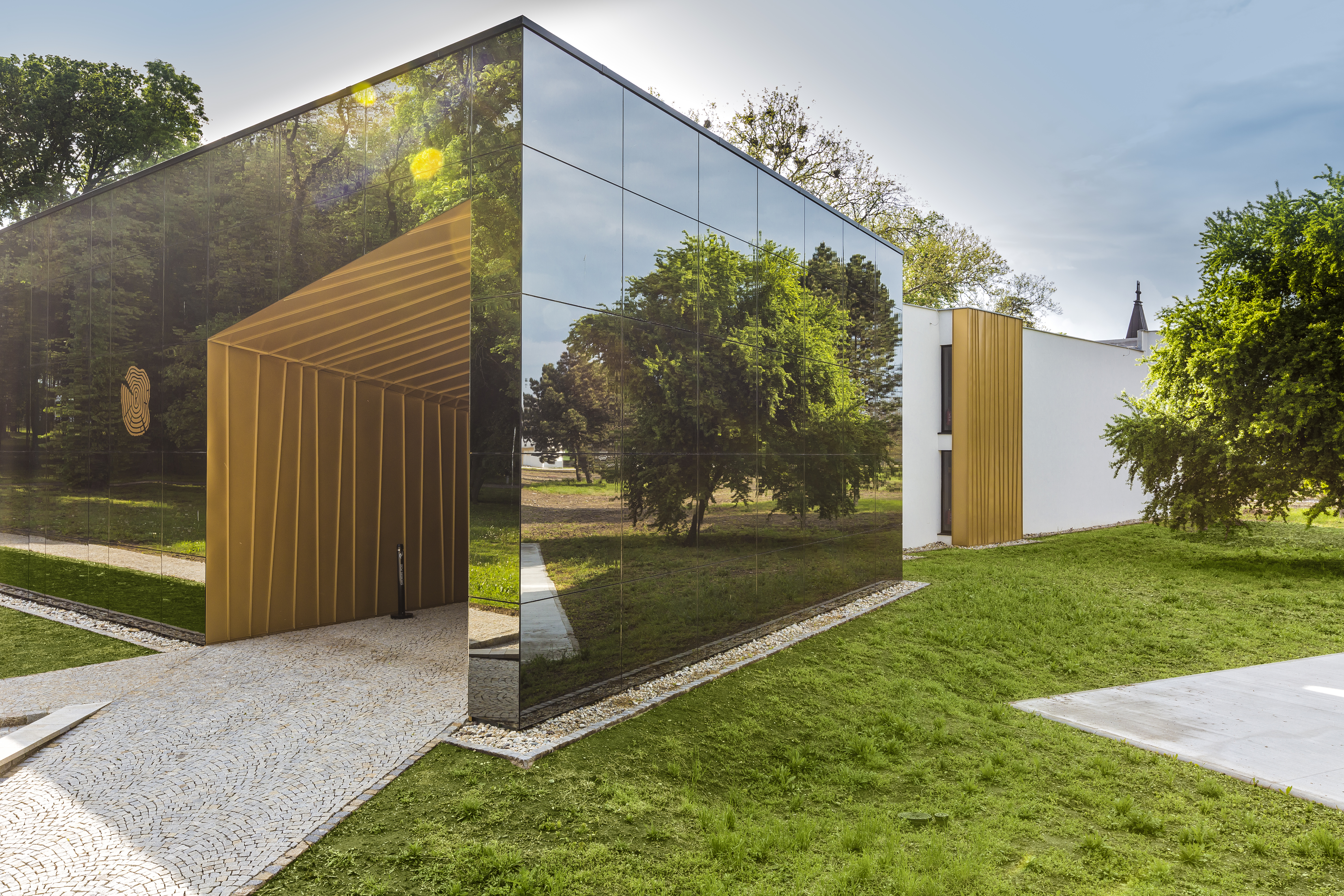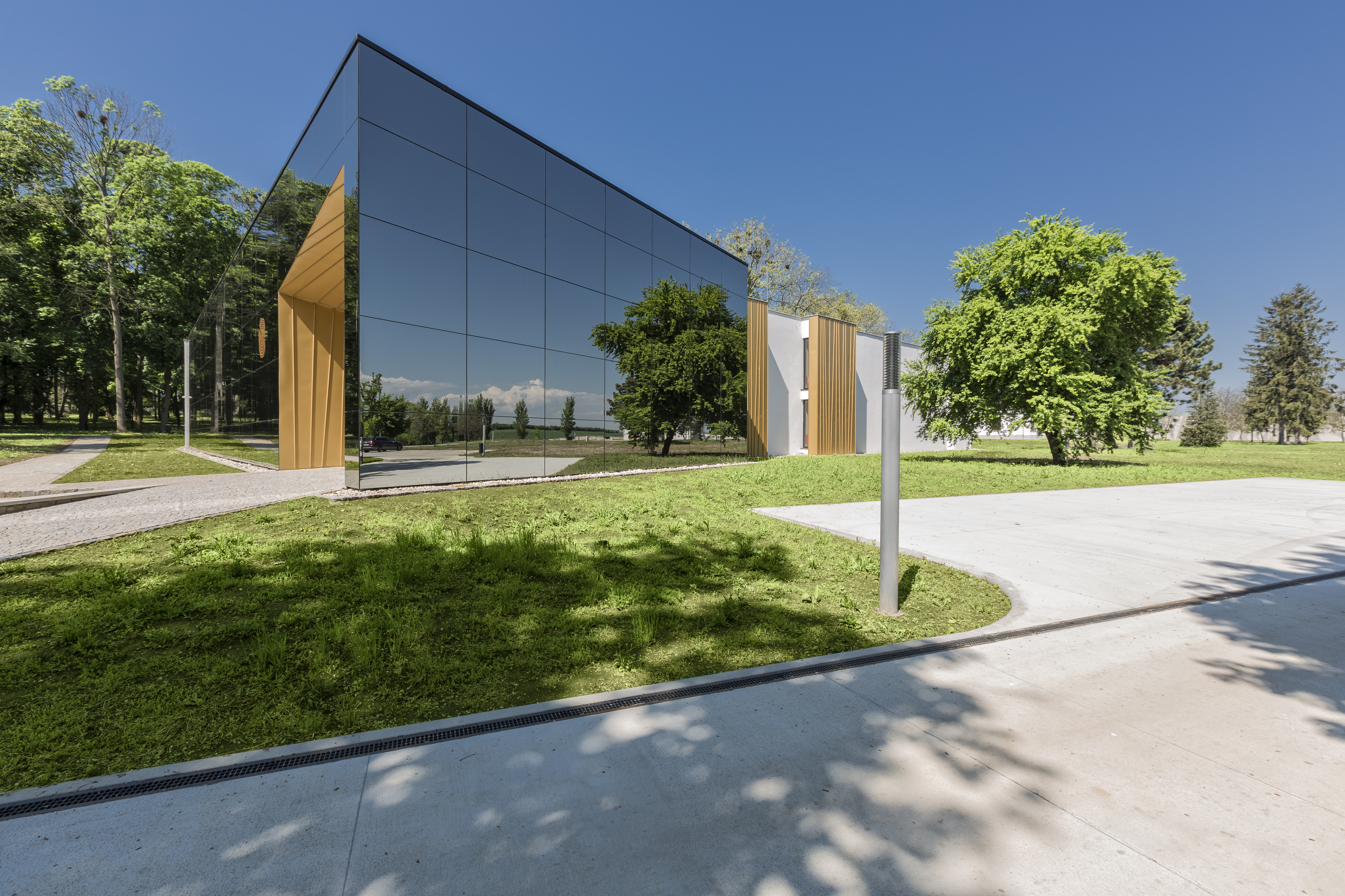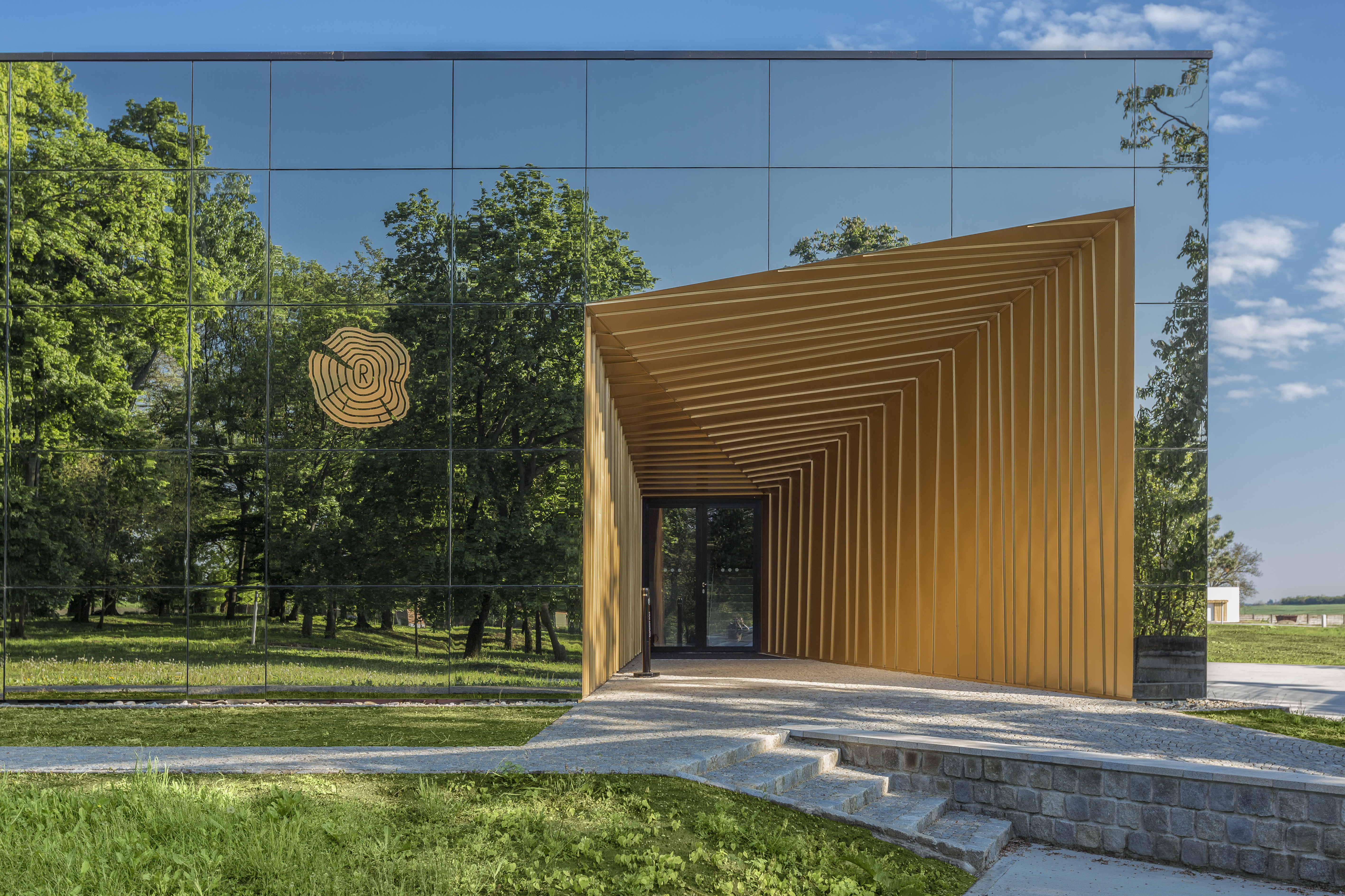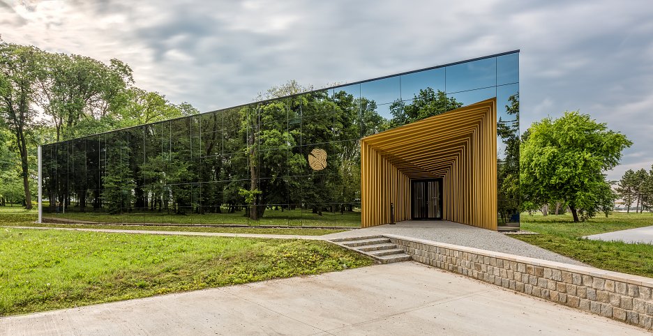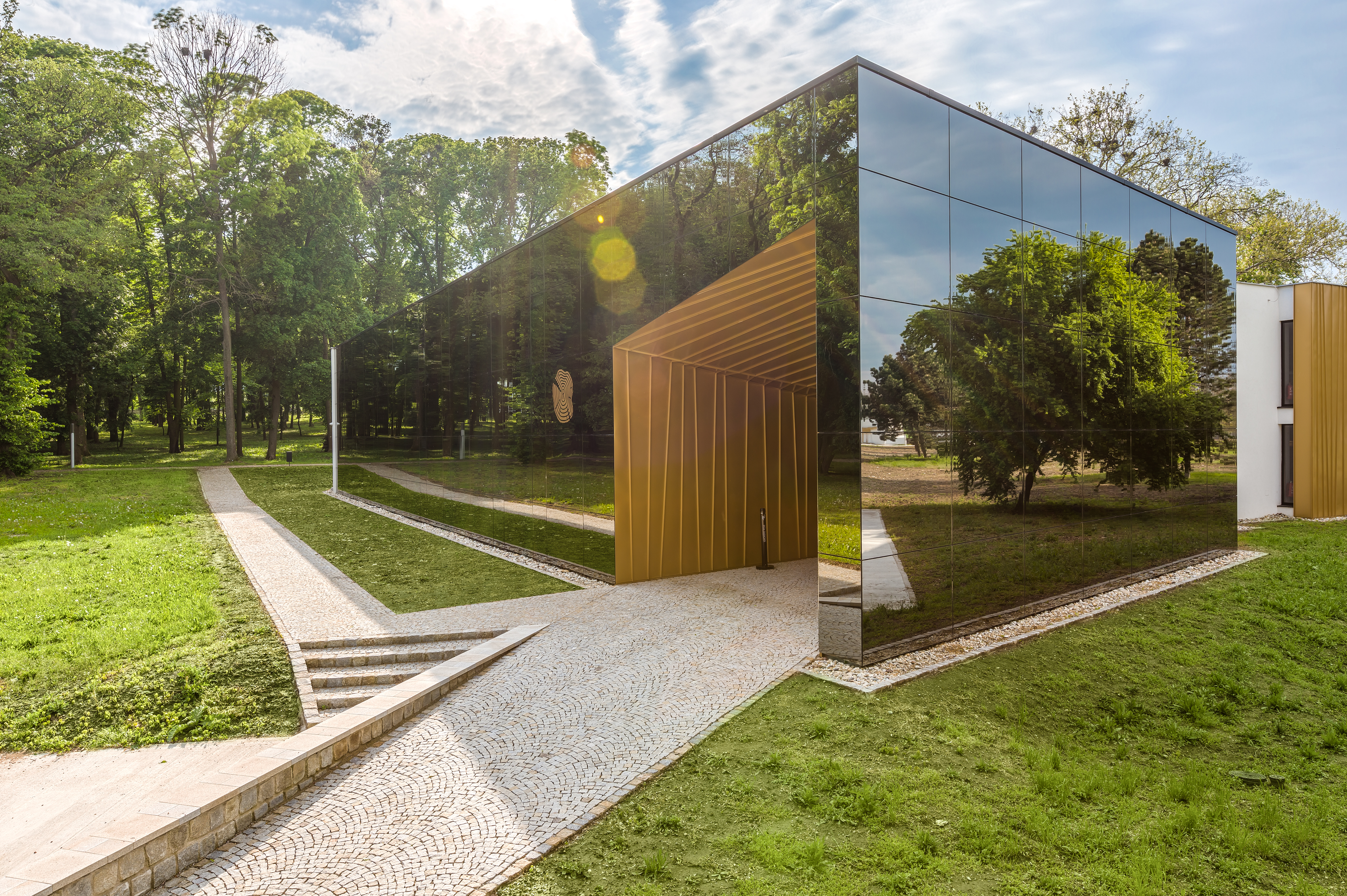 Poznávacím znakom stavby je zrkadlová stena, ktorá reflektuje okolitý lesopark a zapadá do koncepcie areálu. Výrazným prvkom fasády je vstupný lievik, ktorý je vytvorený zo zlatého plechu. Evokuje zlatú farbu bieleho vína charakteristickú pre túto vinohradnícku oblasť.