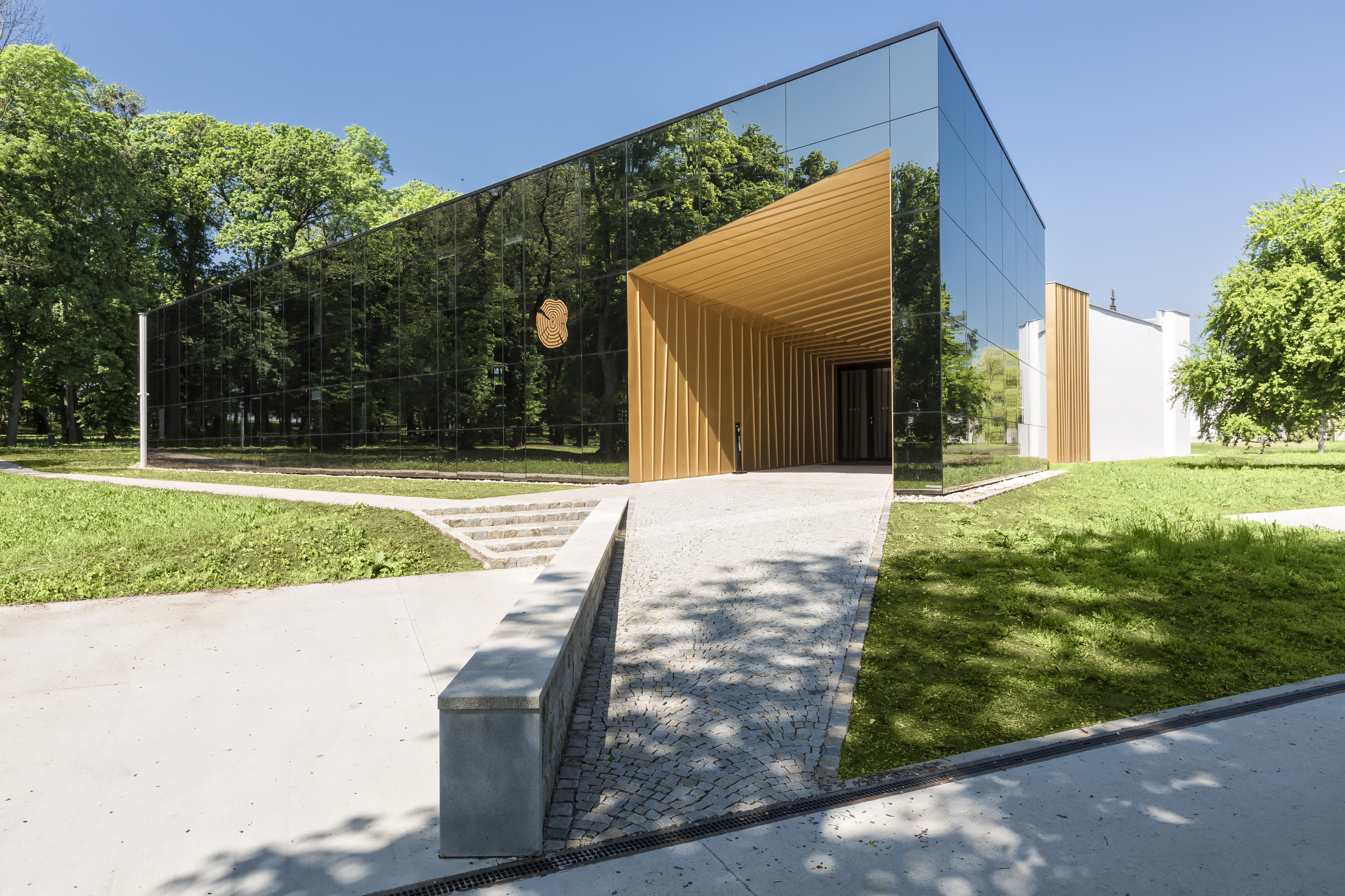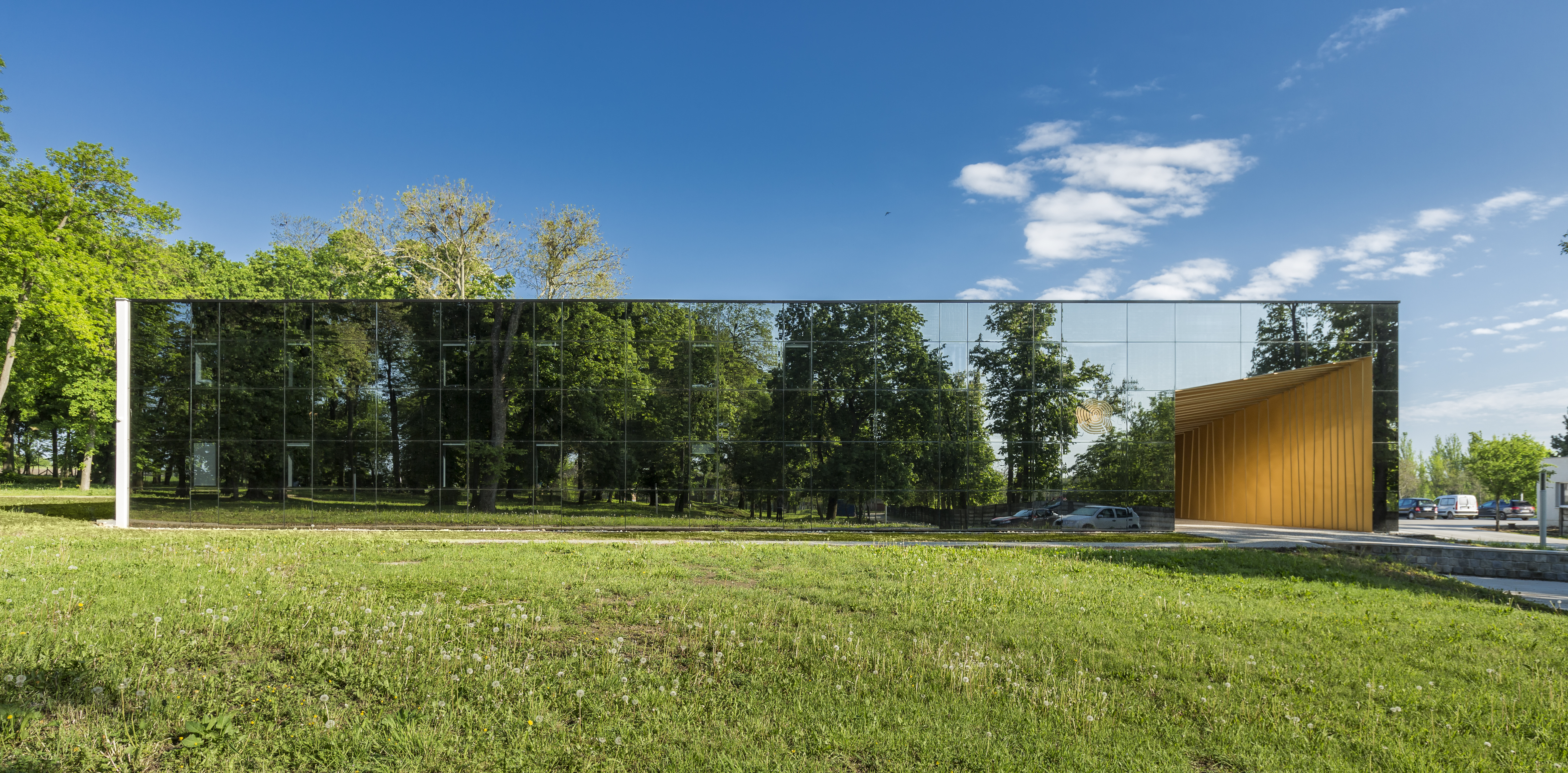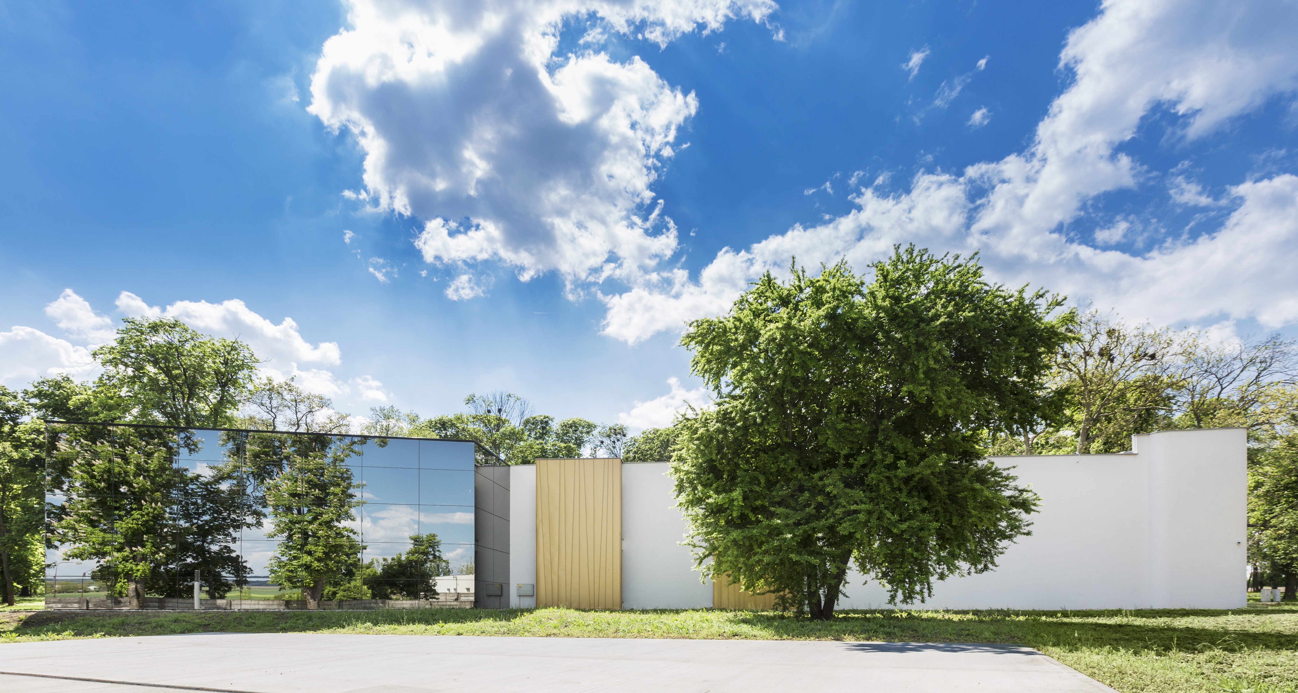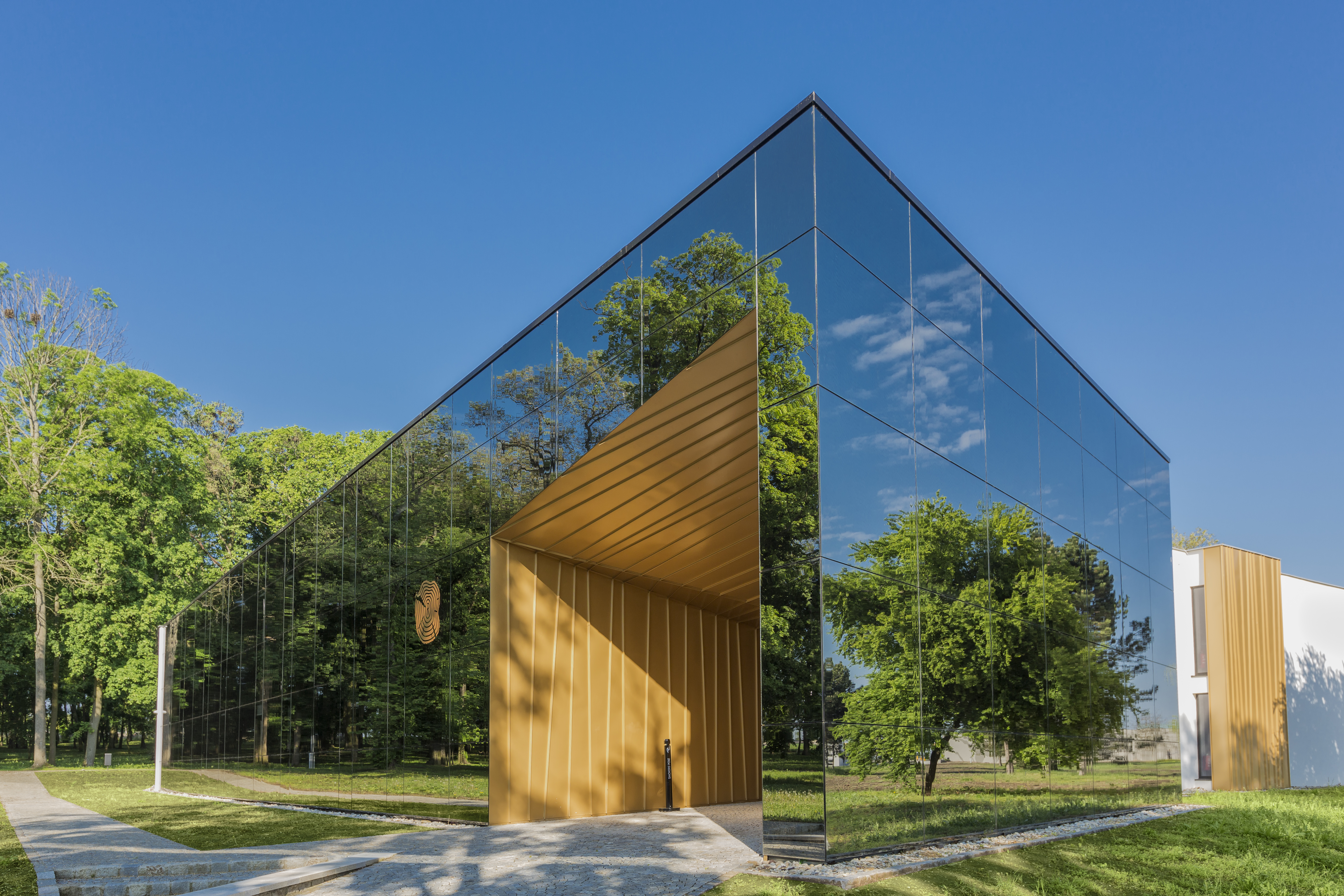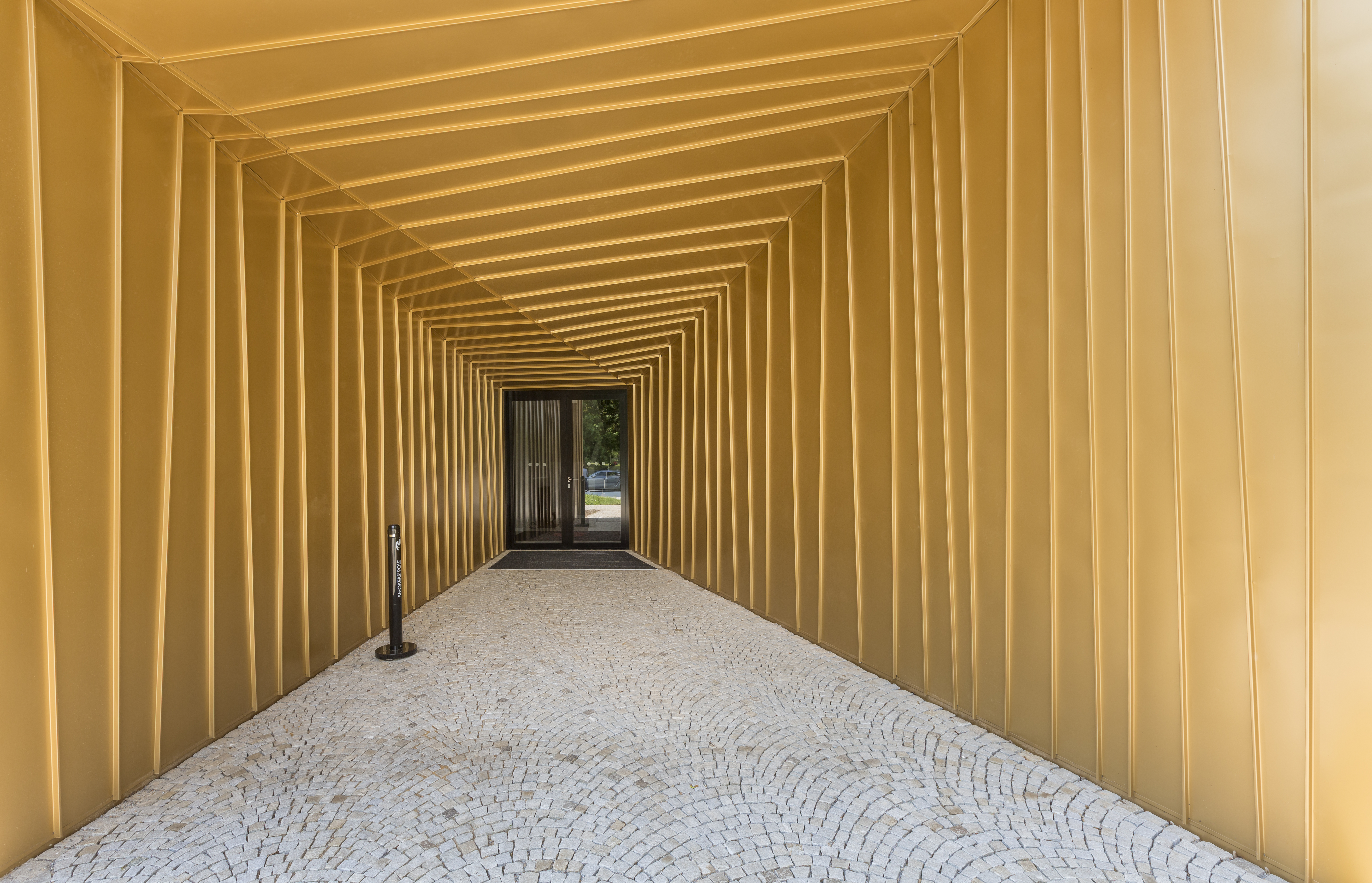 Poznávacím znakom stavby je zrkadlová stena, ktorá reflektuje okolitý lesopark a zapadá do koncepcie areálu. Výrazným prvkom fasády je vstupný lievik, ktorý je vytvorený zo zlatého plechu. Evokuje zlatú farbu bieleho vína charakteristickú pre túto vinohradnícku oblasť.