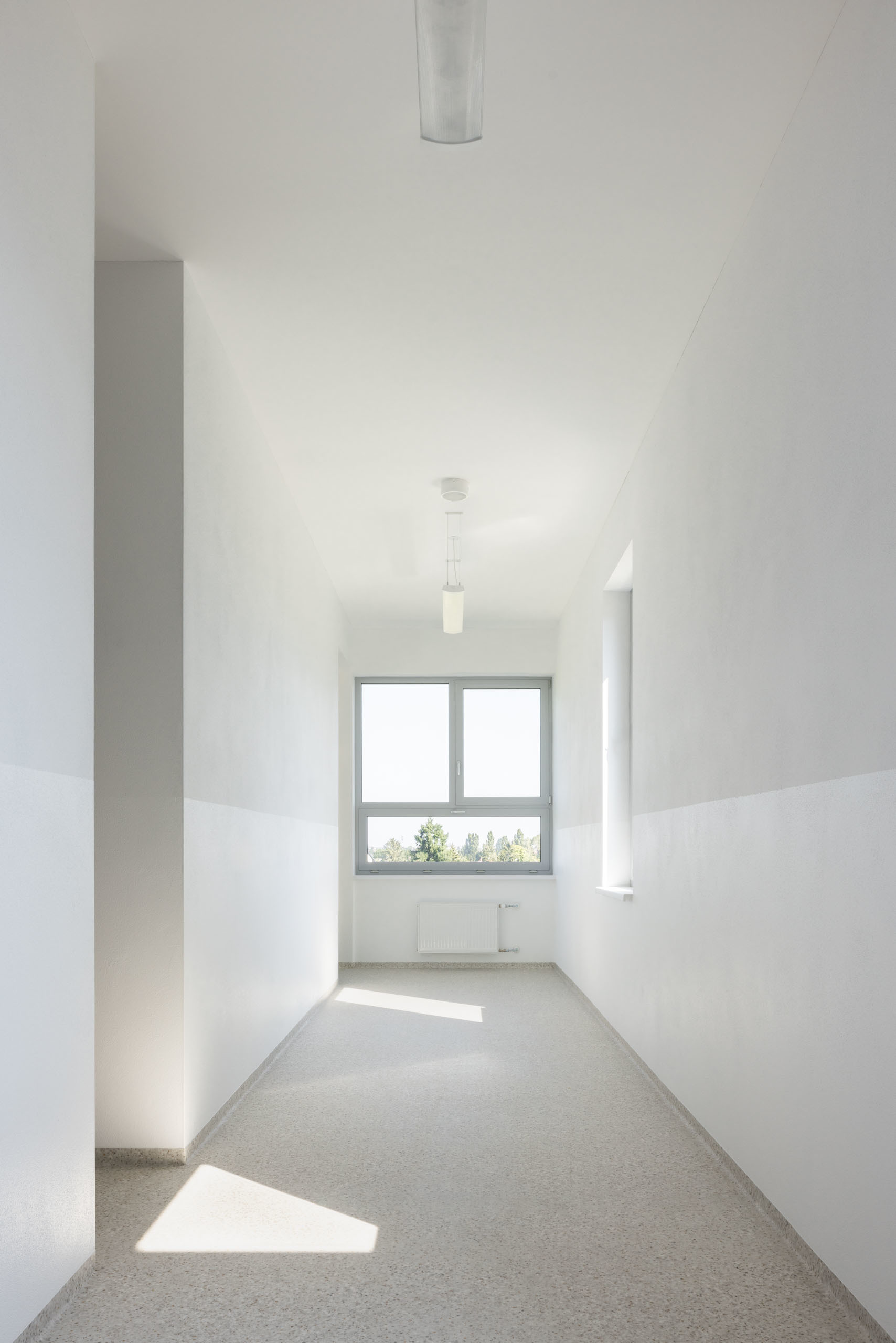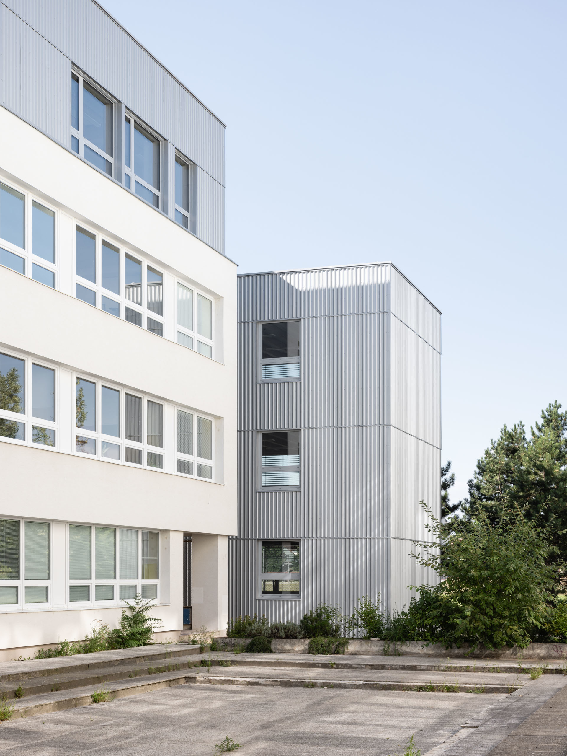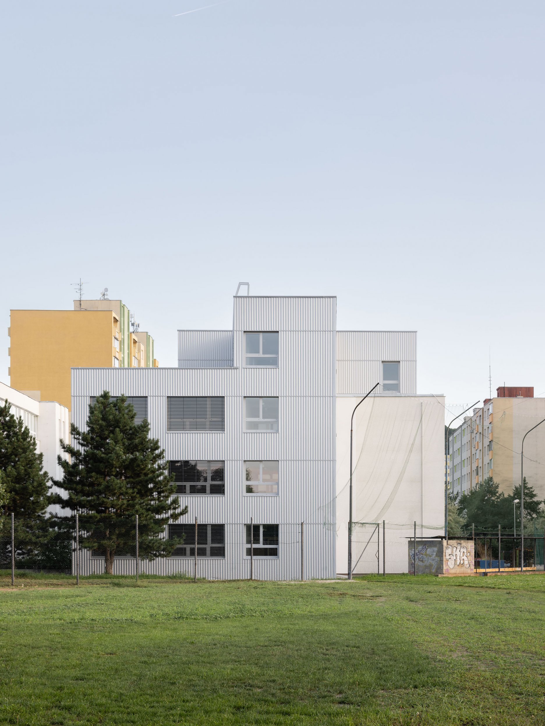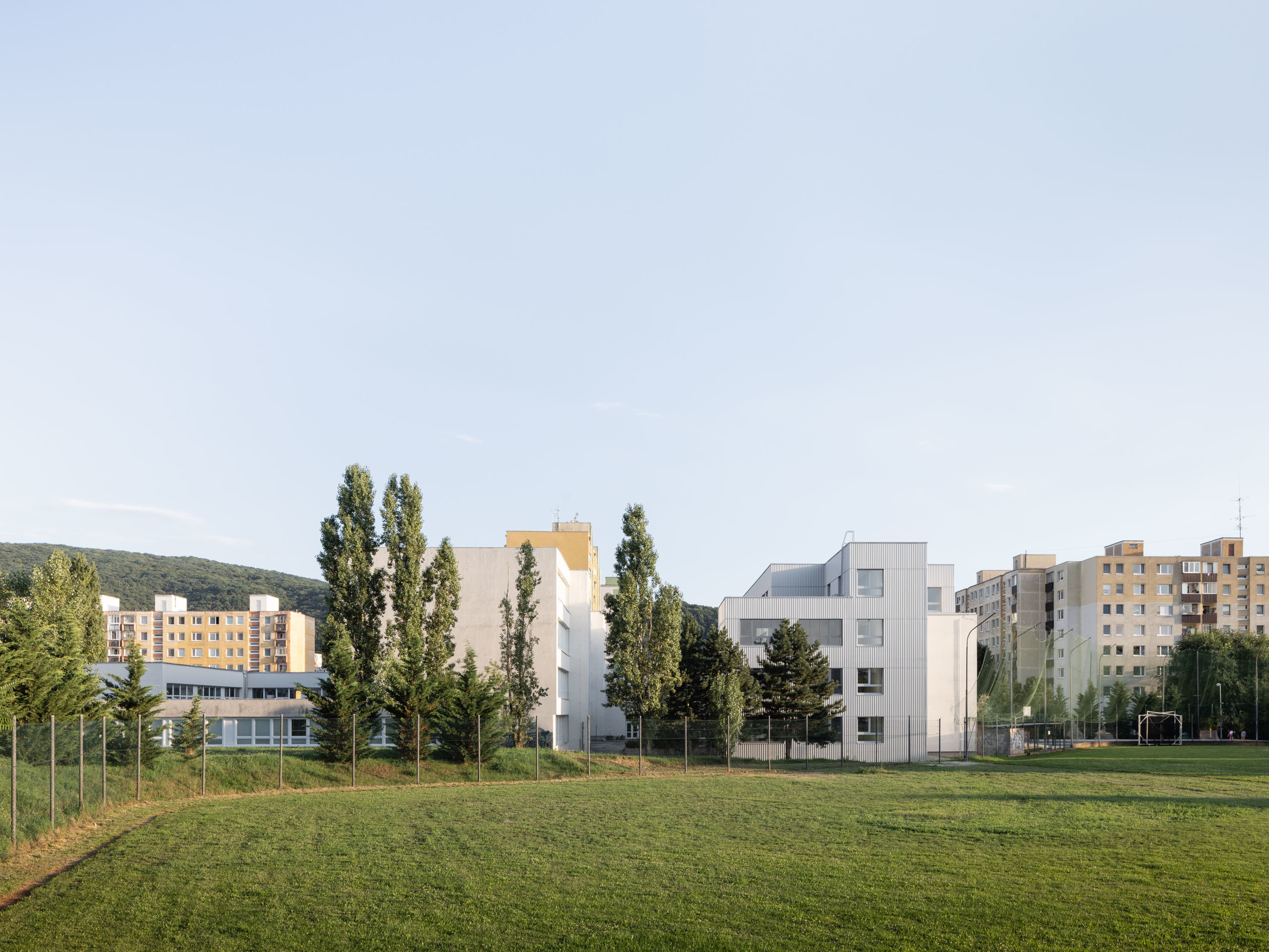 Forma dostavby je hmotovo odsadená od existujúceho objektu a spojená len nevyhnutnou prepojovacou chodbou, čo zachováva čitateľnosť pôvodnej figúry. Vizuálne a materiálovo je plocha dostavby a nadstavby odlíšená od pôvodných bielych, omietkových fasád prostredníctvom trapézového fasádneho plechu. Sivá farba plechu a jeho štruktúra vytvára jemný kontrast, ktorý je jasne čitateľný po vizuálnej aj kompozičnej stránke.