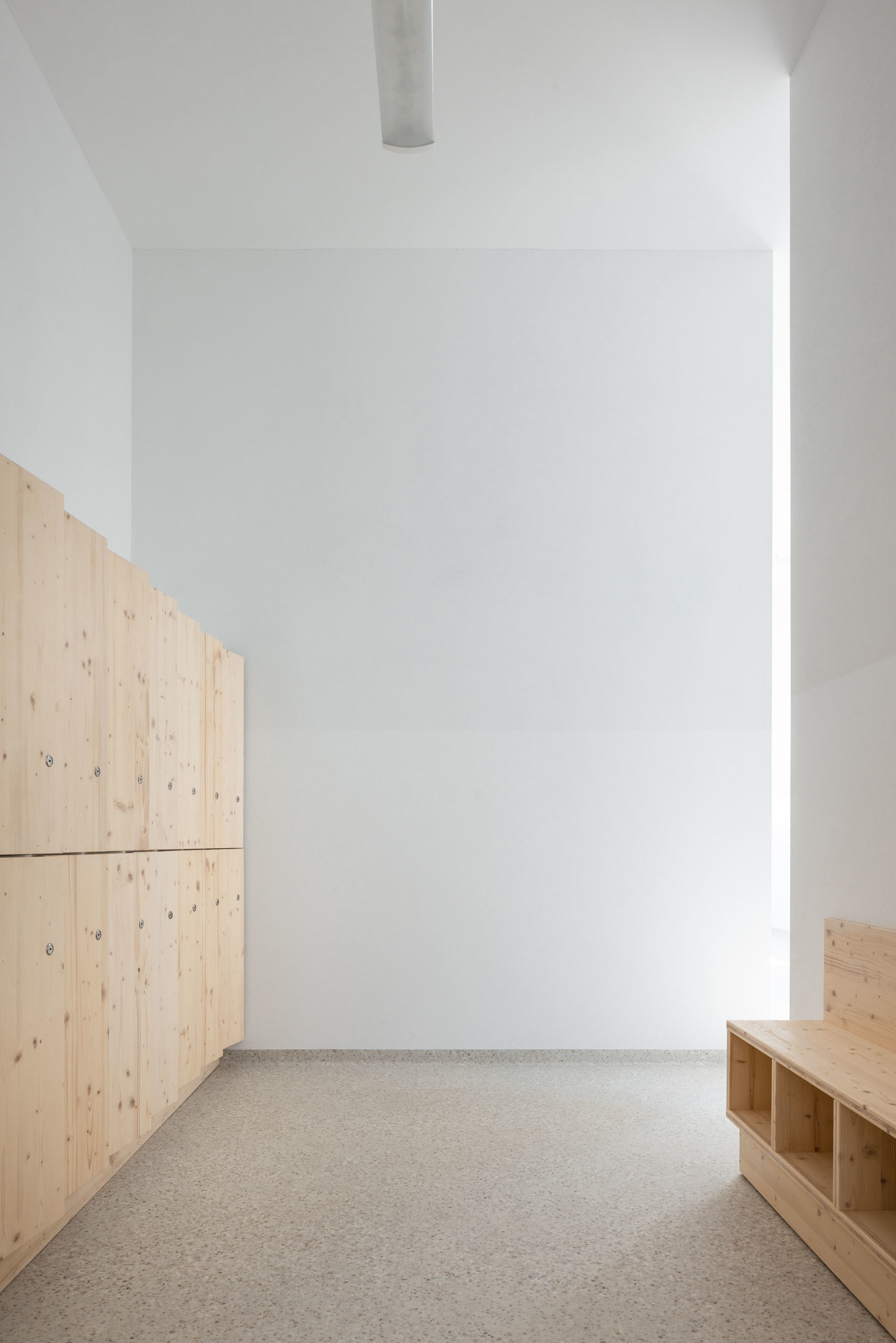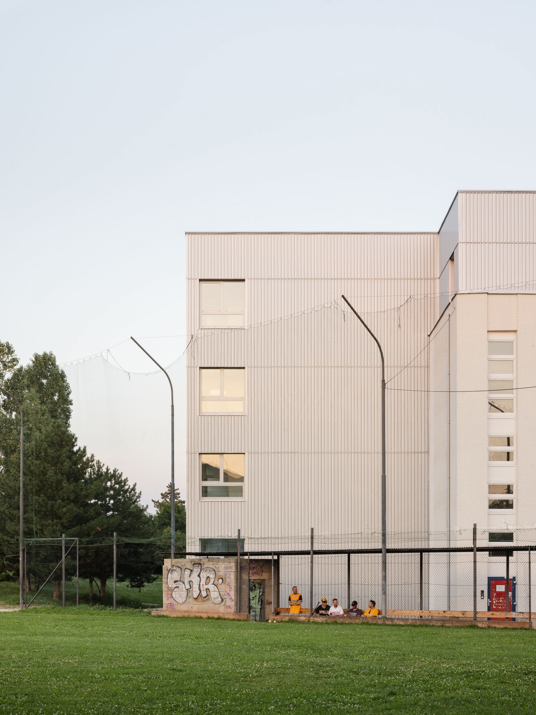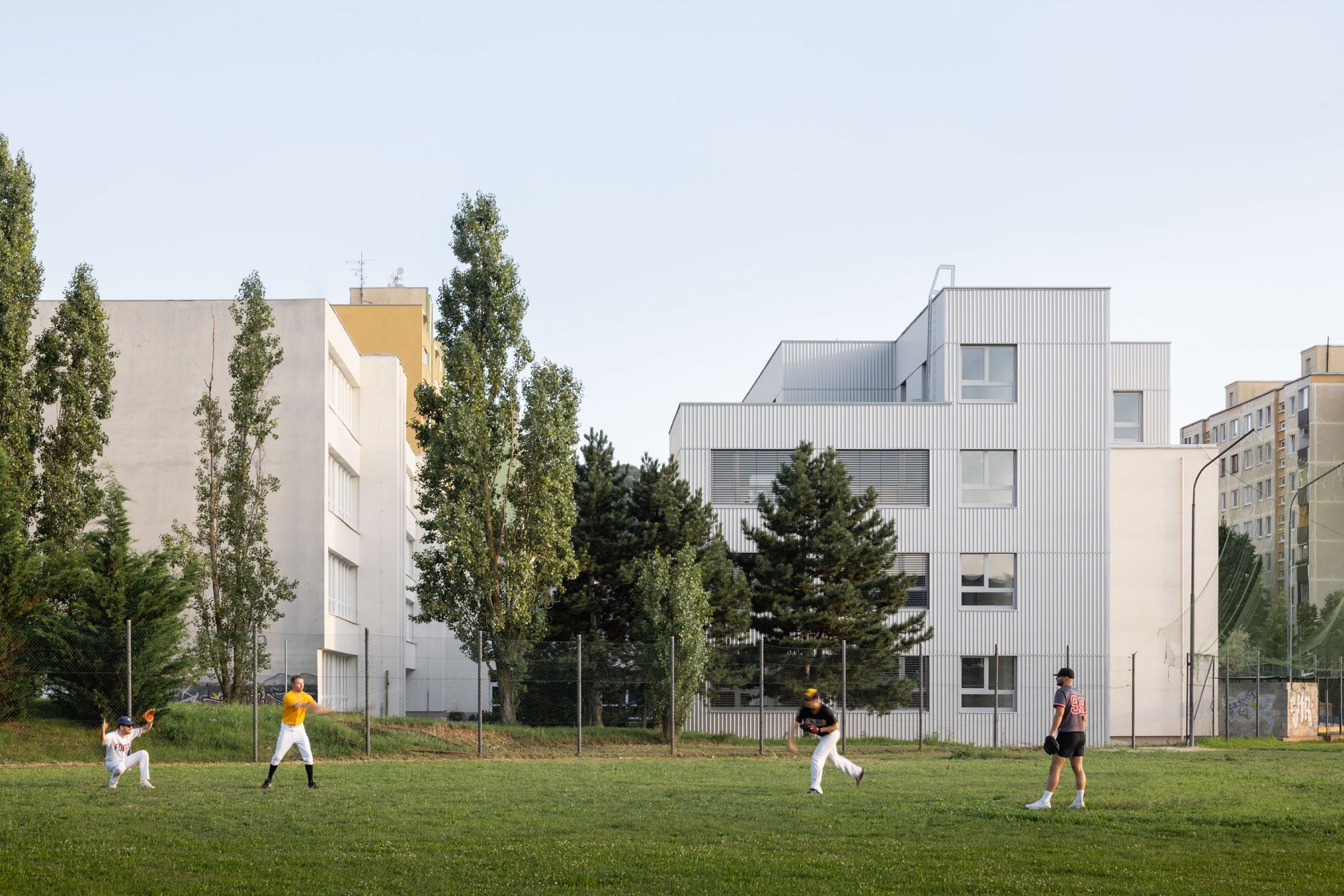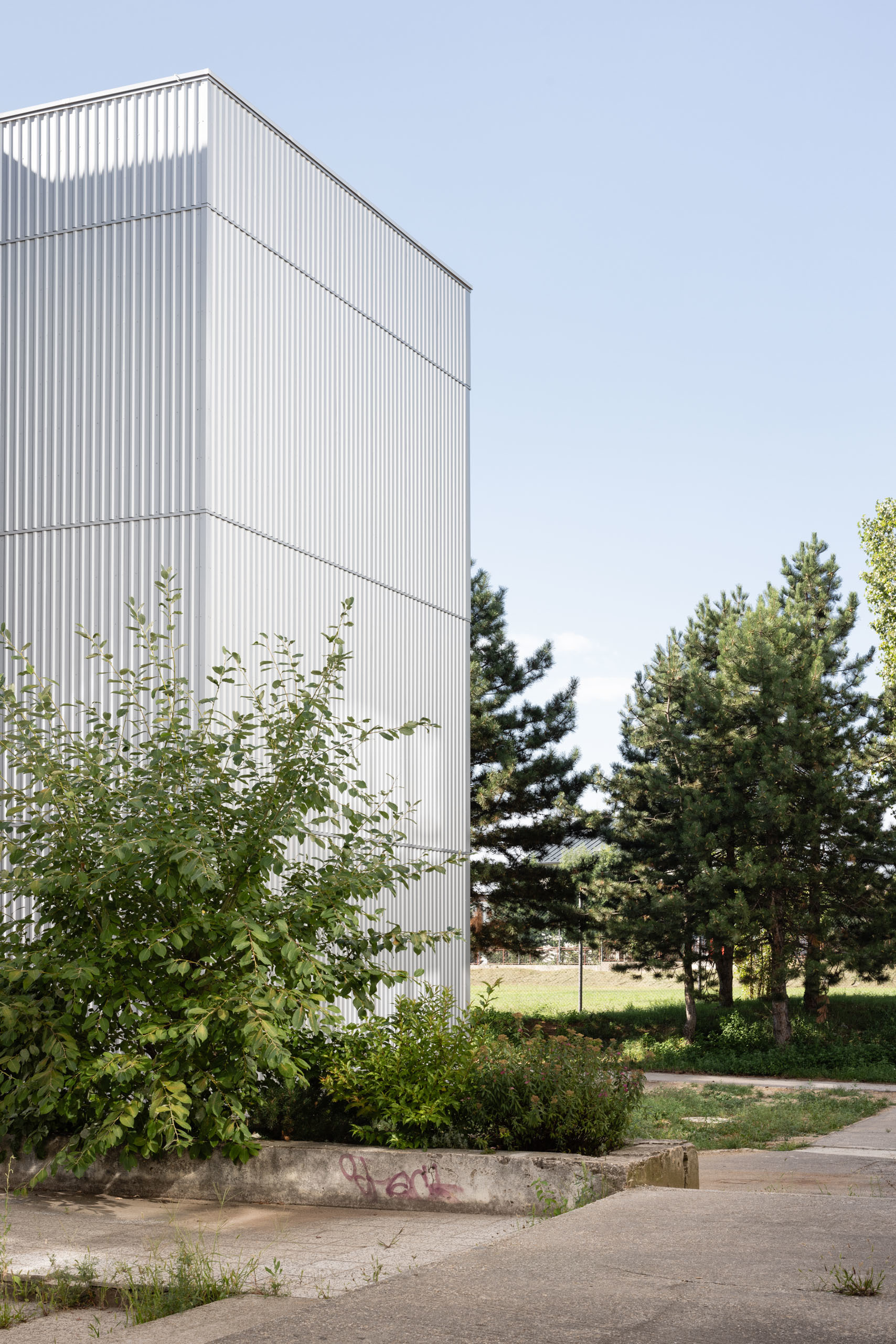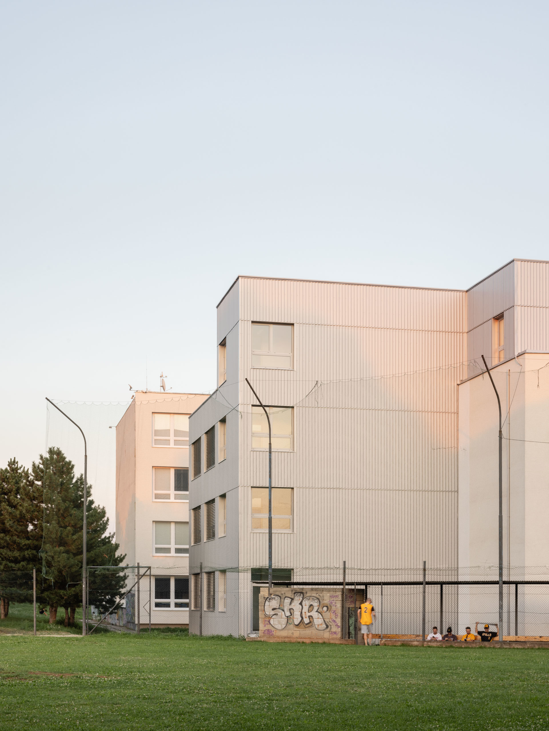 Forma dostavby je hmotovo odsadená od existujúceho objektu a spojená len nevyhnutnou prepojovacou chodbou, čo zachováva čitateľnosť pôvodnej figúry. Vizuálne a materiálovo je plocha dostavby a nadstavby odlíšená od pôvodných bielych, omietkových fasád prostredníctvom trapézového fasádneho plechu. Sivá farba plechu a jeho štruktúra vytvára jemný kontrast, ktorý je jasne čitateľný po vizuálnej aj kompozičnej stránke.