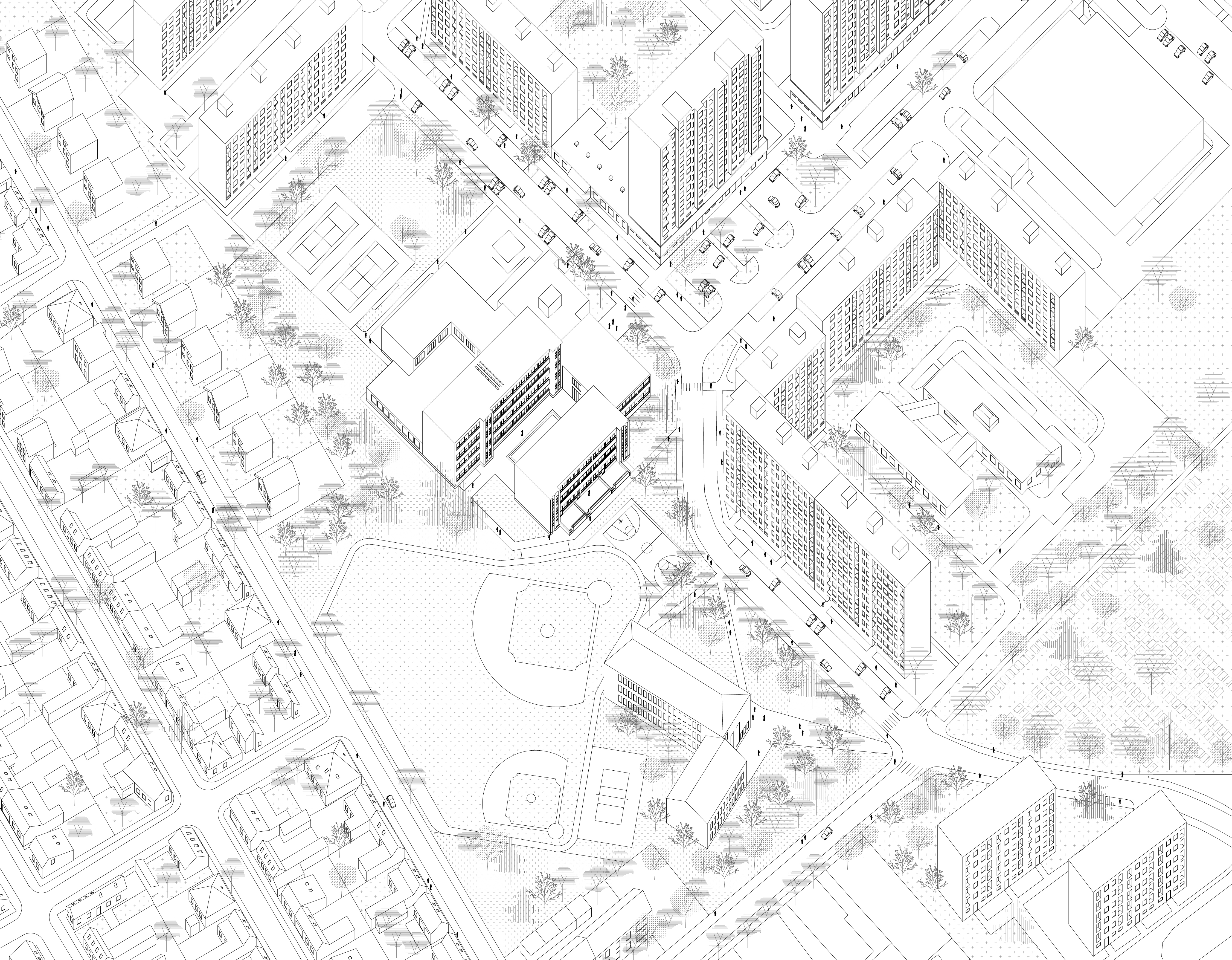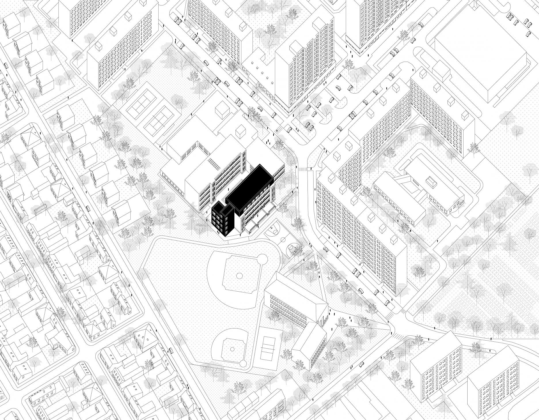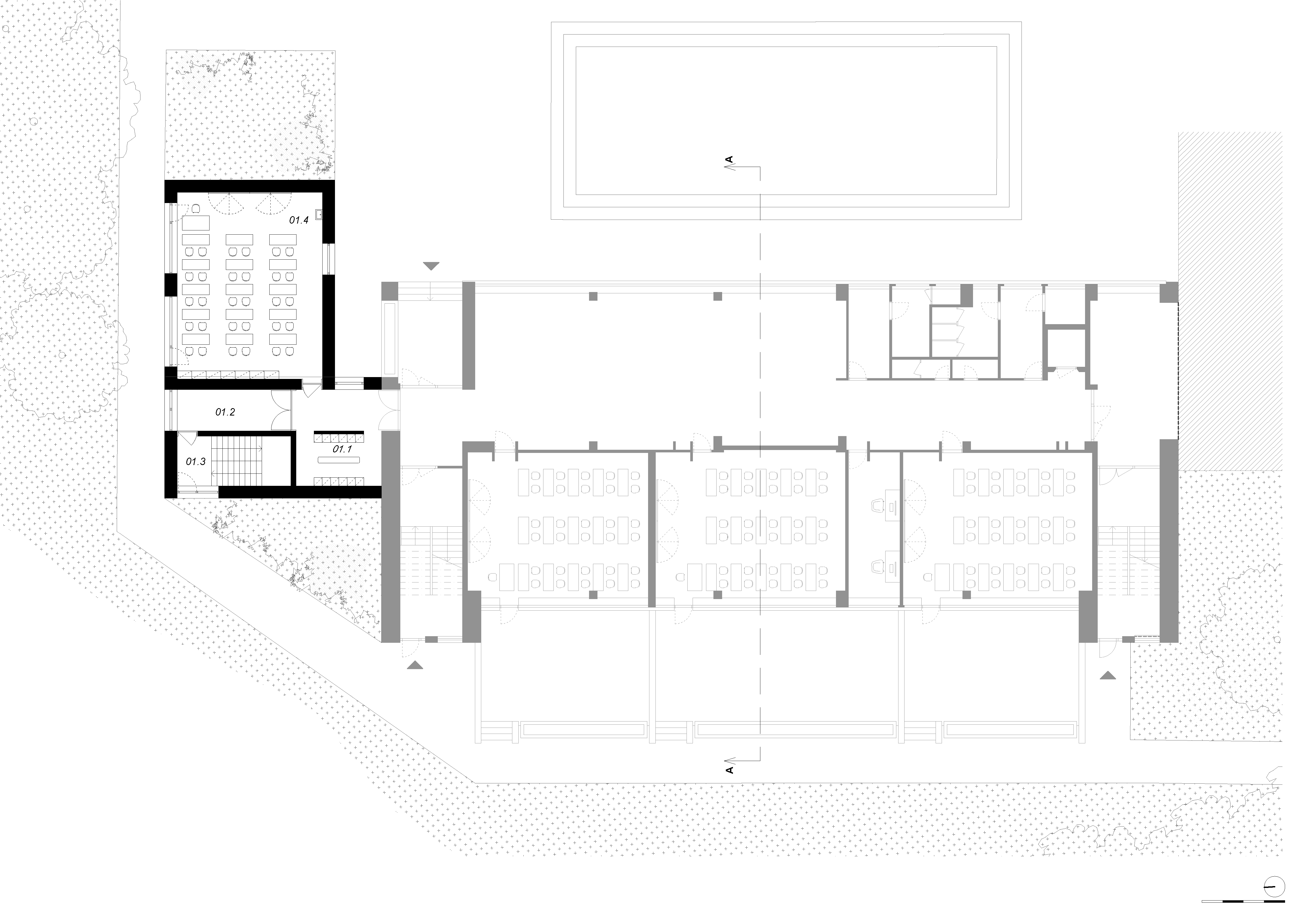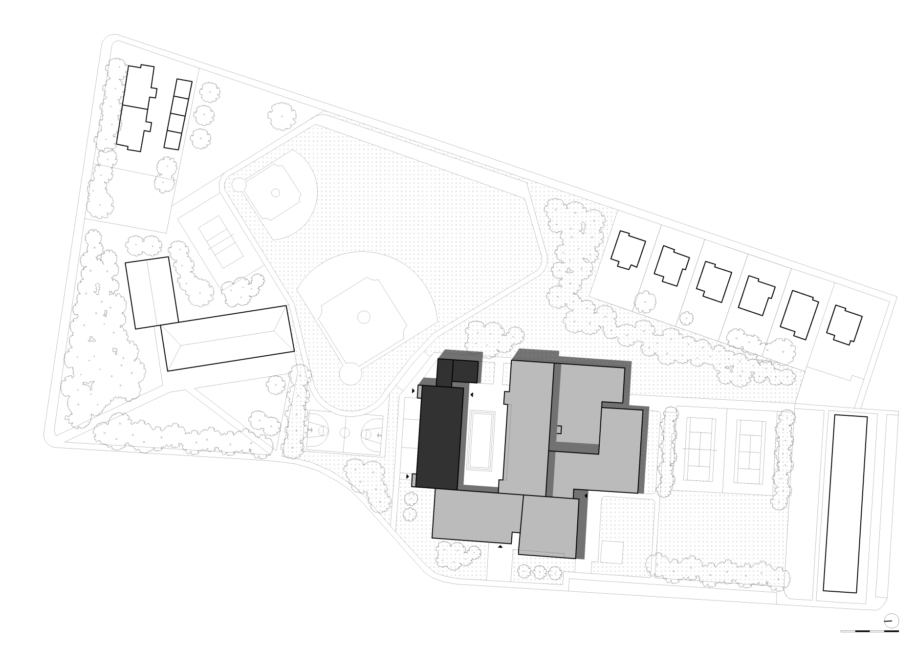 Časť tried je situovaná do nadstavby, ktorej vnútorné členenie kopíruje typické podlažie. Prístavba dopĺňa západné krídlo a zároveň čiastočne uzatvára priestor nádvoria. Priestranstvo sa stáva centrálnejšie, avšak so zachovaním pôvodného konceptu priehľadov. Zvolené umiestnenie nového objektu vychádza aj z celkového usporiadania areálu školy, v rámci ktorého bolo v 90. rokoch vybudované baseballové ihrisko. Prístavba sa snažila svojou proporciou nezasahovať do jeho geometrie. Komplex školy dotvára ďalší pavilón, ktorým formálne uzatvára kompaktný tvar tejto štruktúry. Rekonštrukcia verejných priestorov by mala byť predmetom riešenia v budúcnosti.