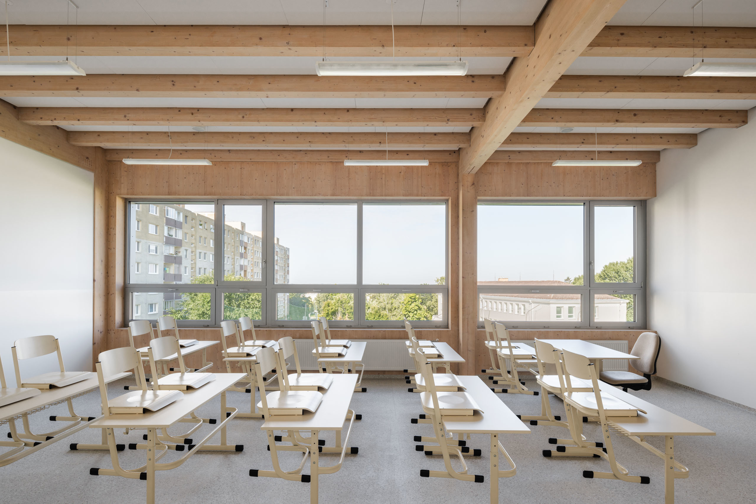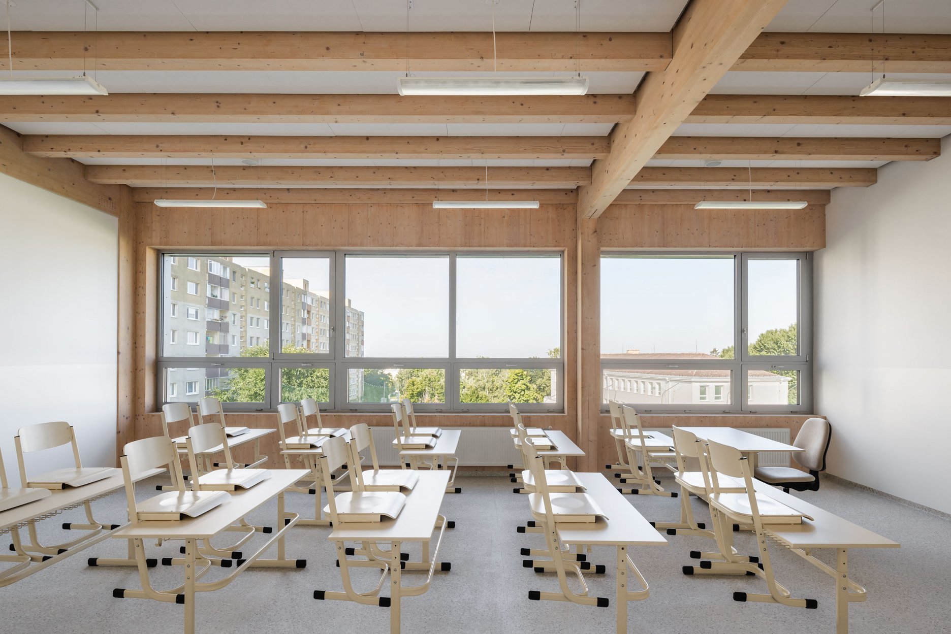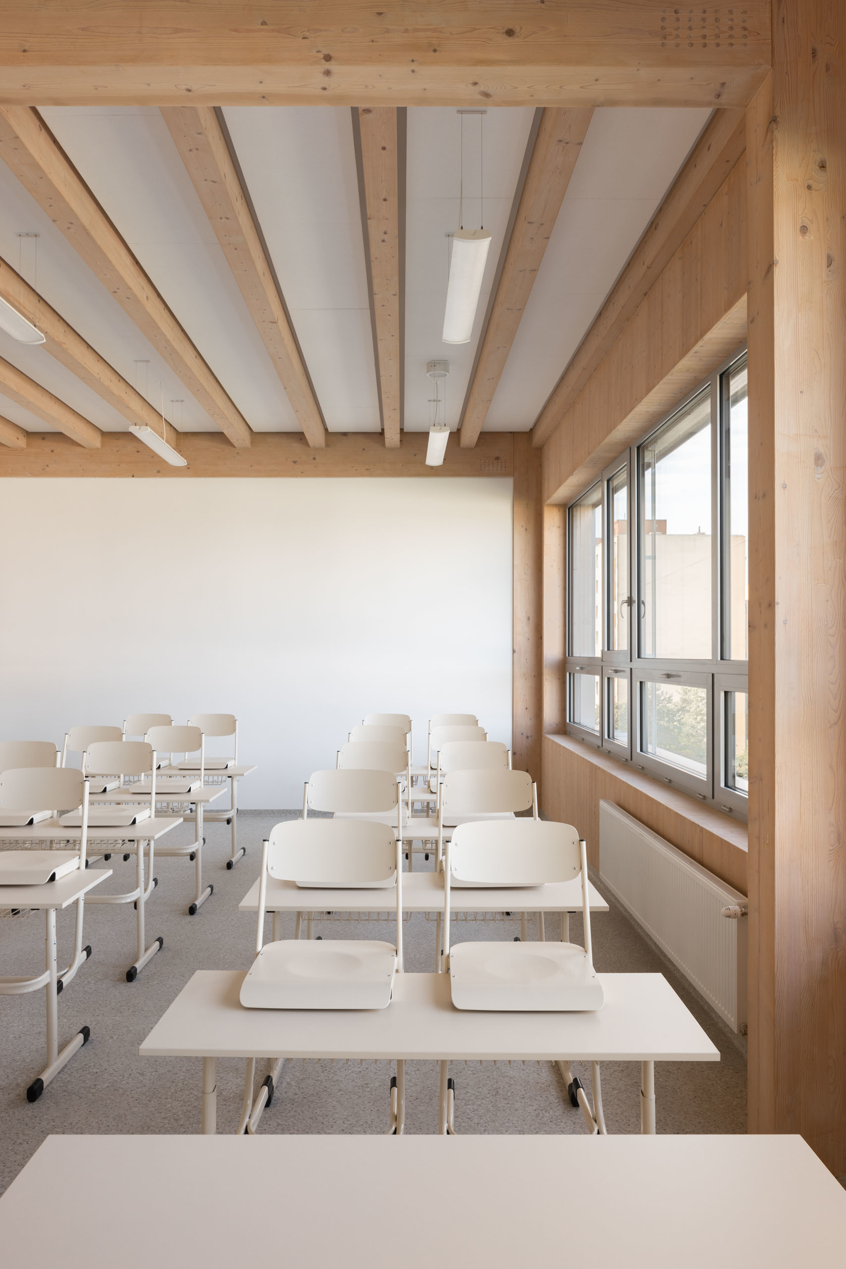Doplnené štruktúry majú materiálový základ postavený na drevených konštrukciách. Nadstavba sa skladá z drevenej rámovej konštrukcie, ktorá nadväzuje na existujúcu skeletovú železobetónovú konštrukciu. V miestnostiach učební je priznaný drevený trámový strop. Fasádne steny sú na báze stĺpikovo-priečnikovej "sendvičovej" konštrukcie. Objekt dostavby je komponovaný z CLT panelov na obvodových stenách a dreveným trámovým stropom. V miestnostiach učební sú všetky steny z CLT panelov.