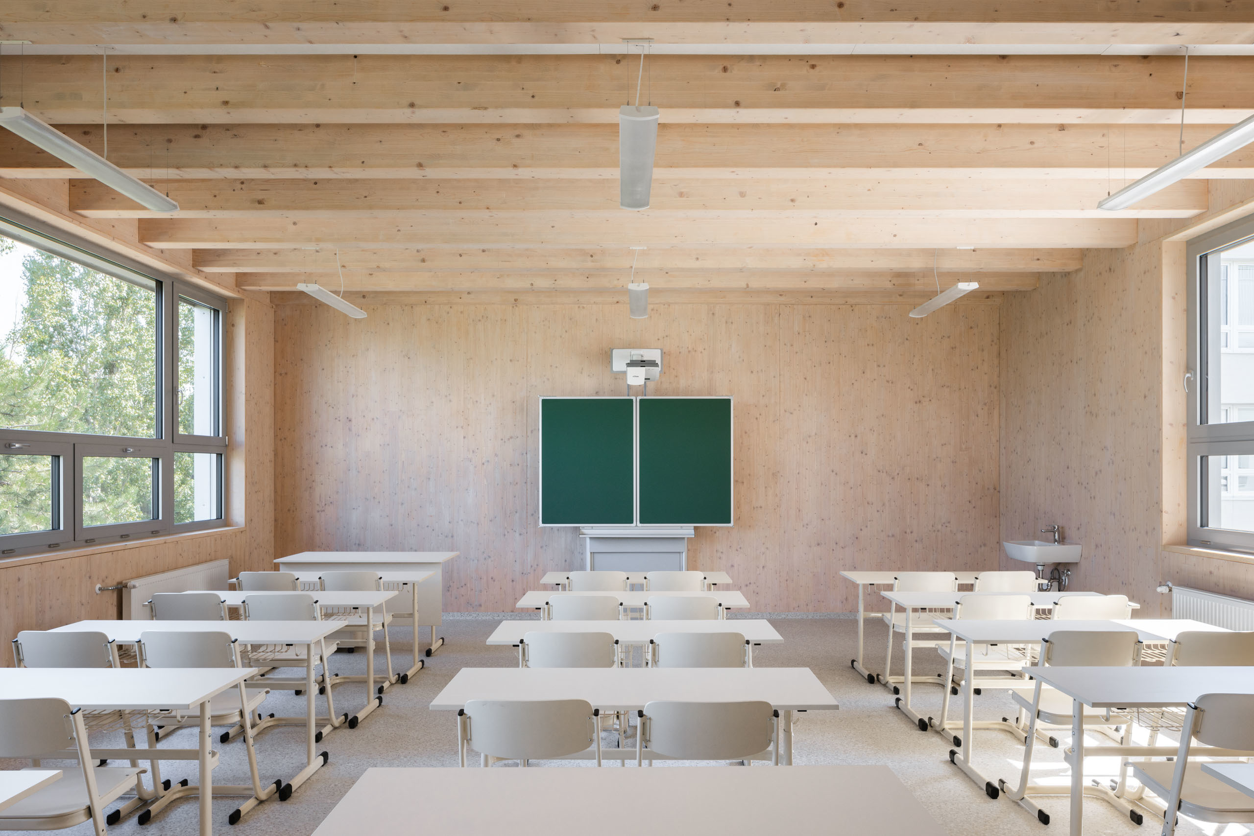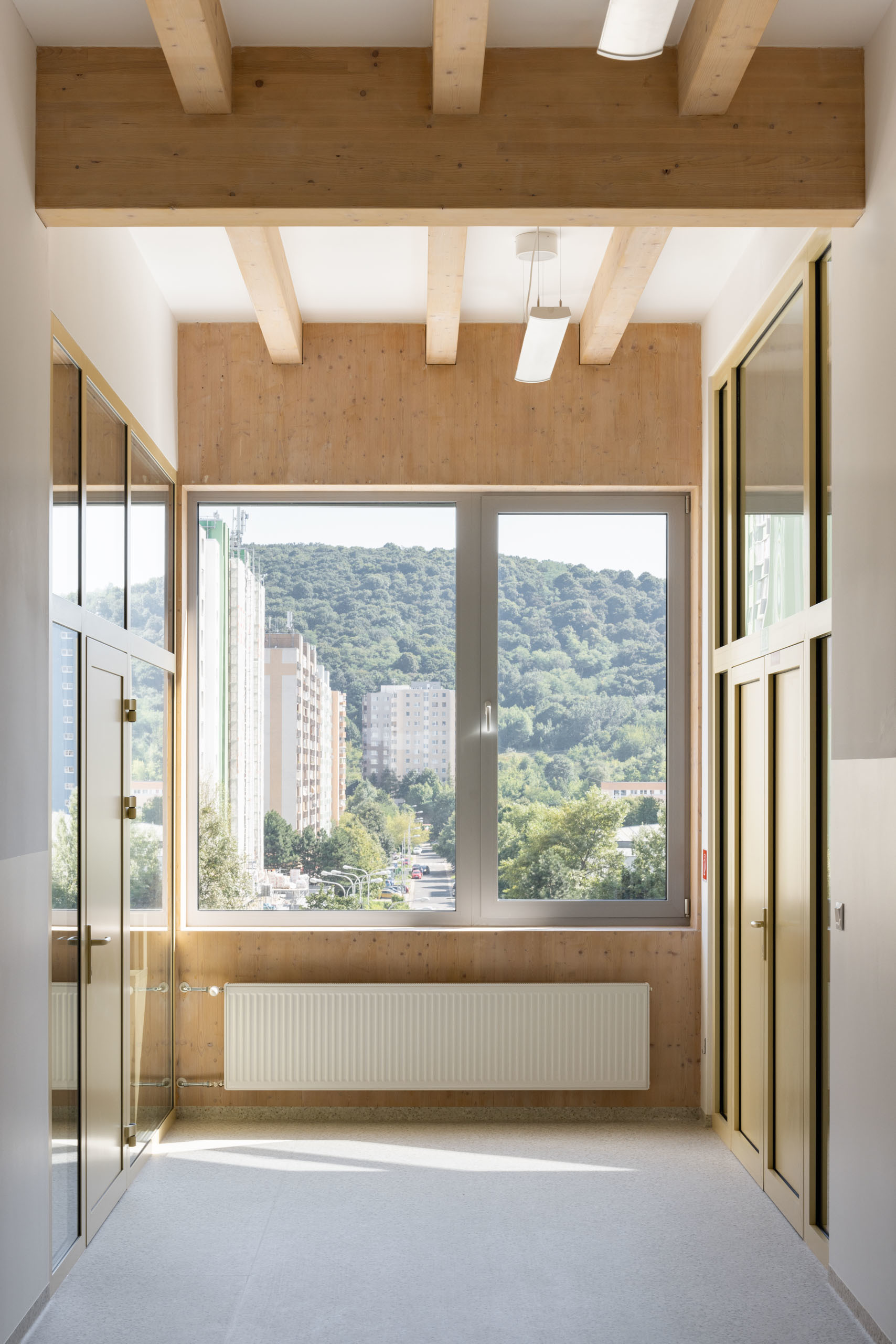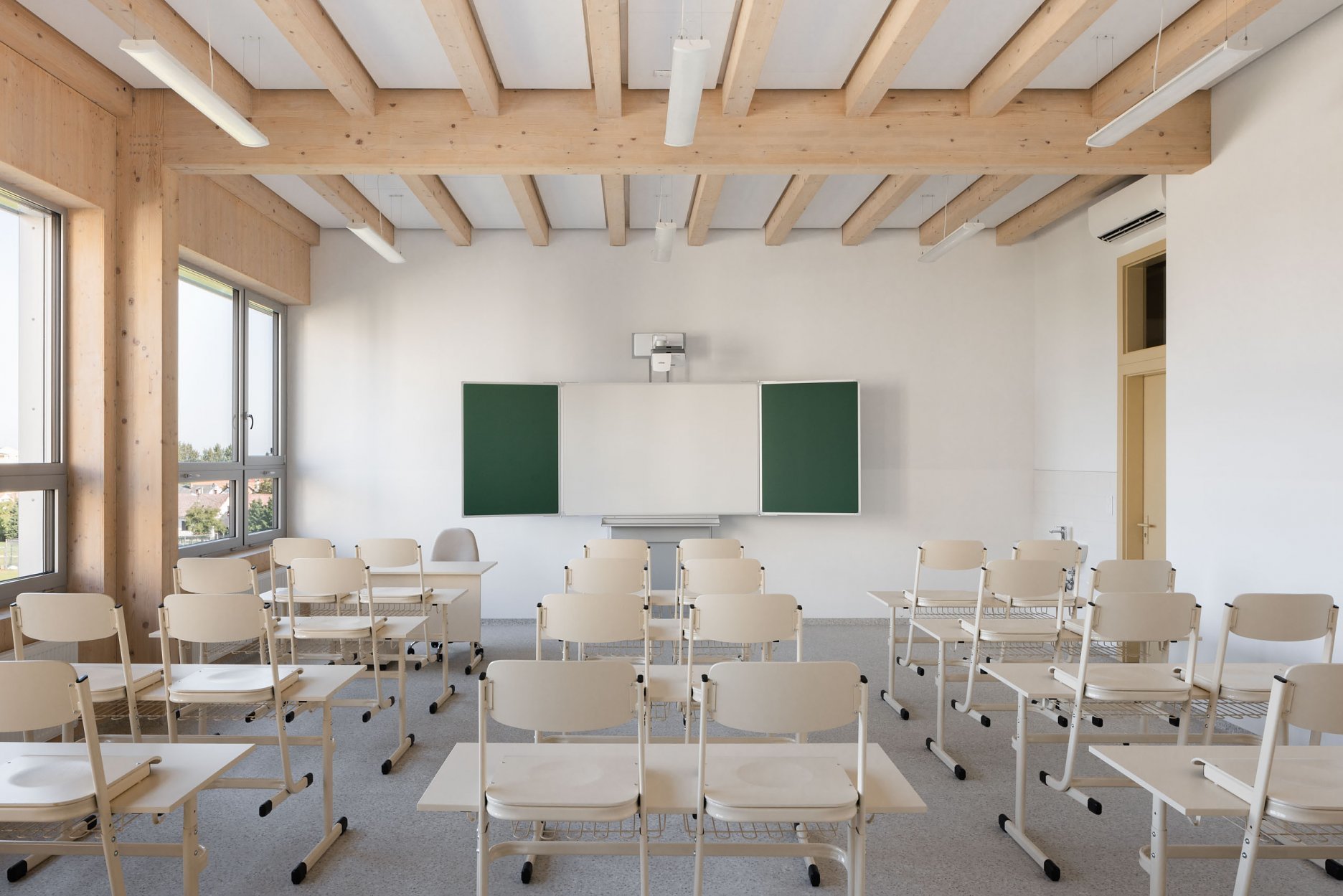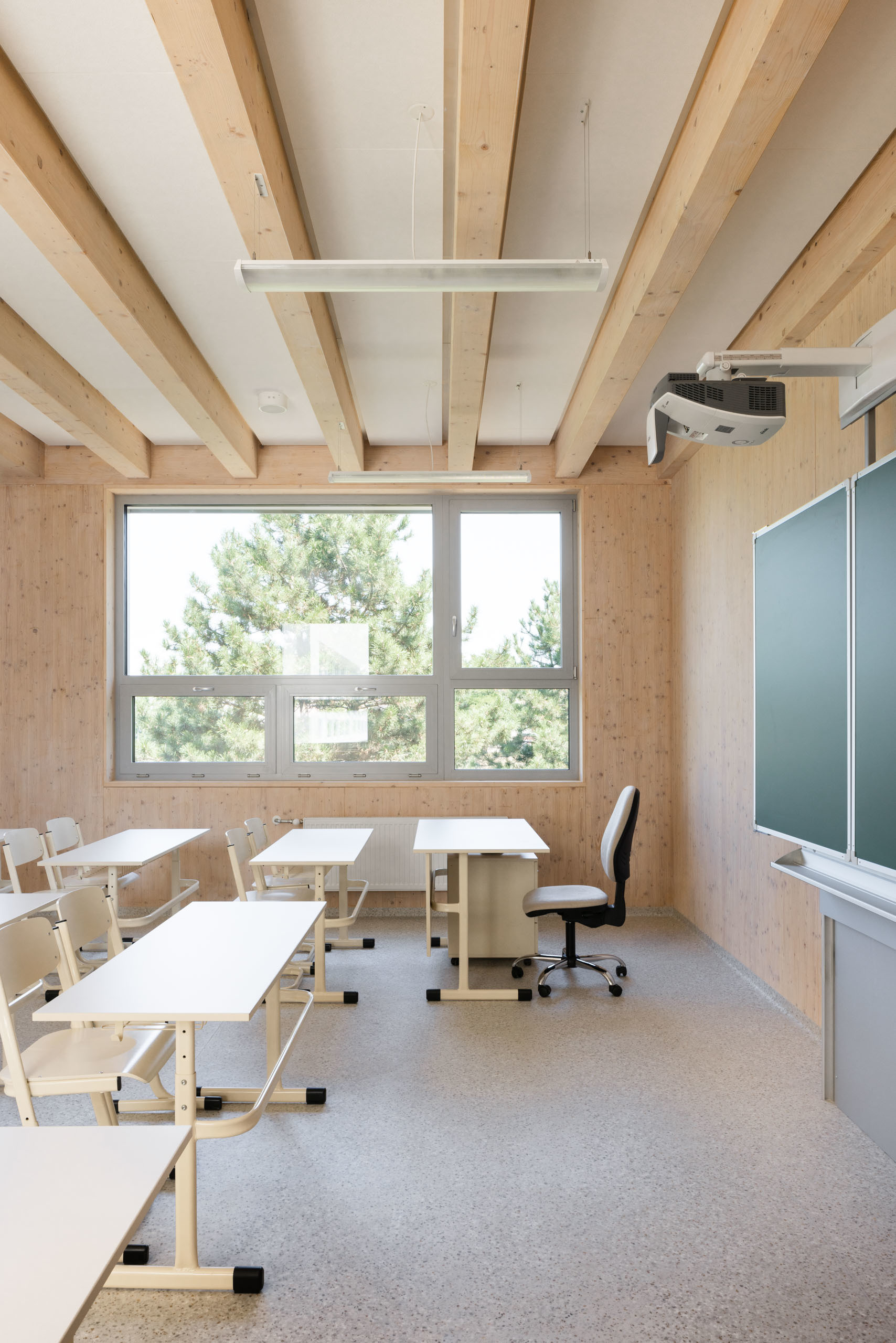 Doplnené štruktúry majú materiálový základ postavený na drevených konštrukciách. Nadstavba sa skladá z drevenej rámovej konštrukcie, ktorá nadväzuje na existujúcu skeletovú železobetónovú konštrukciu. V miestnostiach učební je priznaný drevený trámový strop. Fasádne steny sú na báze stĺpikovo-priečnikovej "sendvičovej" konštrukcie. Objekt dostavby je komponovaný z CLT panelov na obvodových stenách a dreveným trámovým stropom. V miestnostiach učební sú všetky steny z CLT panelov.
