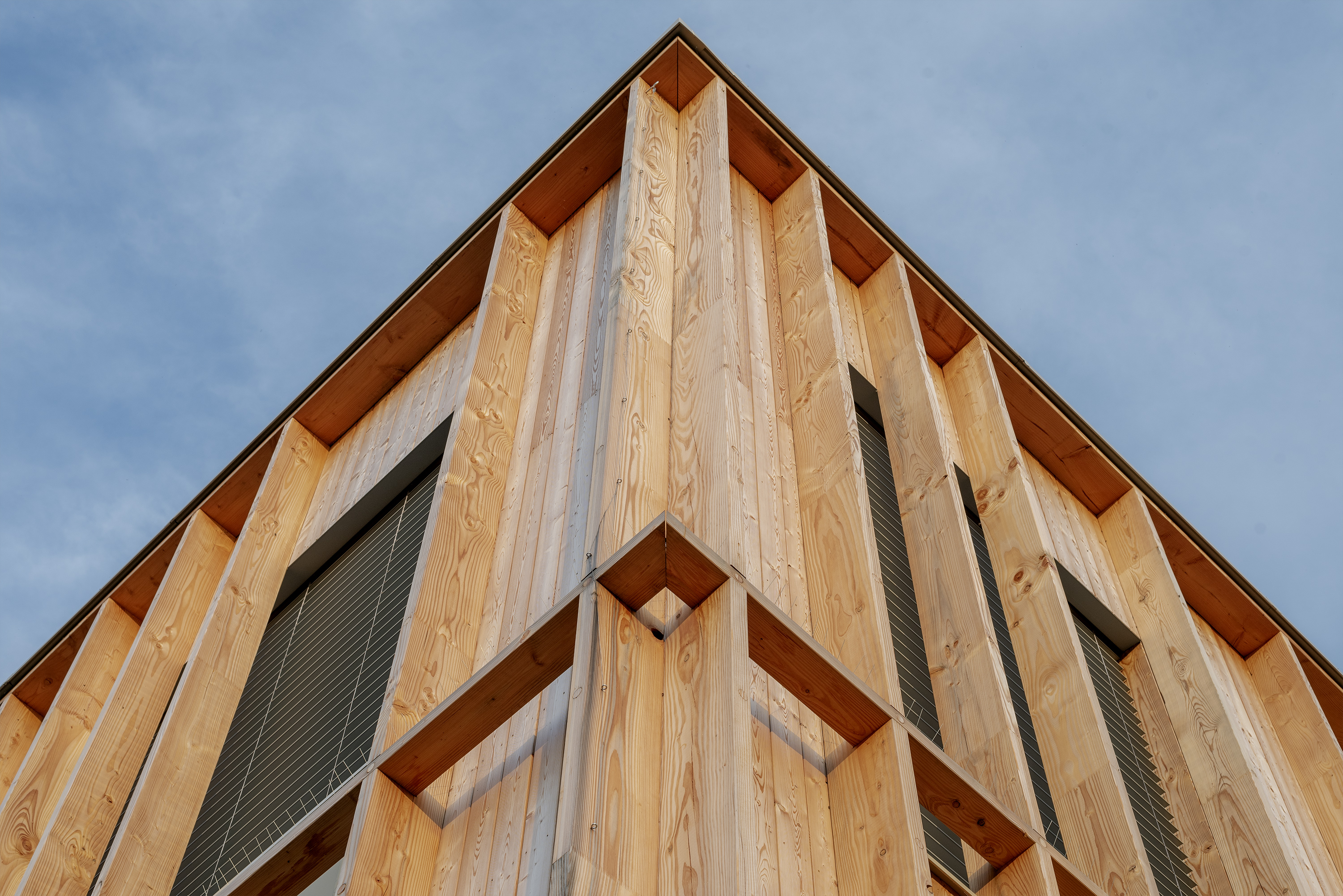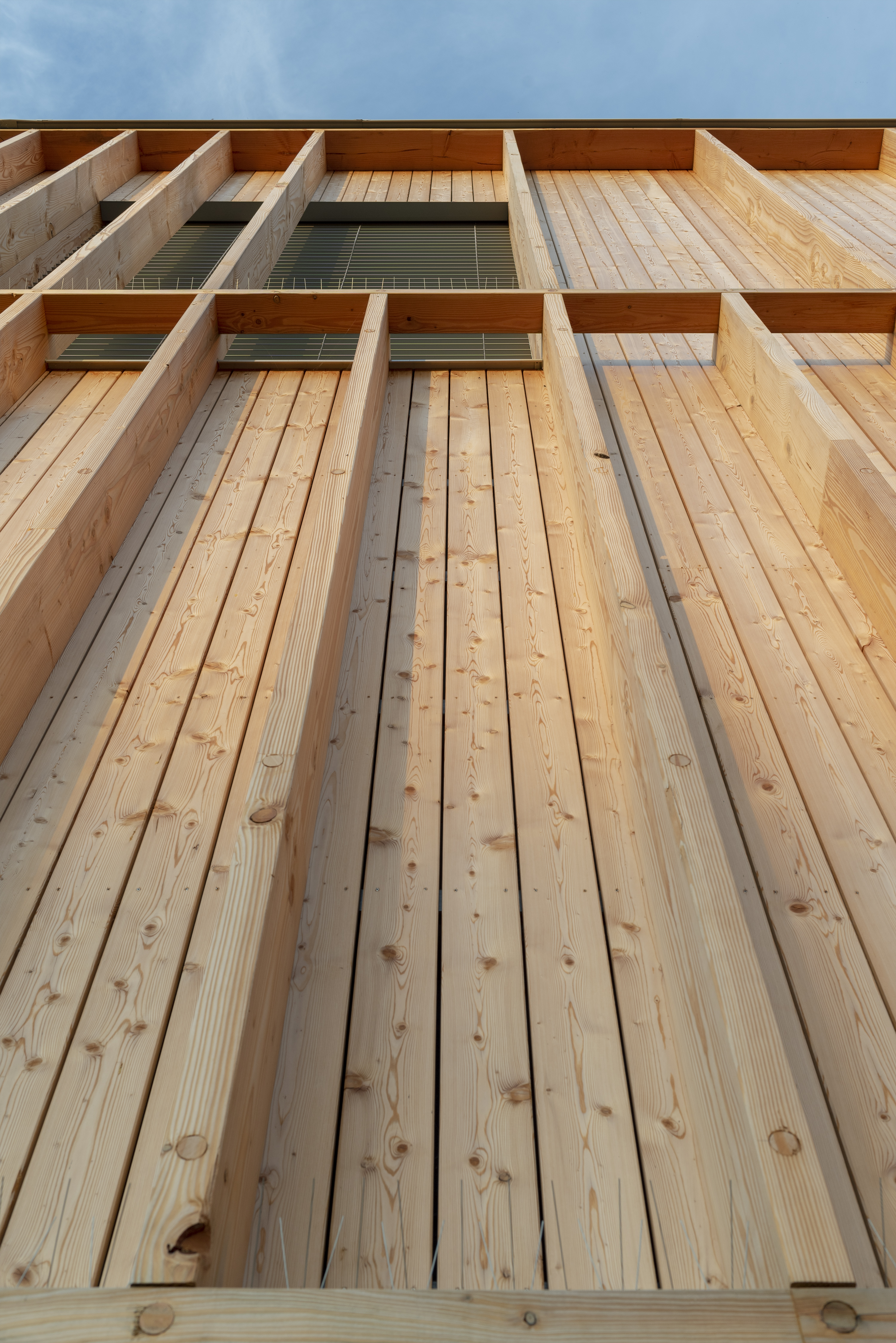 Štandardu obvodového plášťa zodpovedajú drevohliníkové okná, zasklené izolačným bezpečnostným trojsklom. Povrch fasády tvorí obklad zo sibírskeho smrekovca.