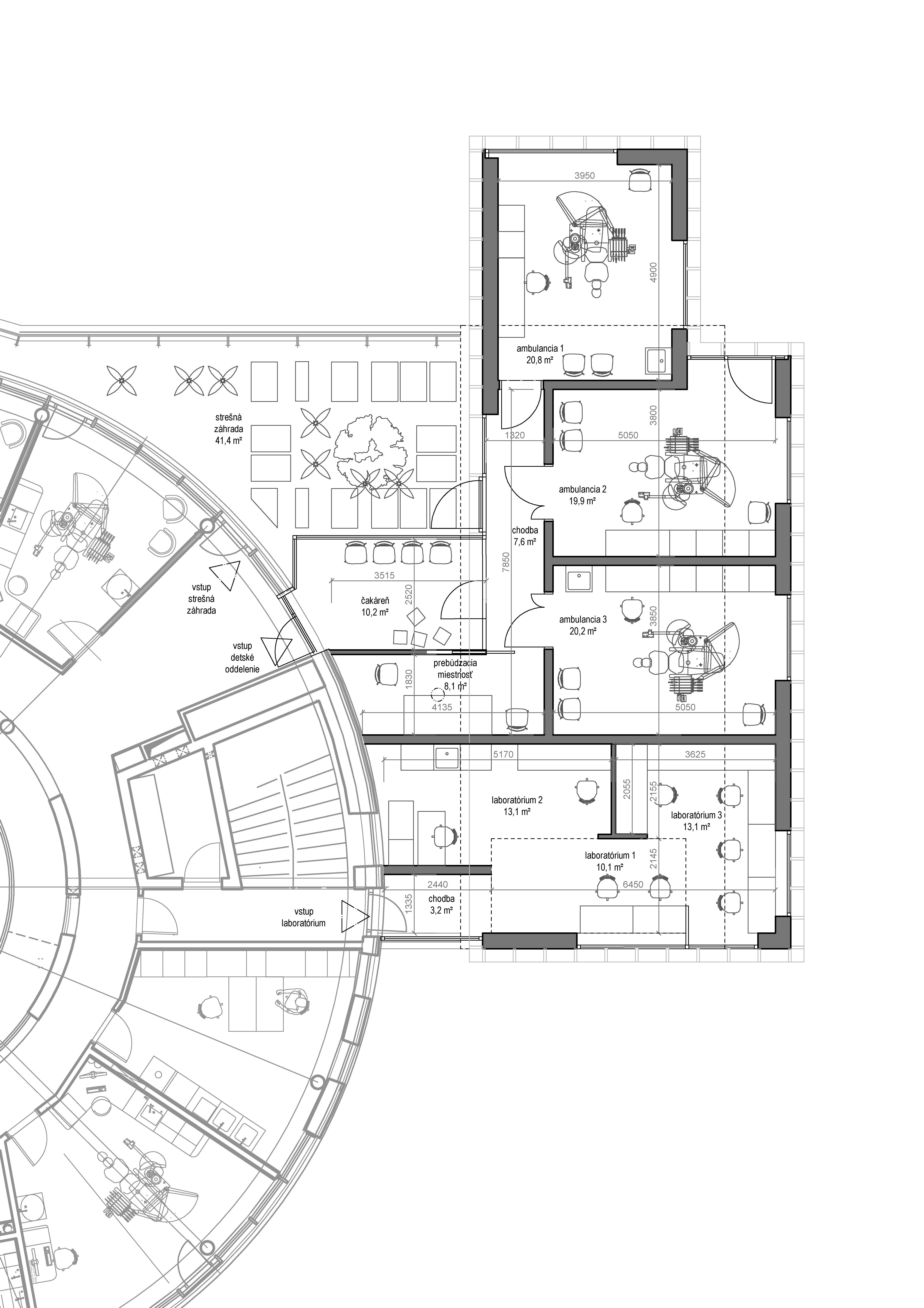 Na úrovni druhého nadzemného podlažia sa nachádzajú hlavné priestory ambulancií s čakárňou a laboratórium so samostatným vstupom z existujúceho schodiska.