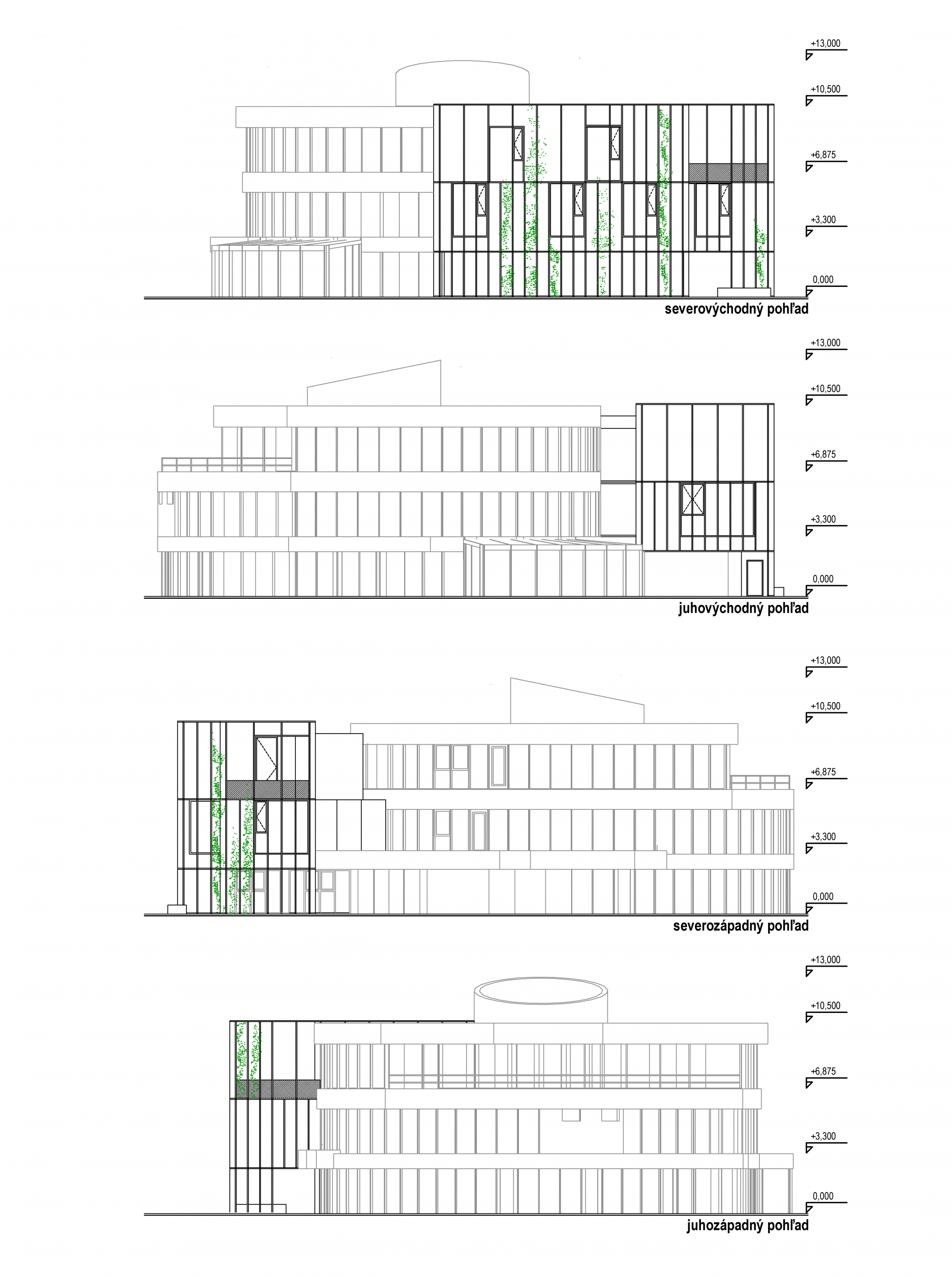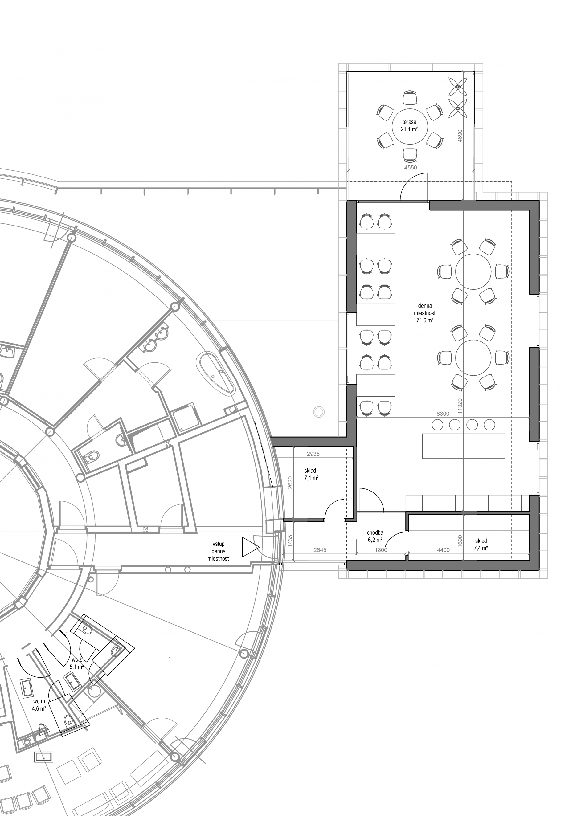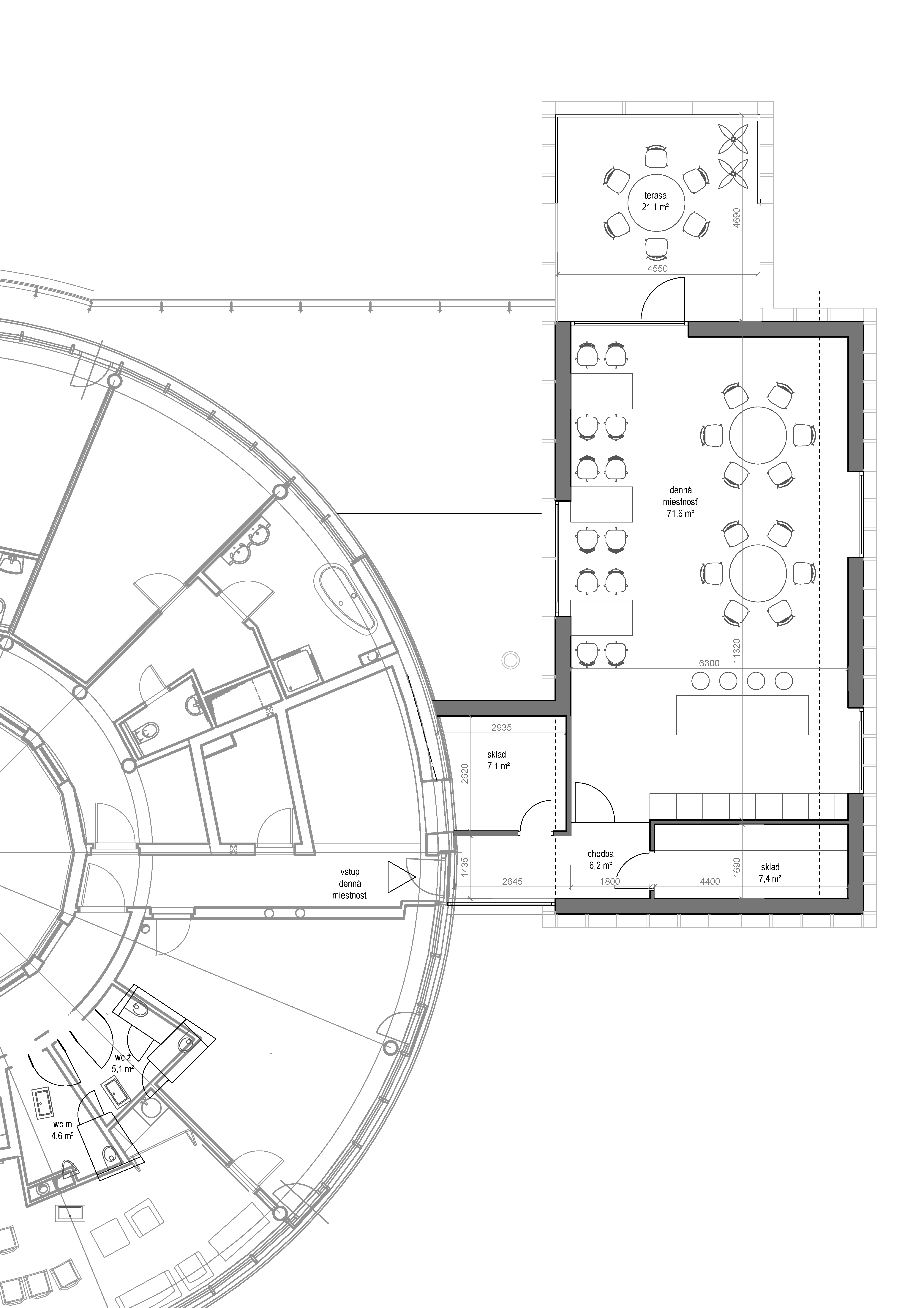 Pôvodné centrum s kruhovým pôdorysom doplnil jasne tvarovo a materiálno odlíšený blok, zastrešený plochou vegetačnou strechou.