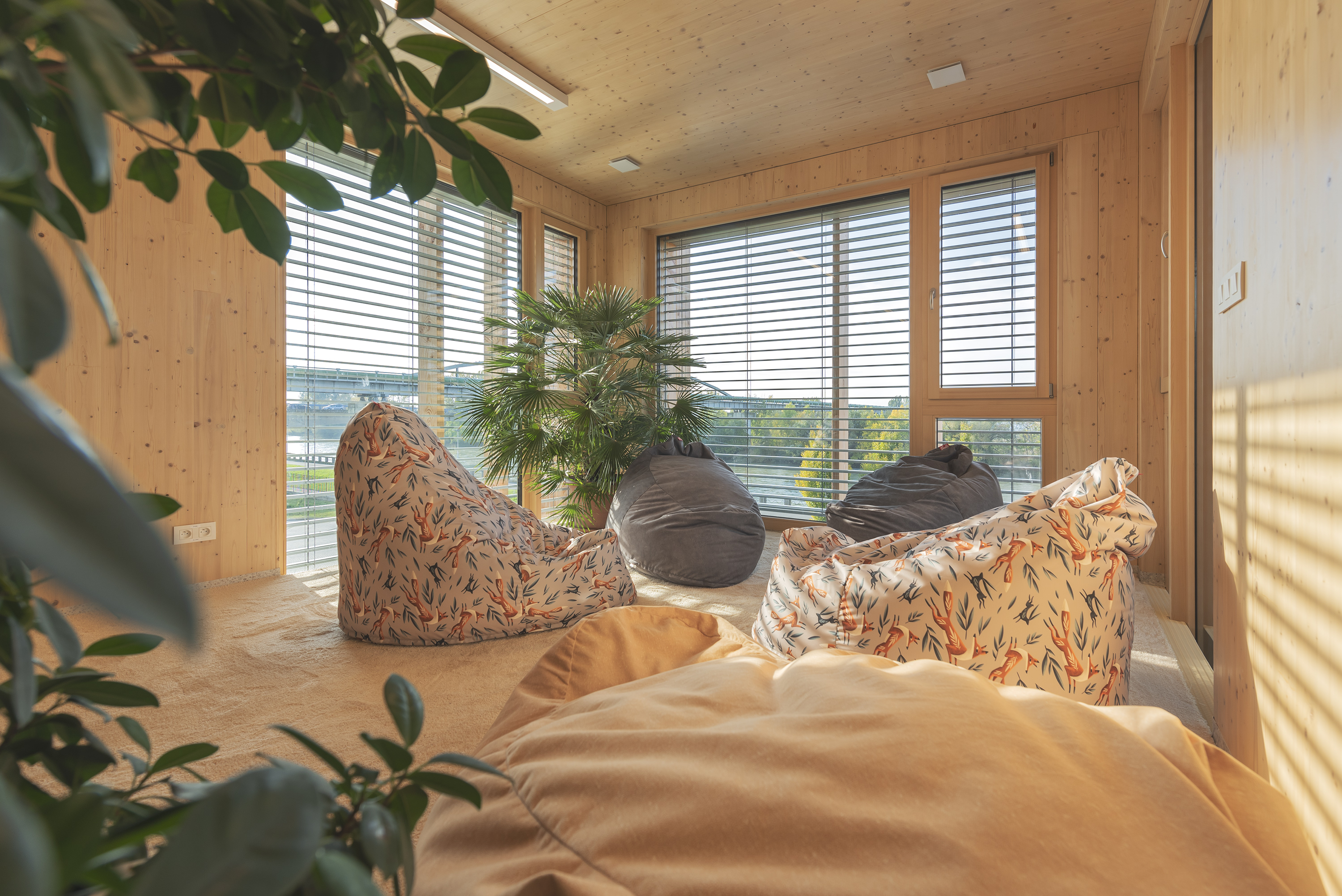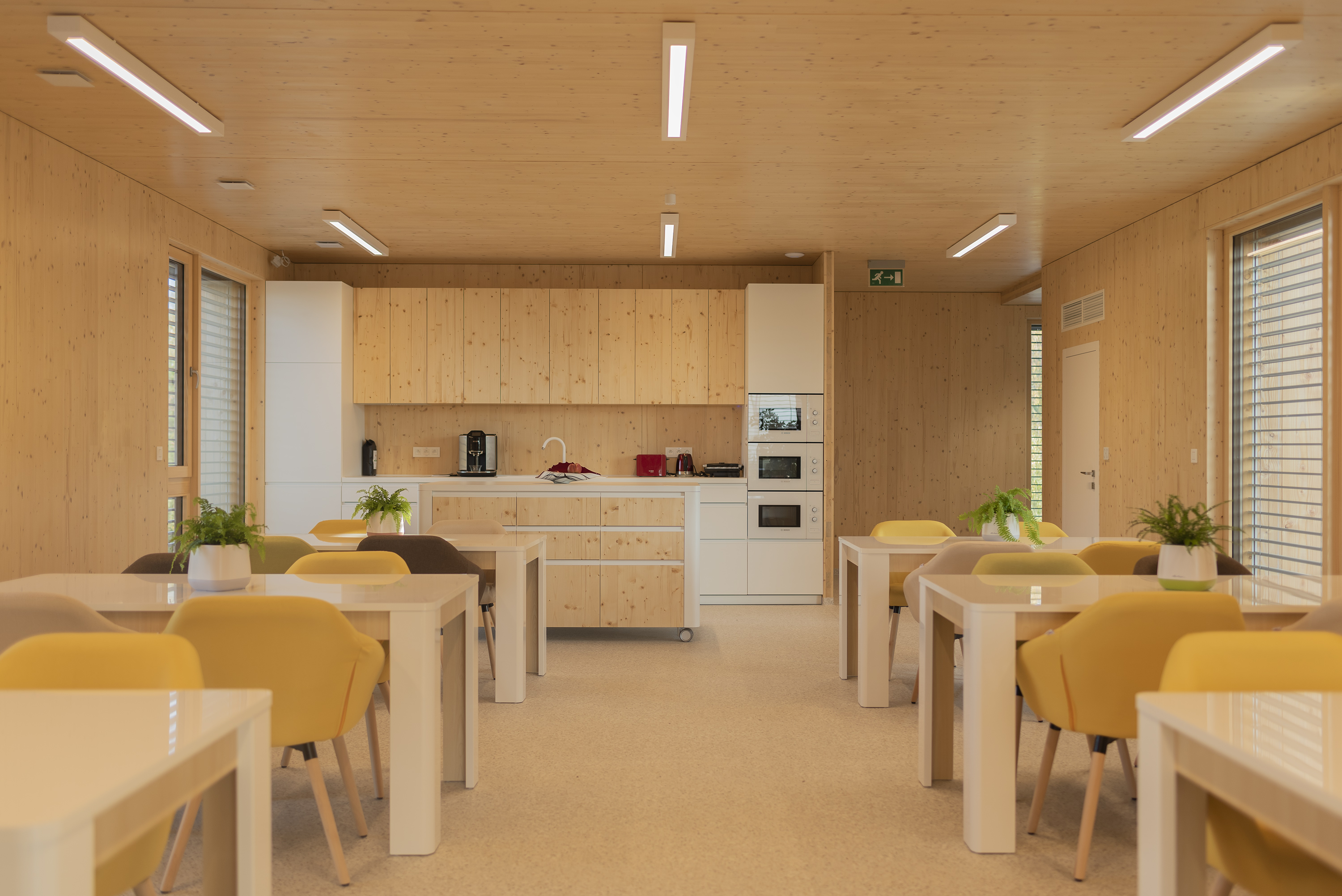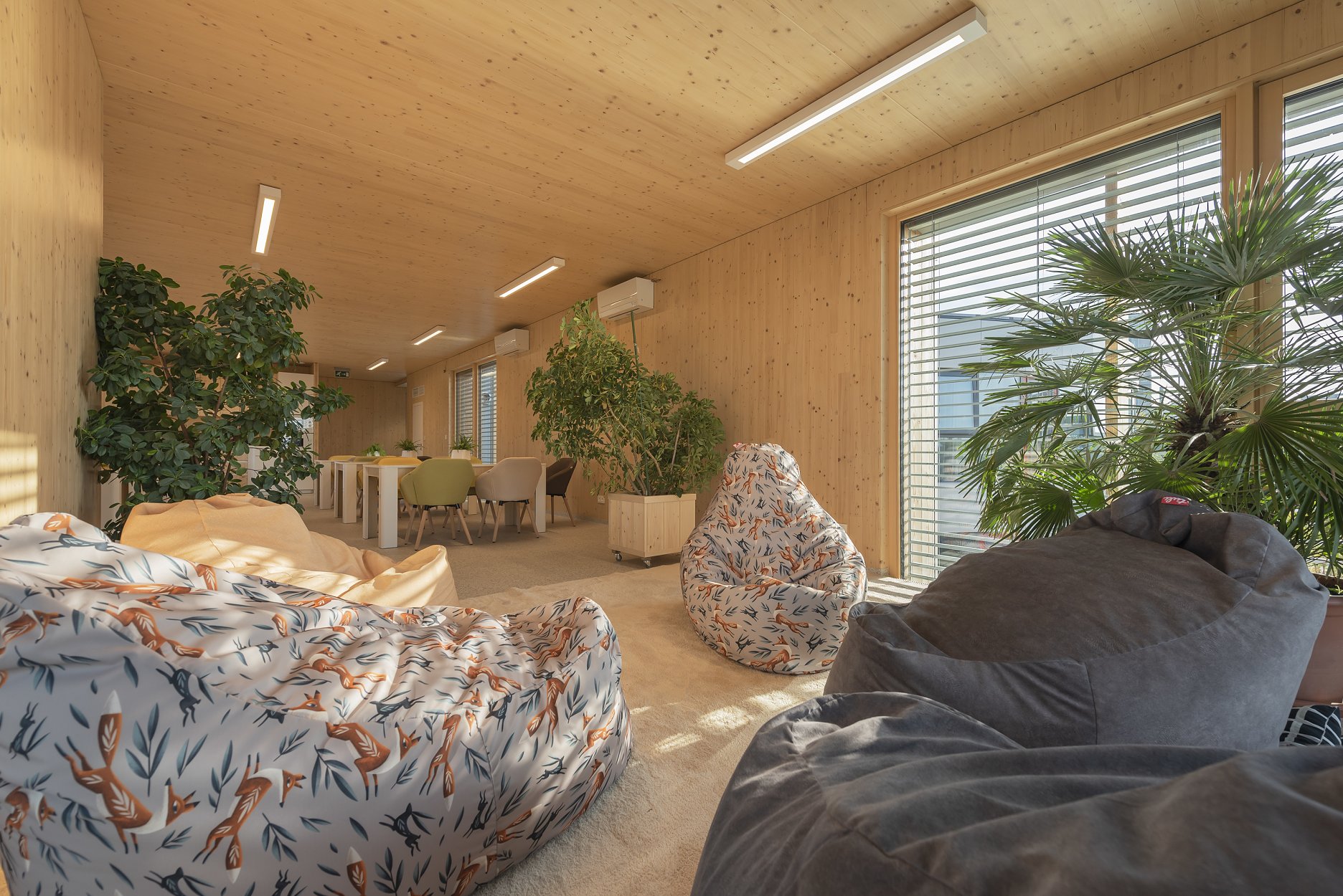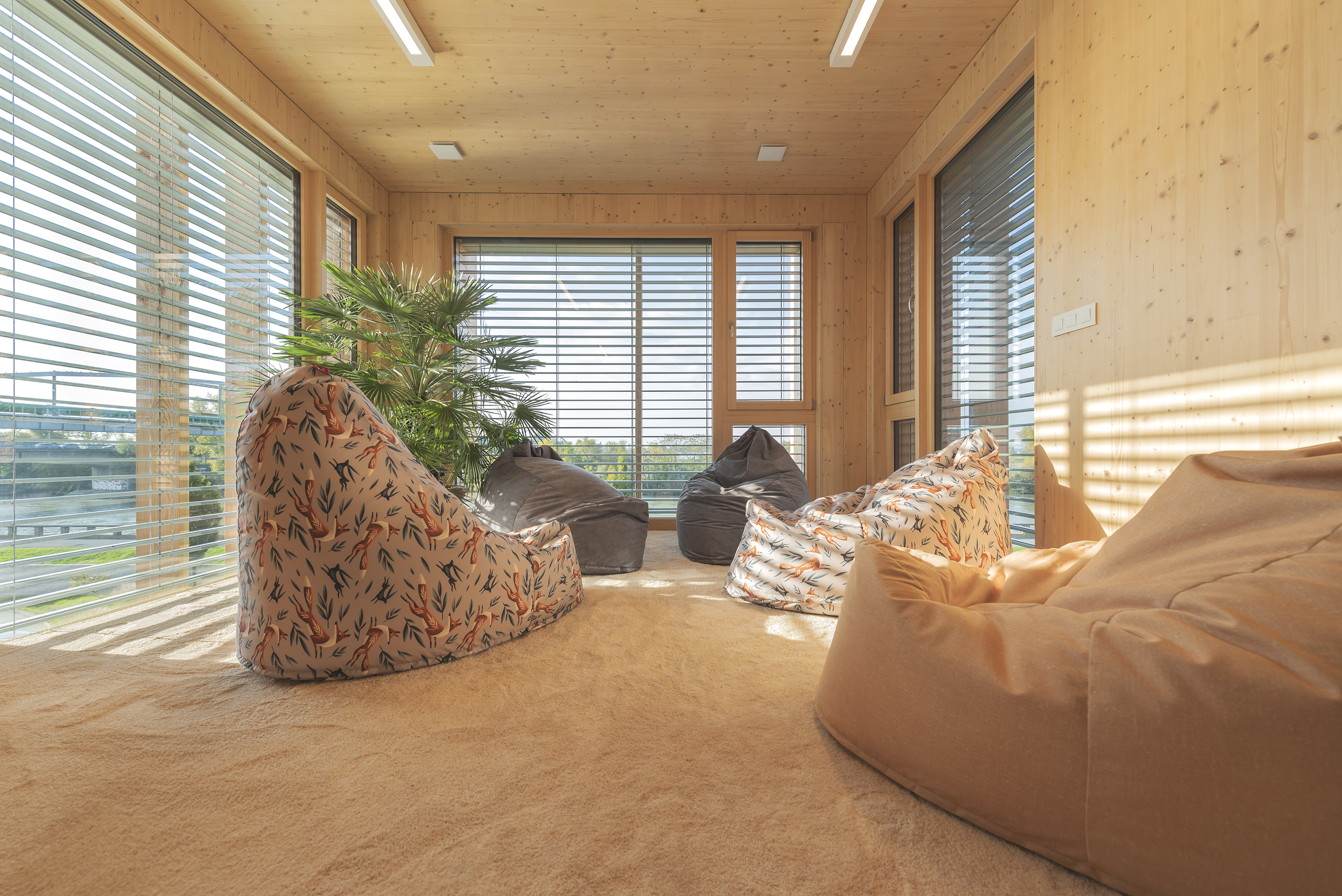 Vyššie poschodie zastrešuje prednáškový priestor, ktorý zároveň slúžia ako denná miestnosť pre zamestnancov.