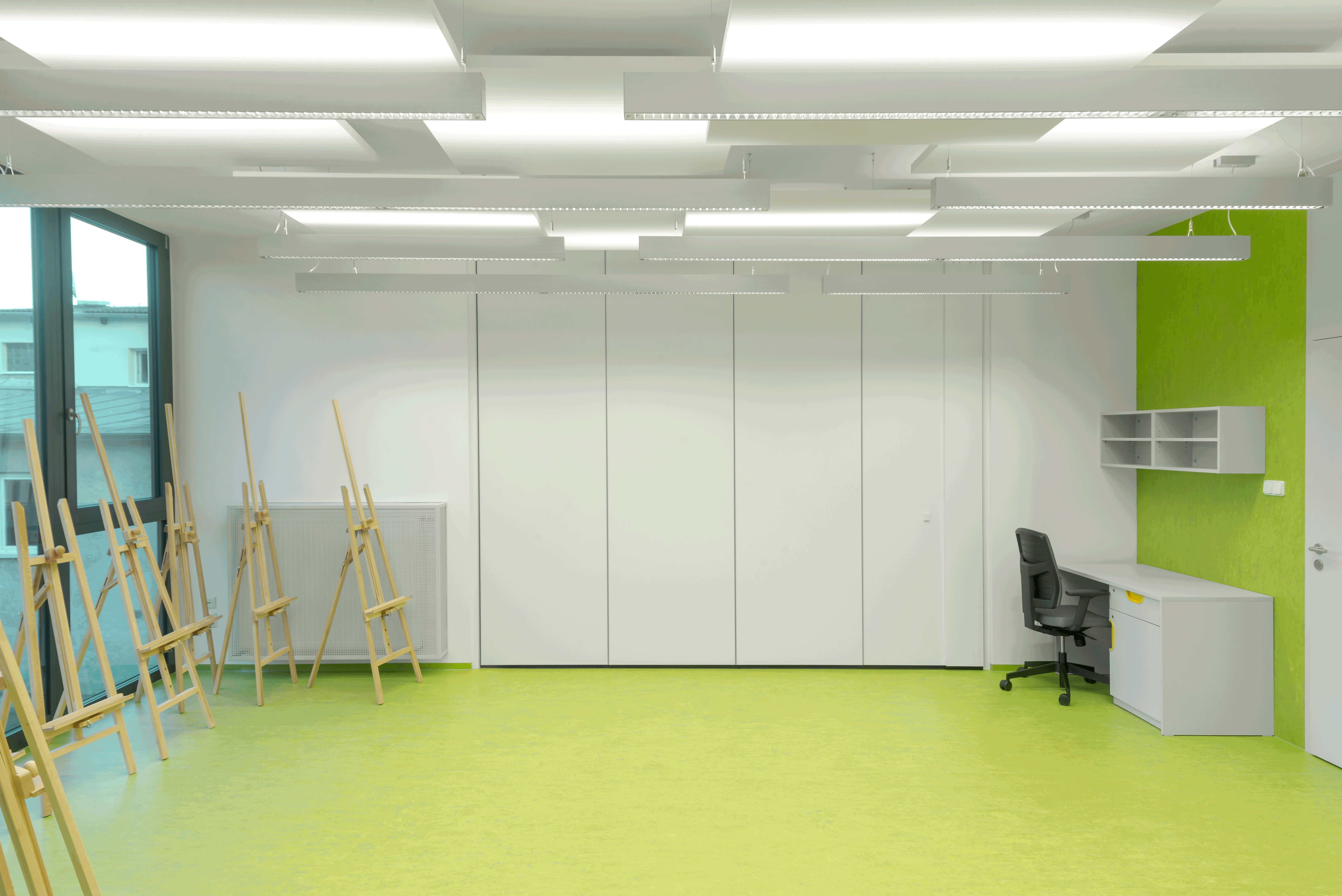 Pri pohľade zo záhrady je jasná snaha autorov o rozsiahlejšie otvorenie a presvetlenie interiéru. Dvojica vzájomne posunutých pásových okien zabezpečuje dôležitý vizuálny kontakt so záhradou. Ostatné okenné otvory sú ukryté za predsadeným dreveným roštom. Ten je v nárožných častiach redší, čo pri pohľade z ulice prispieva k rytmizácii fasády a rôznej priepustnosti svetla vo večerných hodinách. Predsadený rošt vymedzuje a akcentuje menej formálnu funkciu nového objektu oproti “prísnej” budove školy.