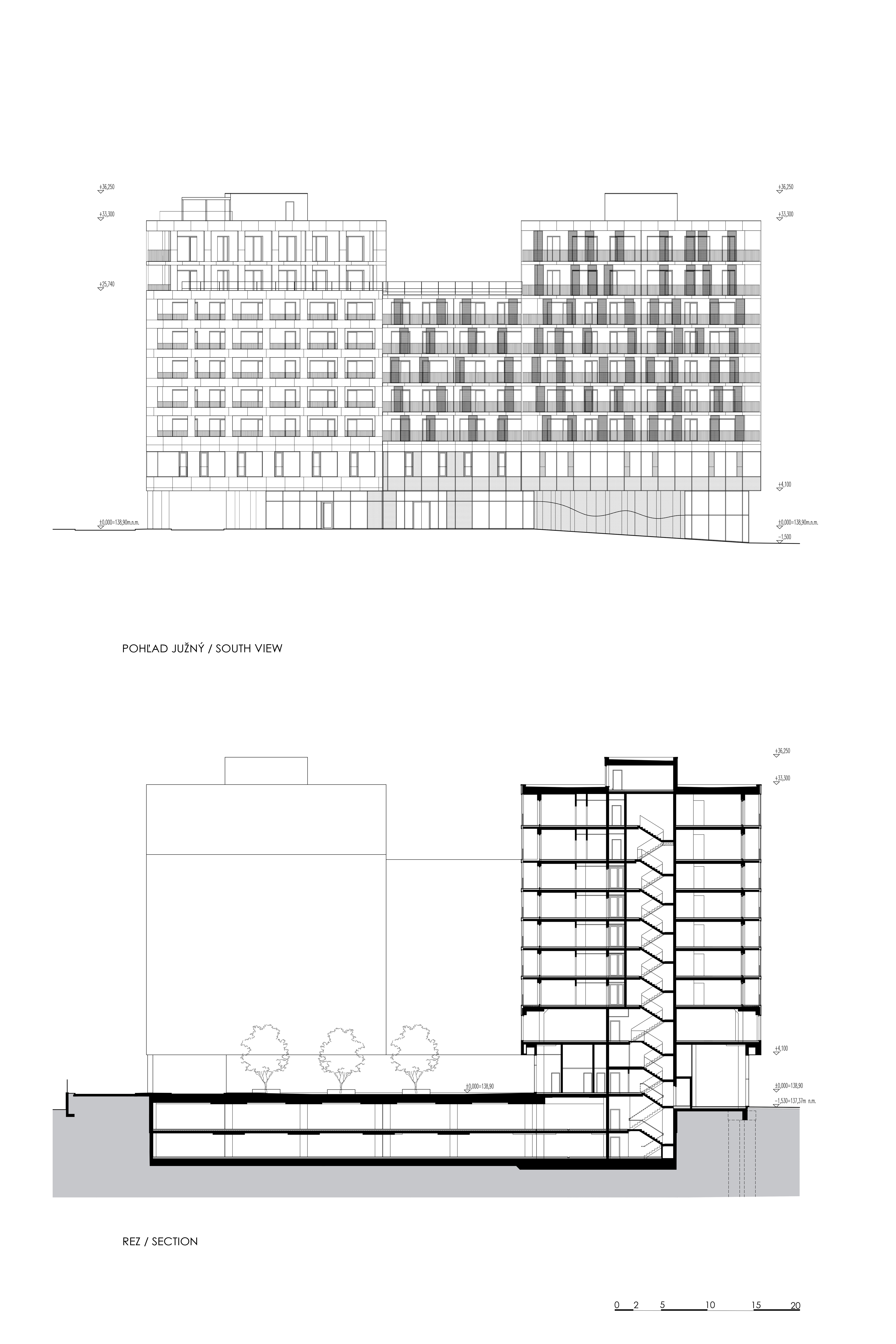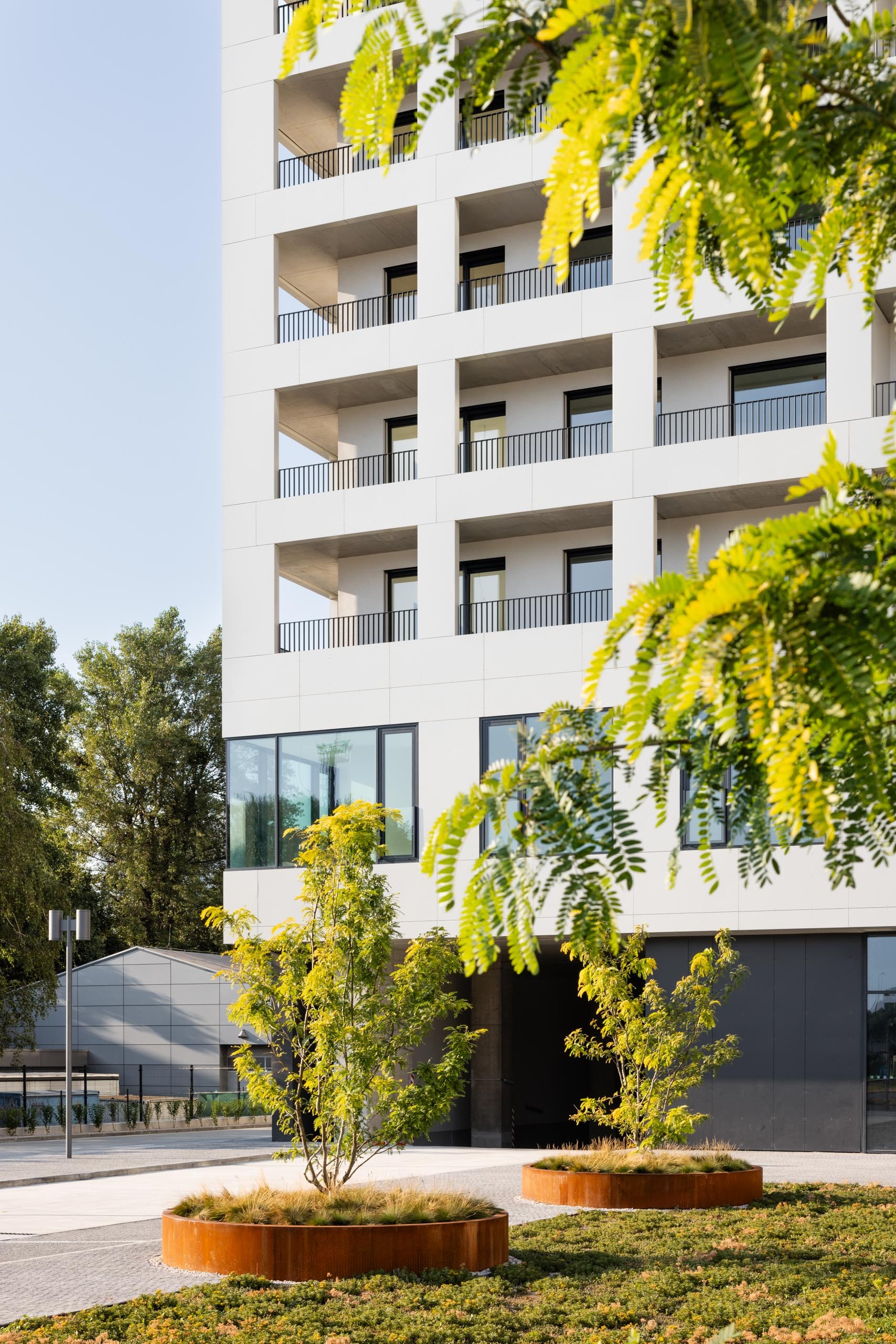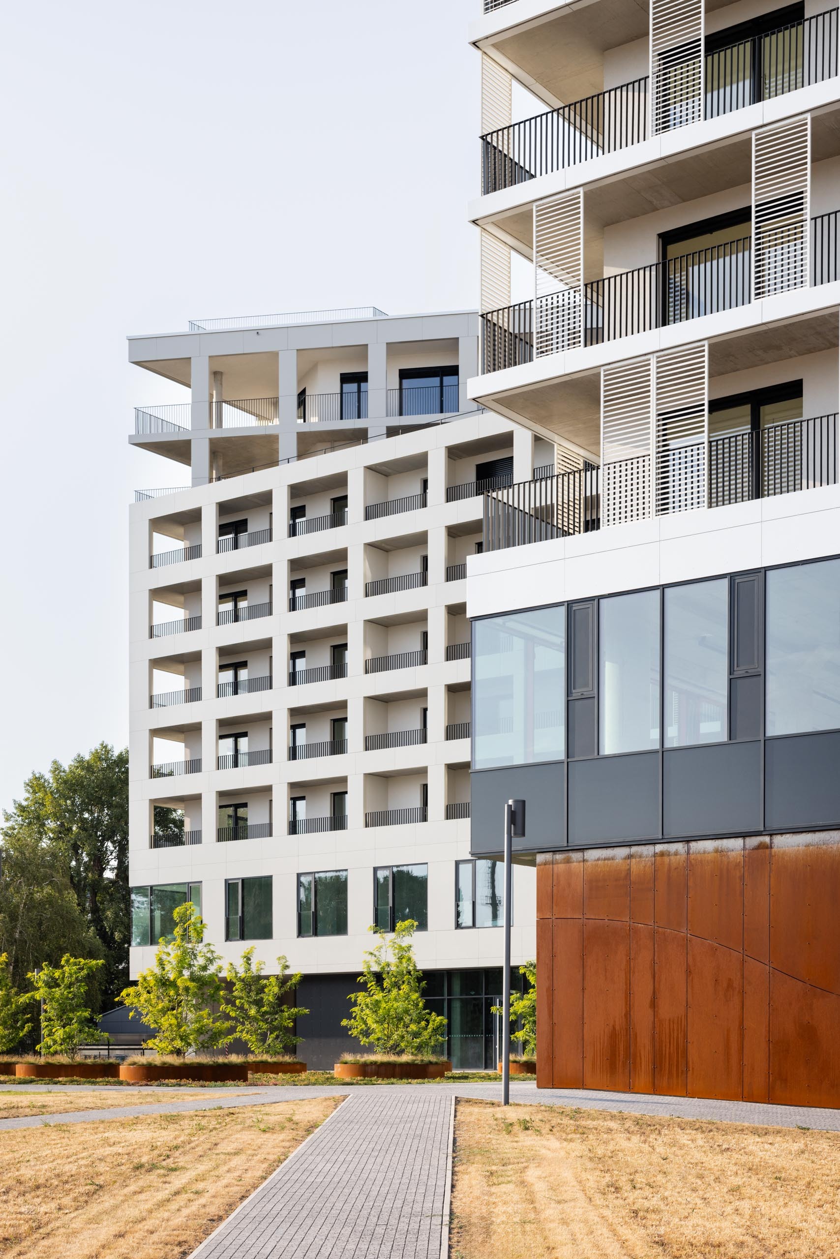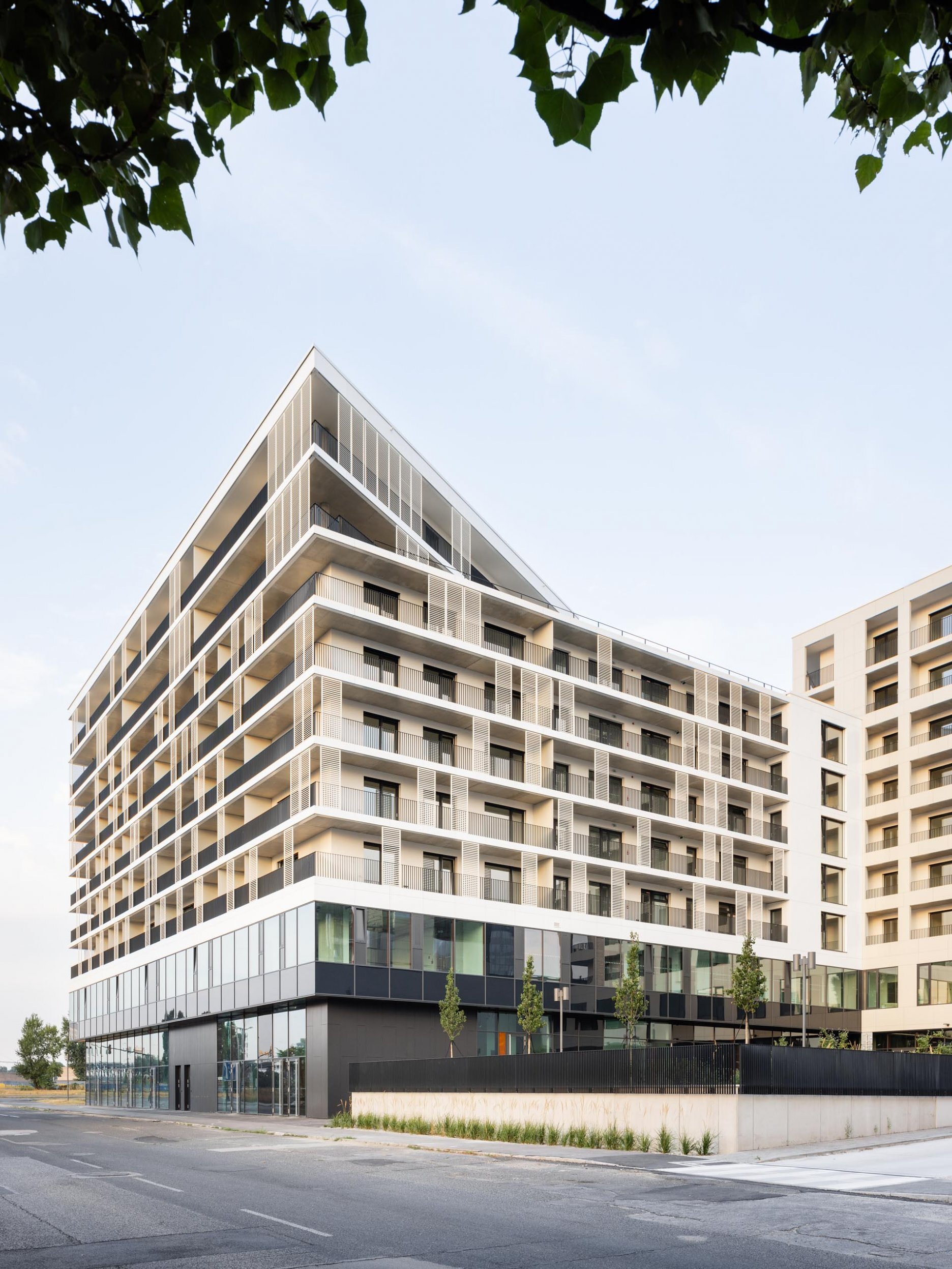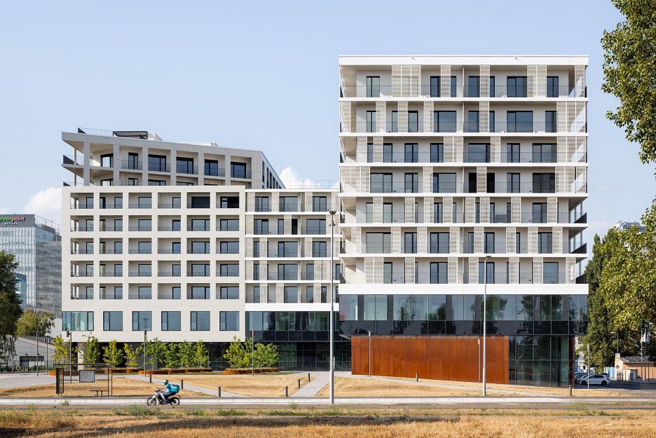 Projekt ateliéru AVK ARCHITECTS si prešiel od návrhu po realizáciu kľukatou cestou. Napriek tomu si výsledná architektúra zachováva jasne čitateľnú a artikulovanú štruktúru, ktorú vnáša do rýchlo sa meniacej lokality. Stvárnenie fasáy navonok reflektuje skladbu funkcií v rámci objektu. Dynamiku do výslednej kompozície vnáša skosený blok najvyšších ustúpených podlaží a premenná v podobe pohyblivých prvkov tienenia.
