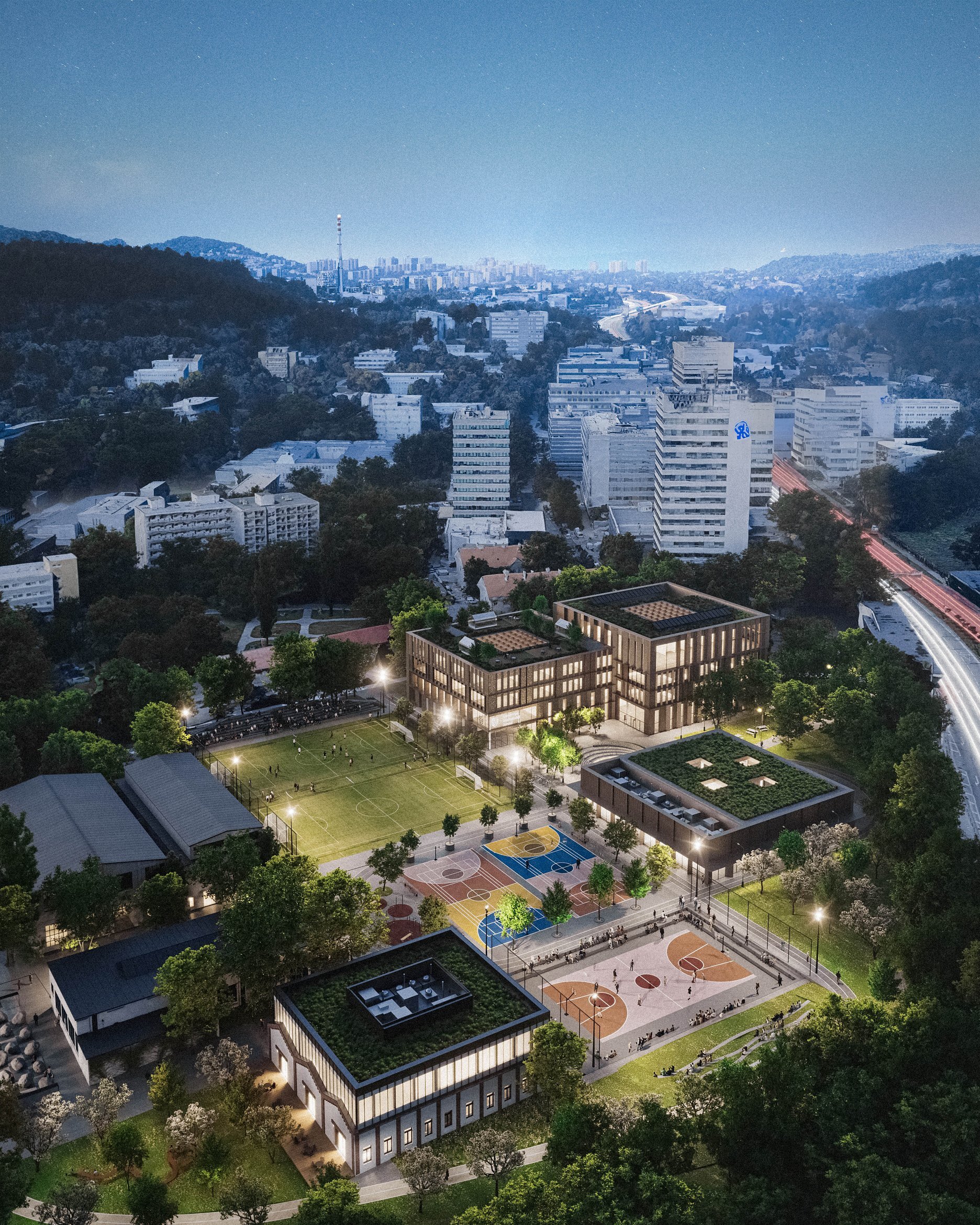 Navrhovaný kampus zahŕňa rôzne funkcie, ktoré presahujú tradičné vzdelávacie prostredie. Okrem učební a laboratórií sú k dispozícii priestory na kreatívne aktivity a rozmanité športové zariadenia. Hlavná os prechádza celým územím a spája dva hlavné verejné priestory kampusu s okolím školy.