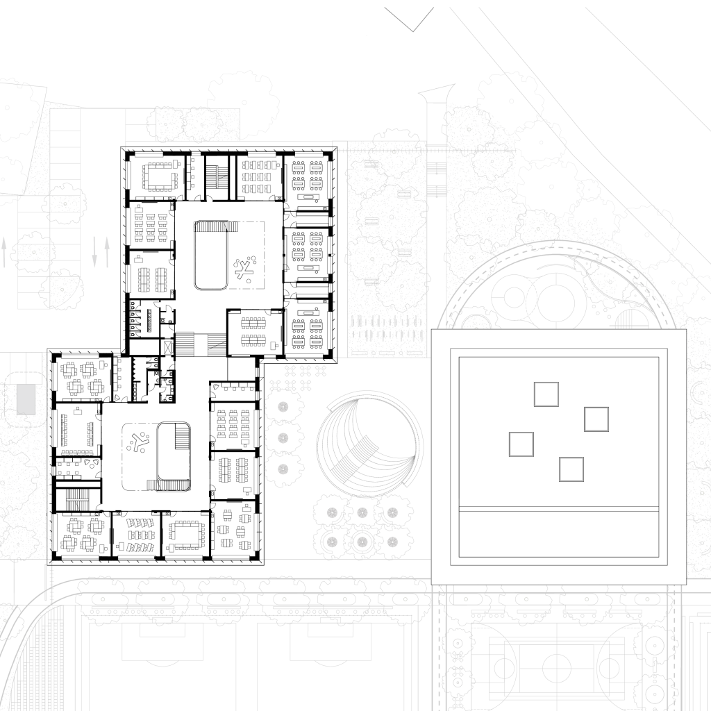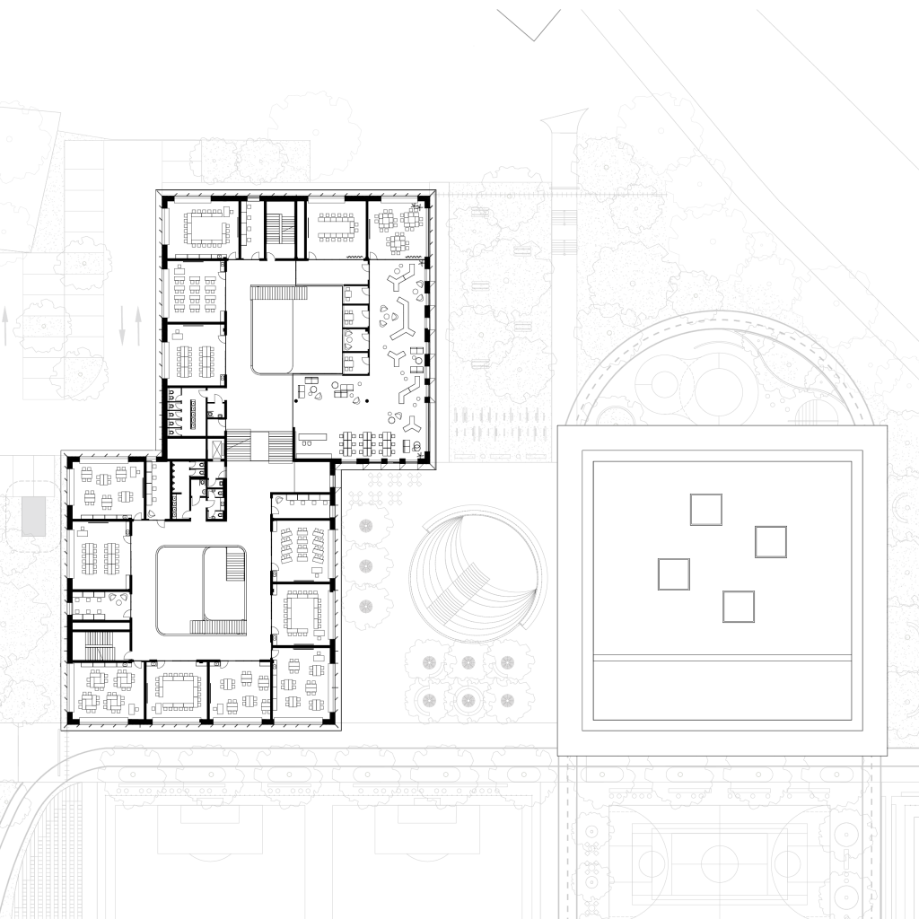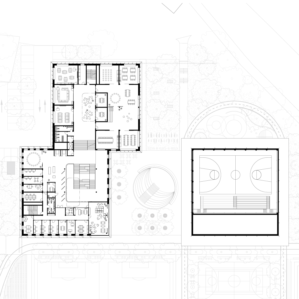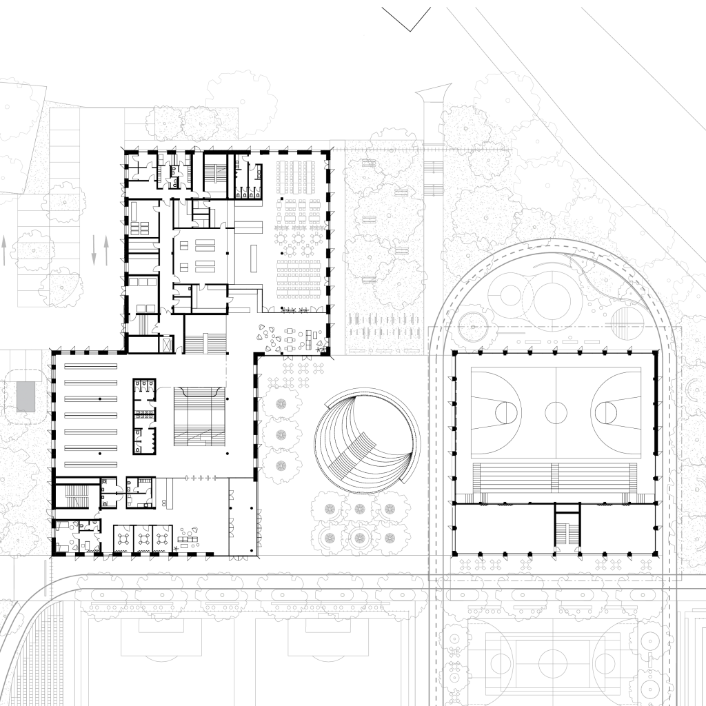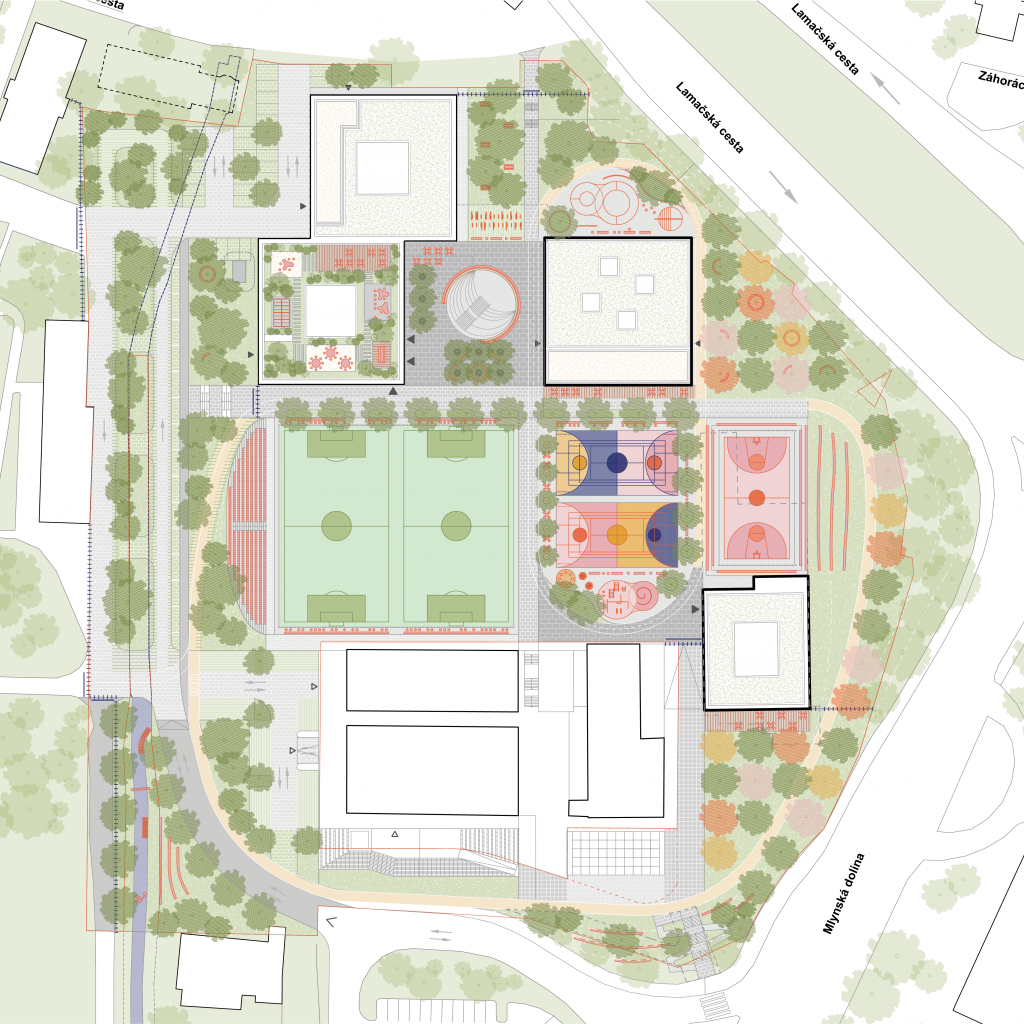 Urbanistická štruktúra umožňuje jednoduché uzavretie areálu počas vyučovania a naopak úplné otvorenie pre verejnosť po vyučovaní.