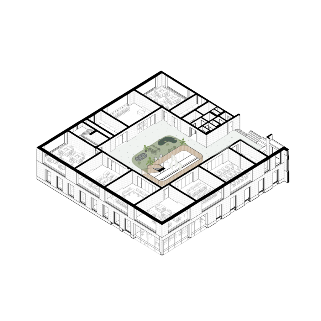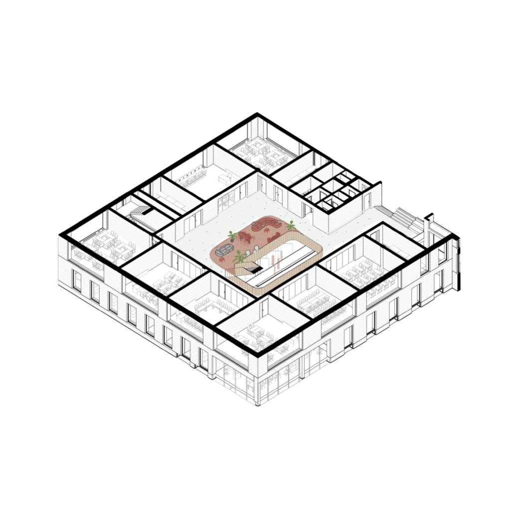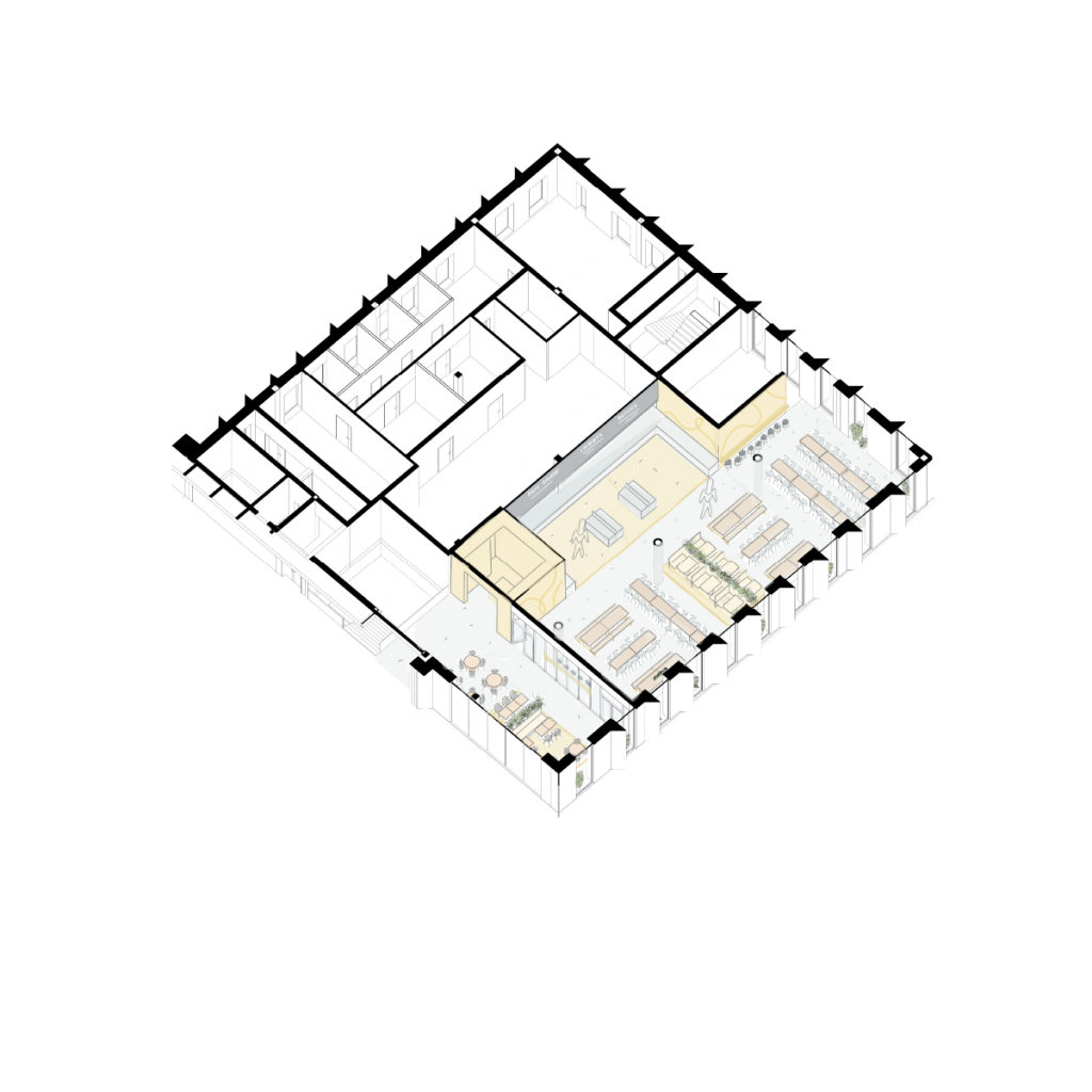 Po vstupe do budovy návštevníka víta átrium s dominantným schodiskom “grand theatre“. Prízemie obsahuje jedáleň s kaviarňou, administratíva sa nachádza na druhom poschodí, ktoré poskytuje aj priestor pre organizáciu eventov. Štvrtému poschodiu dominuje knižnica, prepojená so strešnou terasou.