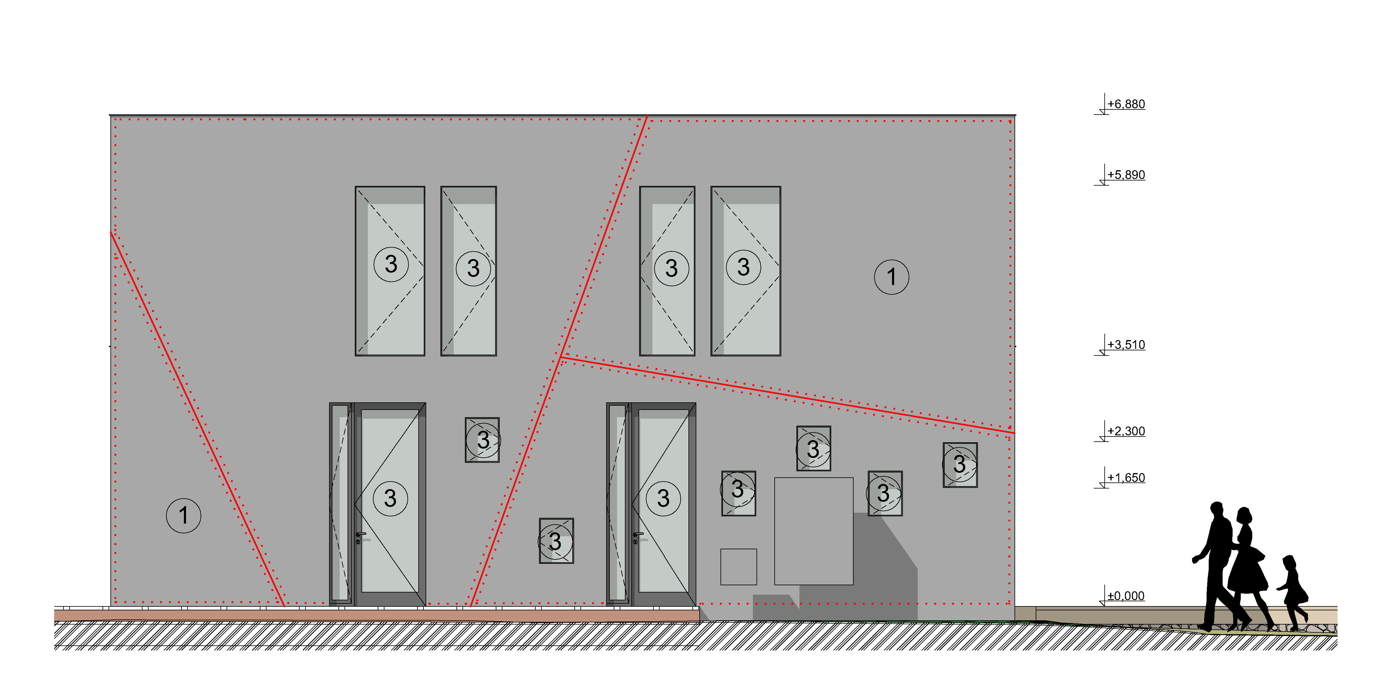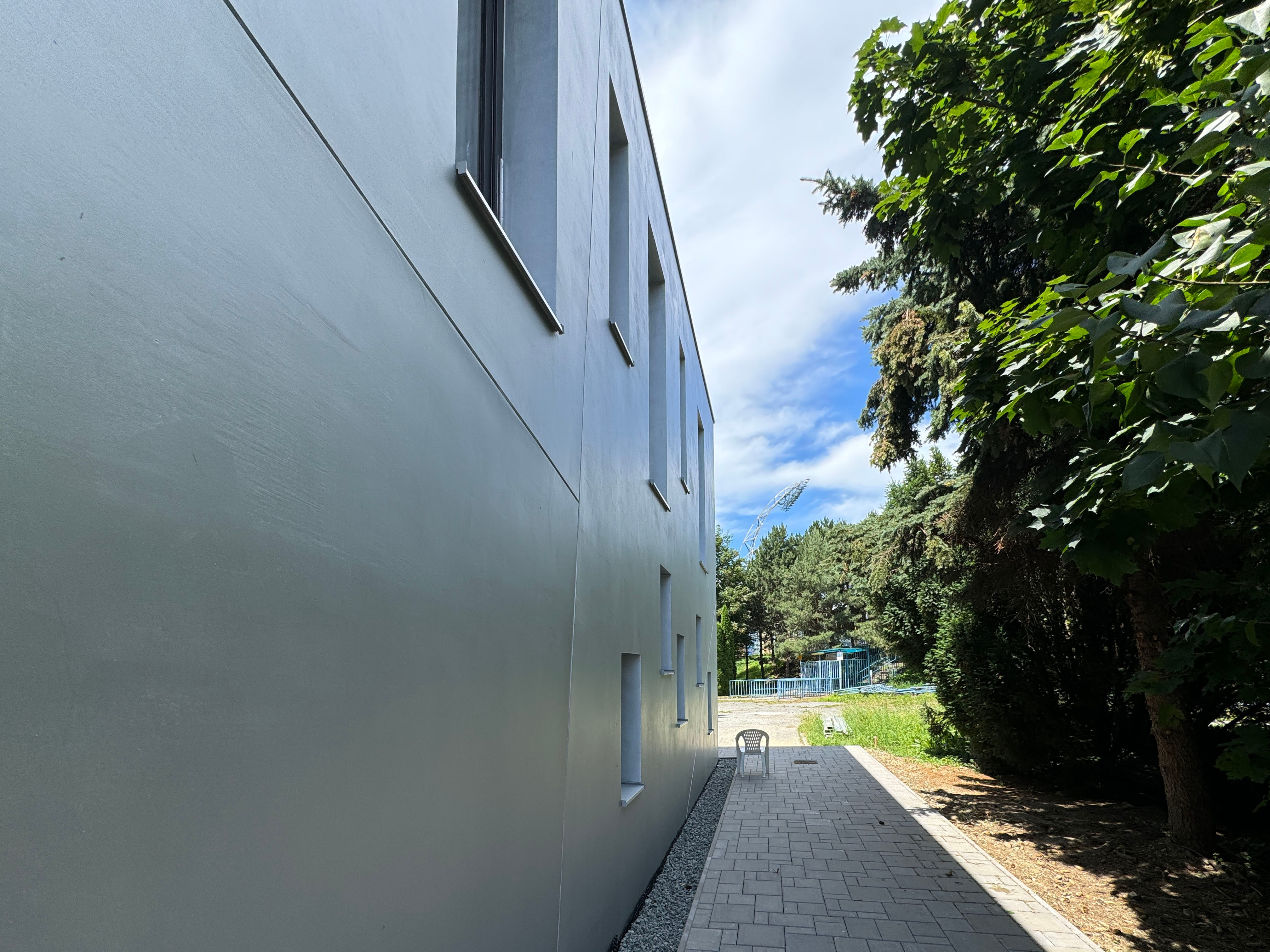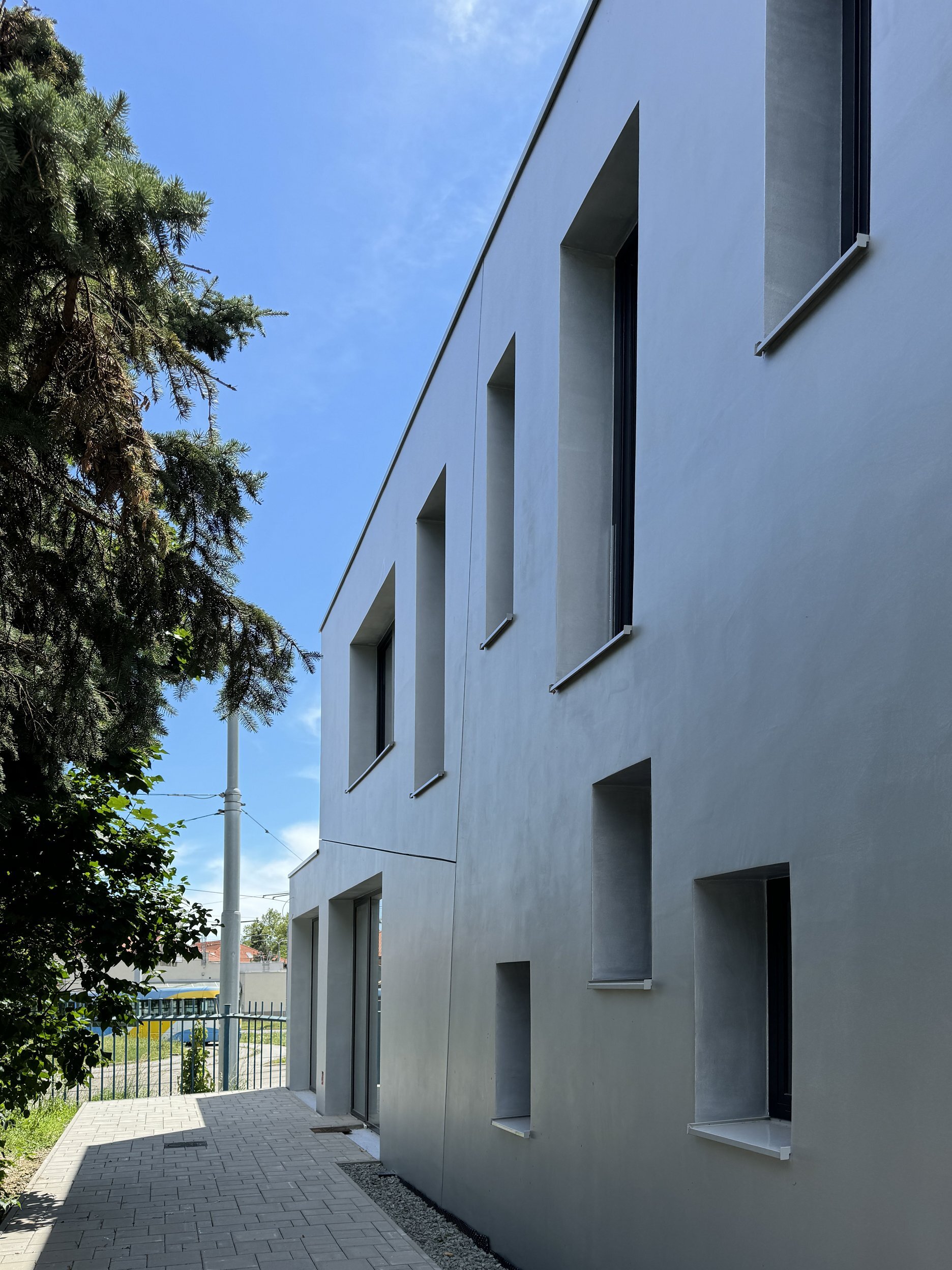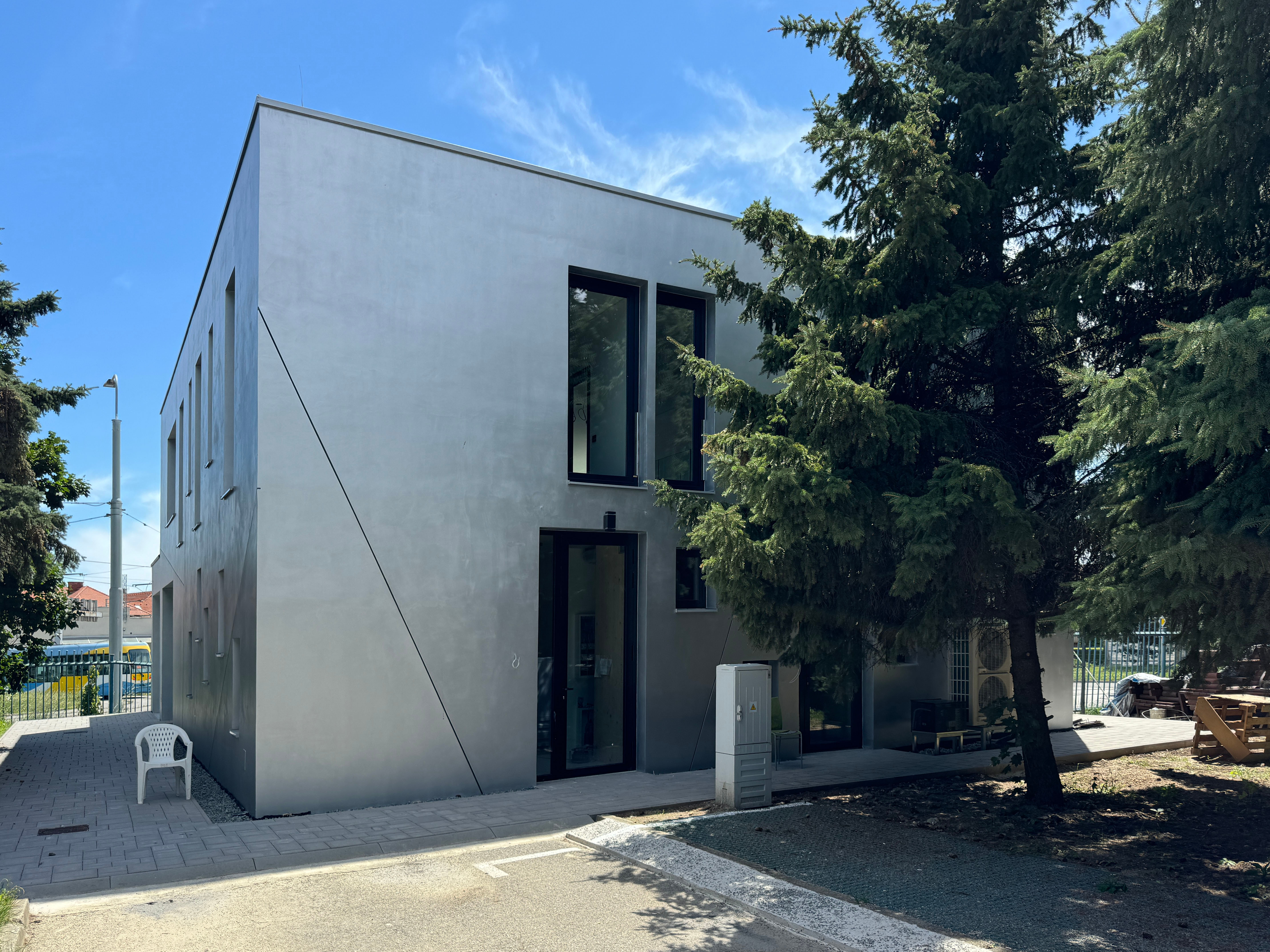 Nový objekt z CLT panelov, od začiatku koncipovaný ako drevostavba so zelenou strechou, nahradil pôvodnú krčmu v severovýchodnej časti pozemku.