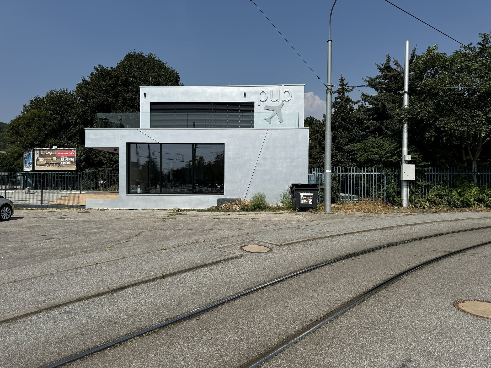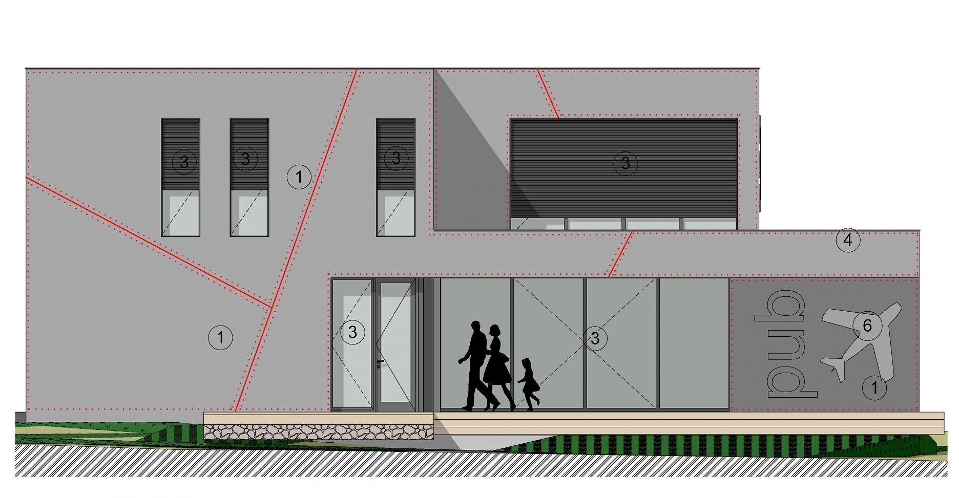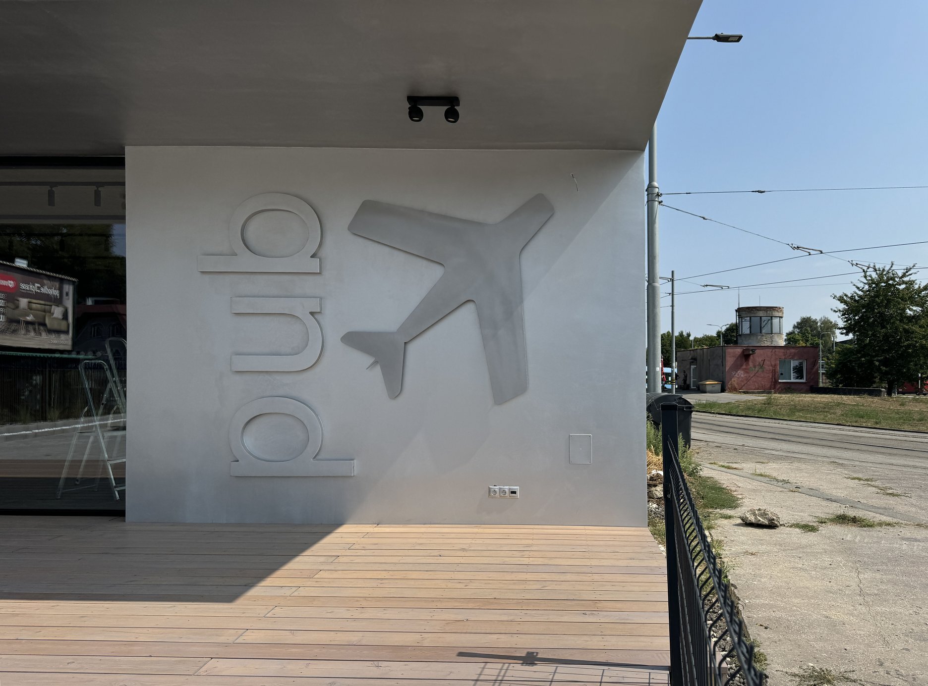 “Na tomto mieste kedysi stála búdka s občerstvením a na dobovej fotografii vidno aj ´tryskáč´ MiG-15. Chceli sme urobiť fasádu zo starého plechu, aký bol na hangároch a lietadlách, aby sme odkázali na stíhačku, ktorá tu stála a dala miestu meno. Plánujeme ešte pridať nity po škárach omietky,” približuje východiská návrhu architekt Marek Bakalár.