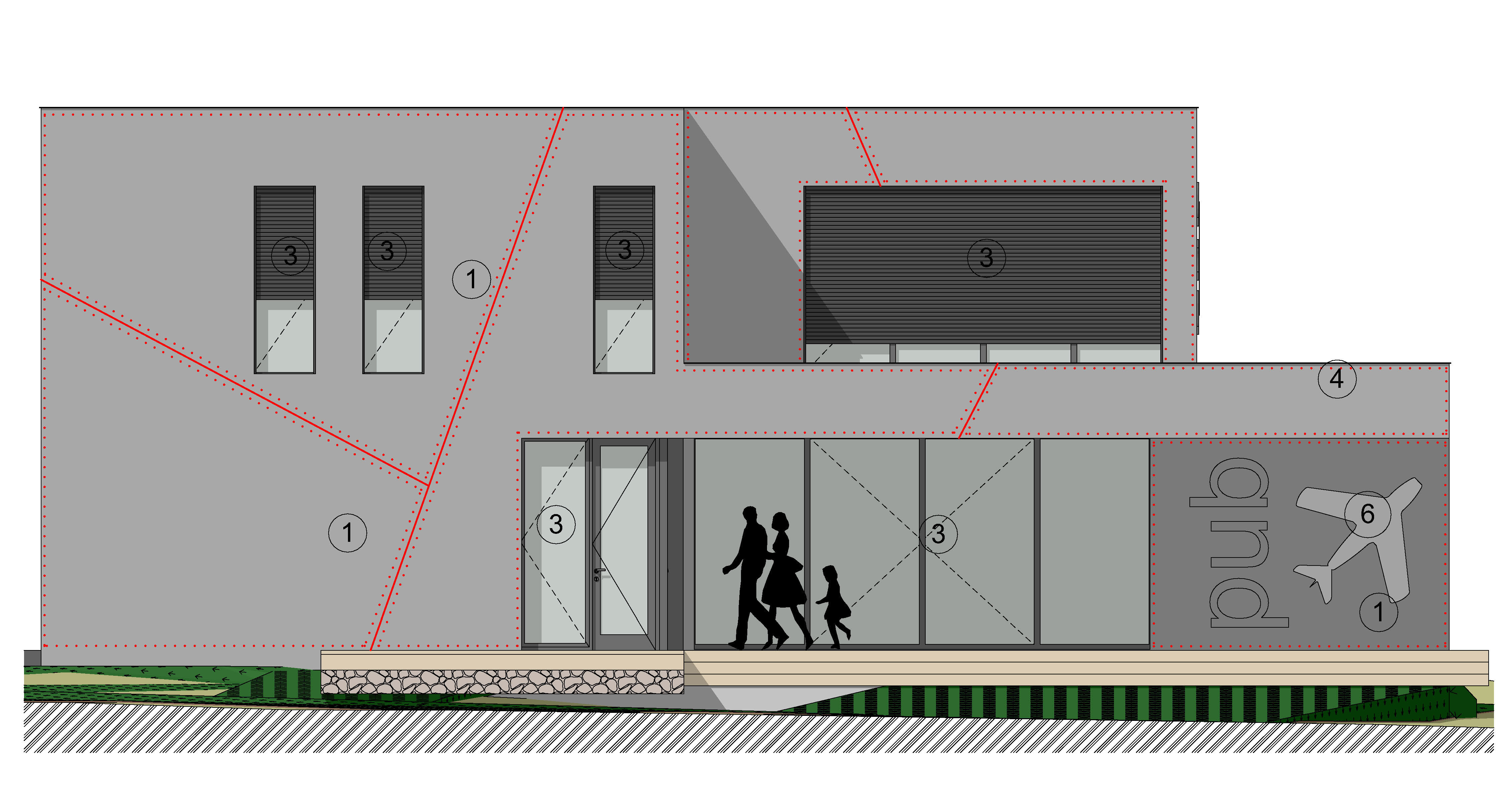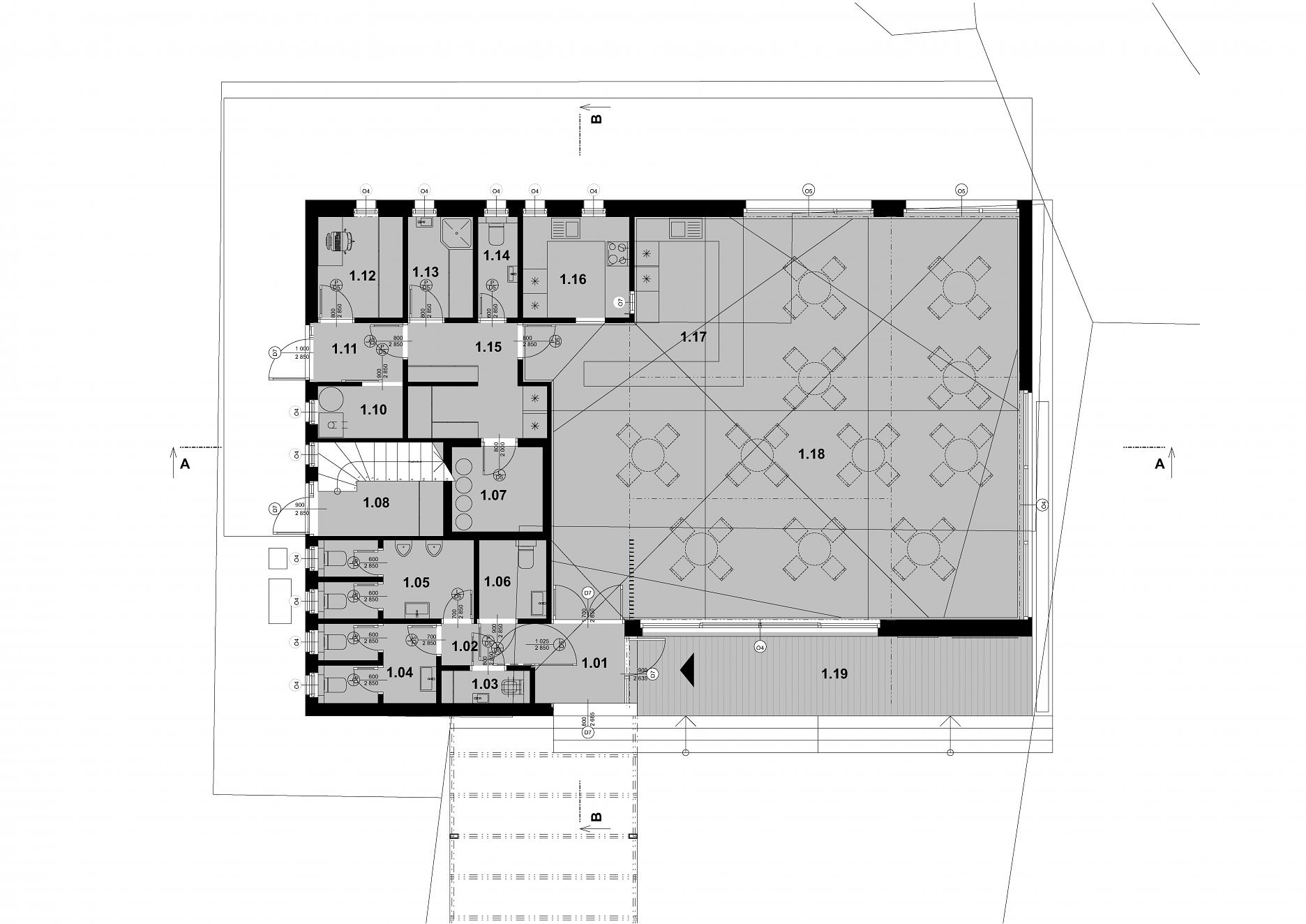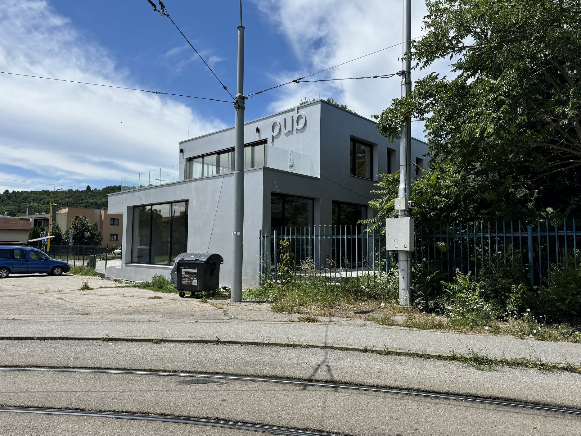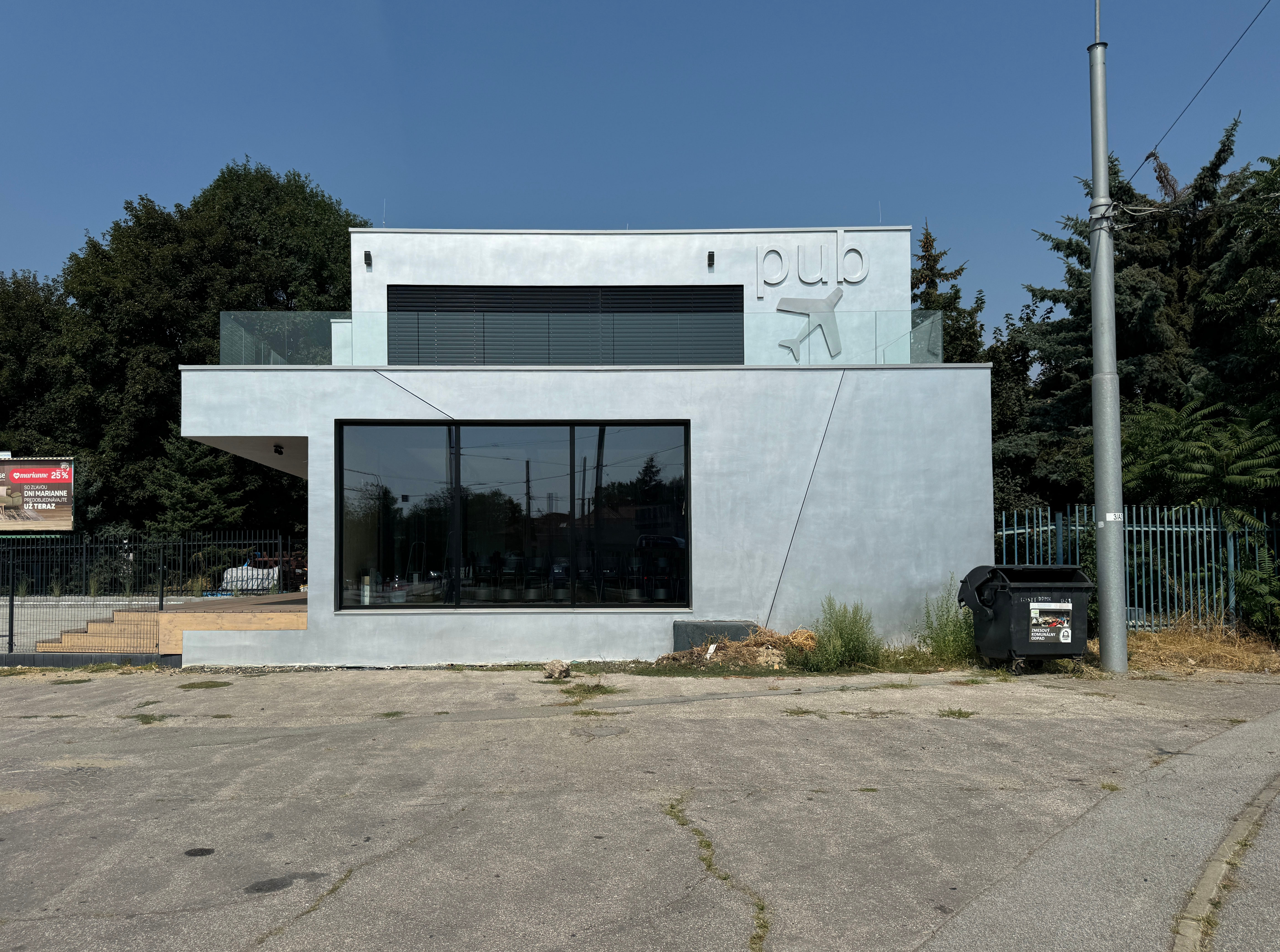 Na prízemí, prístupnom z juhozápadu, sa nachádza samotný pub s výdajným pultom, prípravňou a skladmi, doplnený o technickú miestnosť, šatňu a toaletu pre personál a hygienické zázemie pre návštevníkov. Pred vstupom sa rozprestiera krytá terasa, ktorá plynule prepája priestory pubu s exteriérom. Zo severozápadnej fasády vedie samostatné schodisko na ustúpené druhé podlažie s kanceláriami, zasadacou miestnosťou, kuchynkou a toaletou. Aj táto úroveň má plochú zelenú strechu, čo zlepšuje mikroklímu a znižuje energetickú náročnosť objektu.