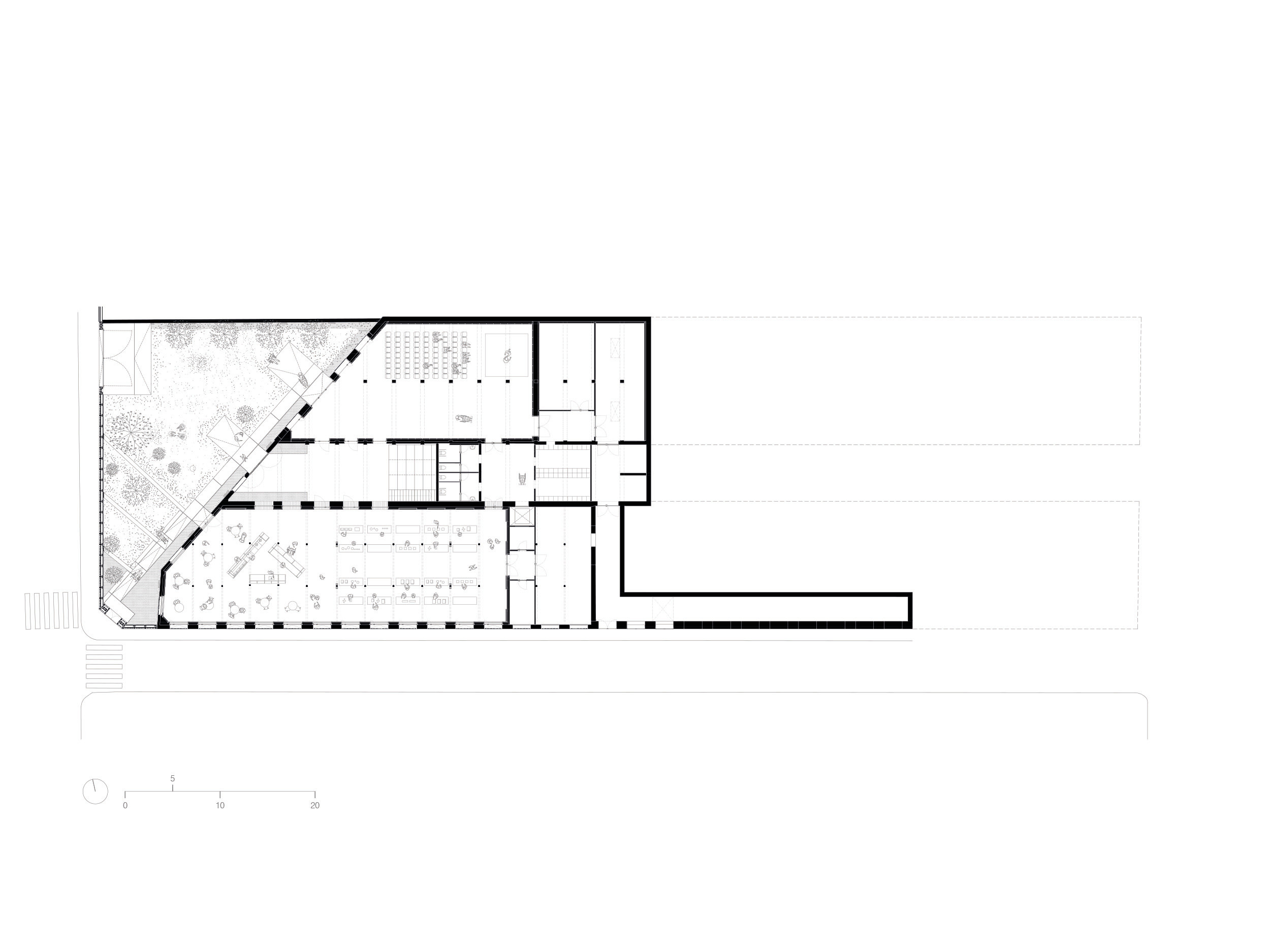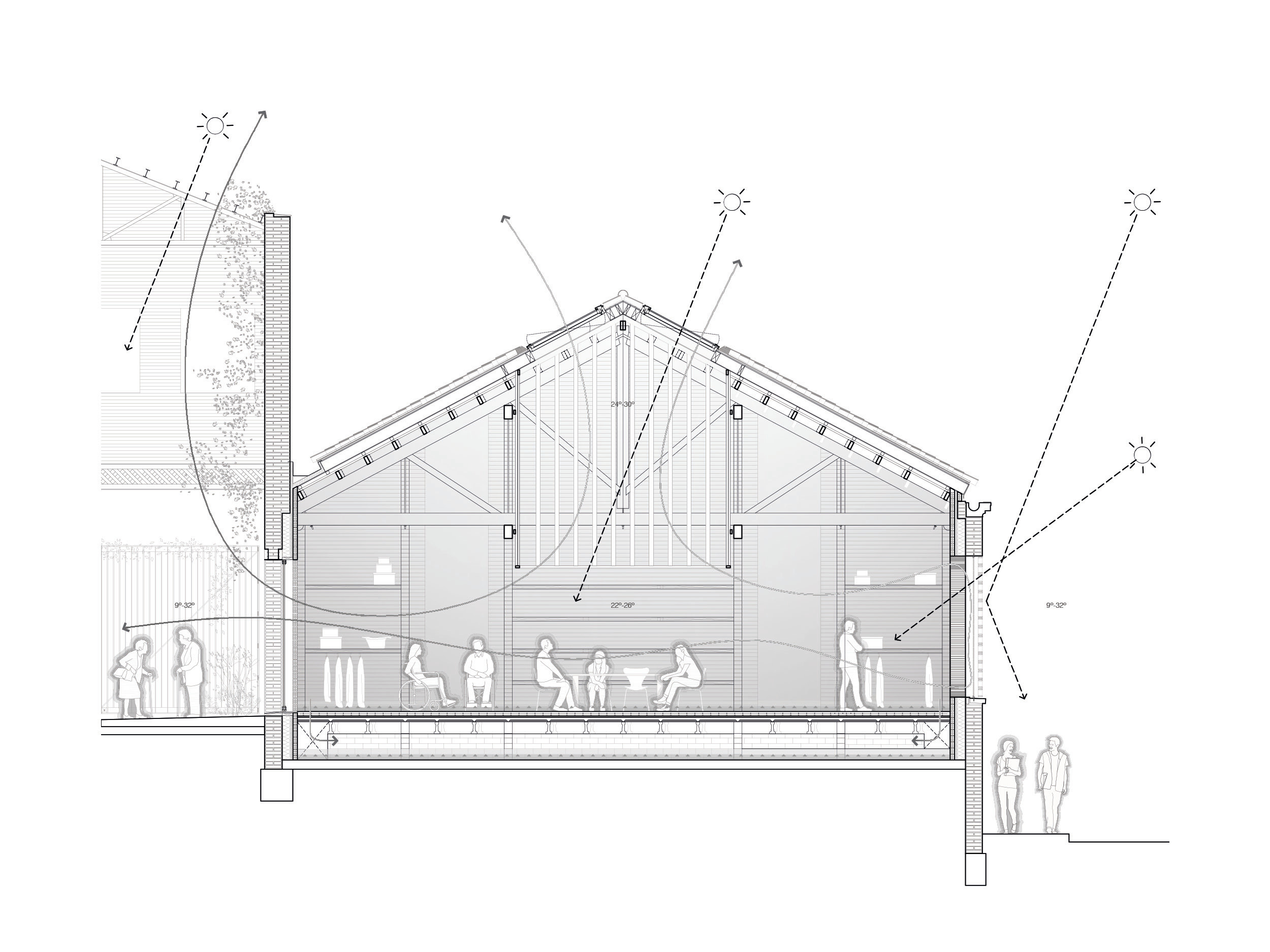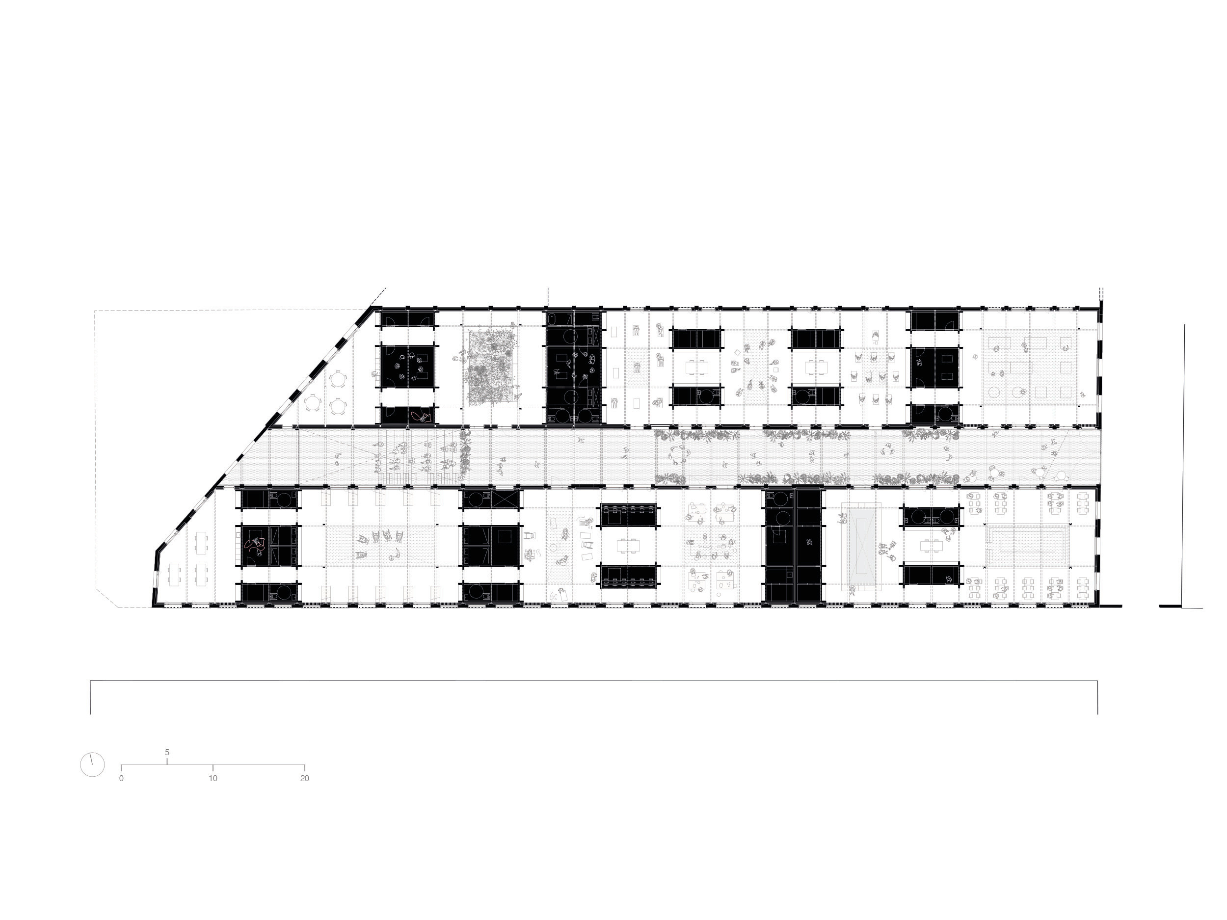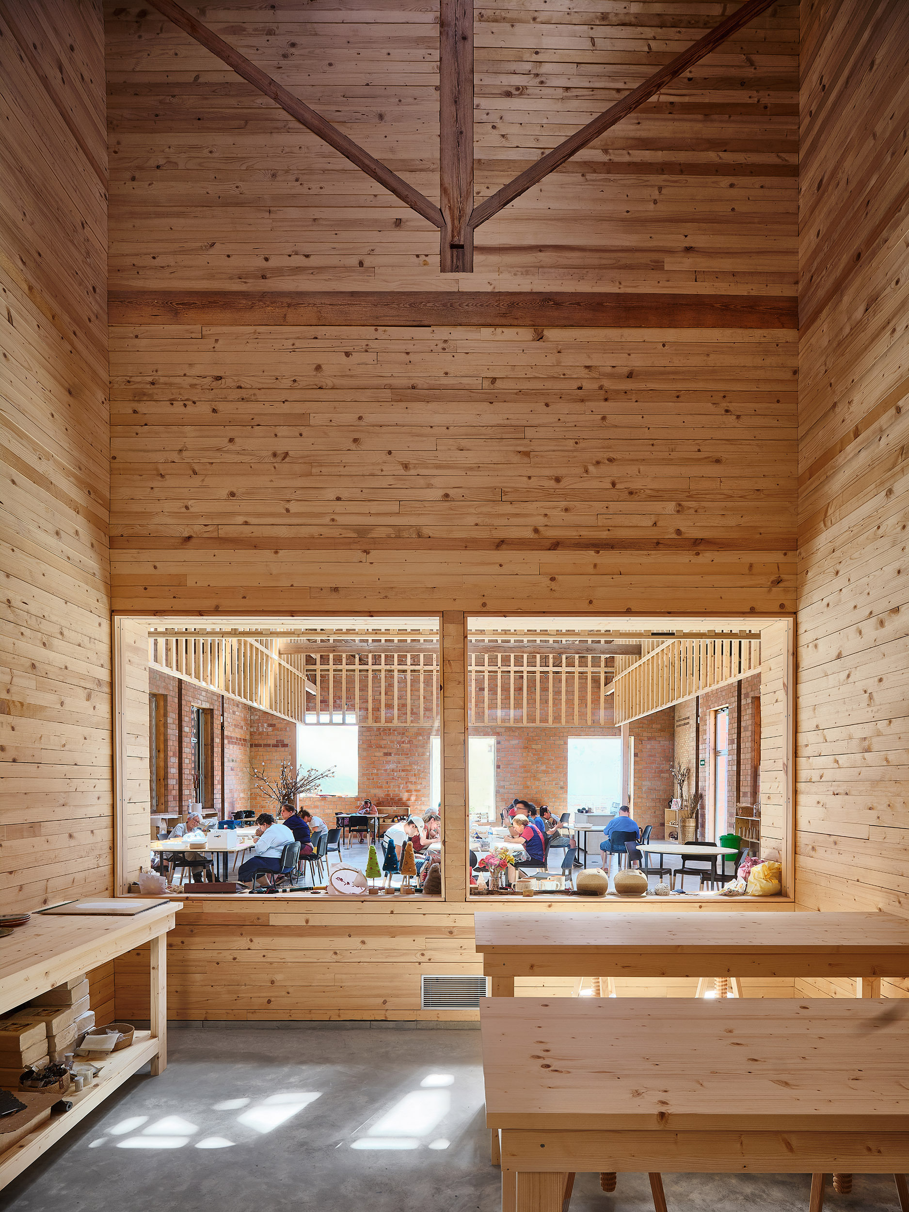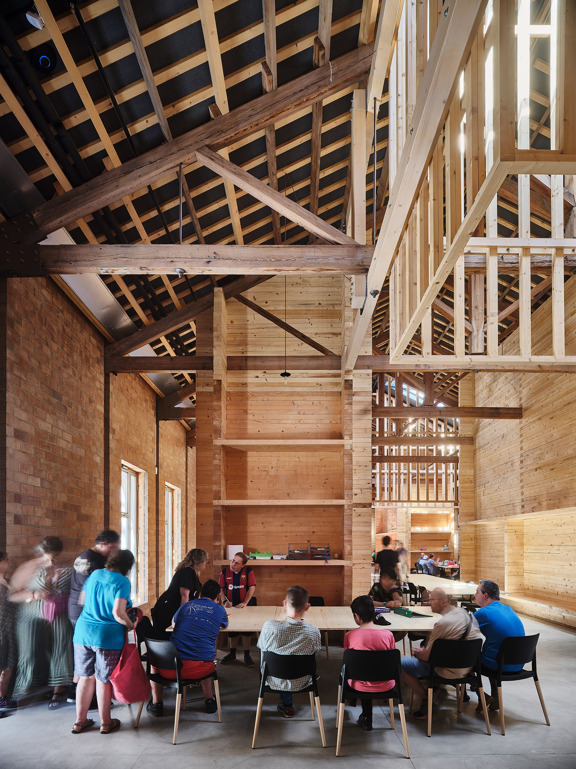 Po oboch stranách tejto osi plynú hlavné prevádzky, dielne, učebne, kuchyňa aj ďalšie obslužné priestory. Návrh pritom nevychádza iba z prevádzkovej logiky, ale aj z potreby stabilizovať a zachovať pôvodnú konštrukciu. Nové nosníky vložené kolmo na existujúce drevené väzníky skracujú ich rozpon a zároveň vytvárajú novú priestorovú osnovu, ktorá člení mestský interiér na väčšie a menšie celky.