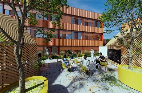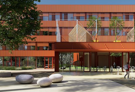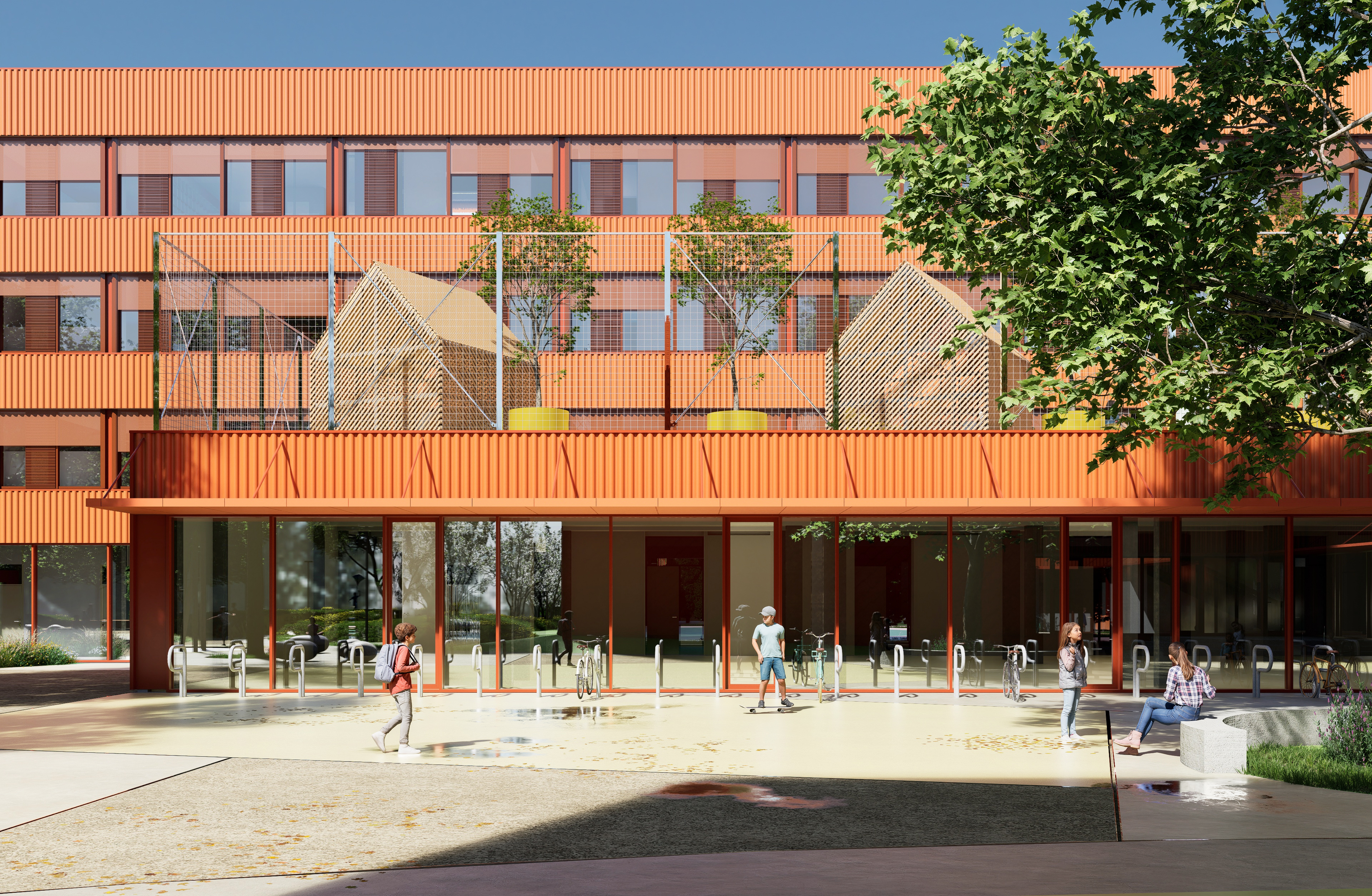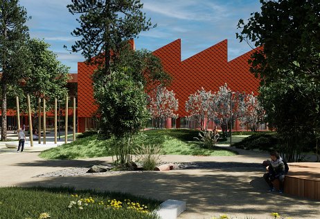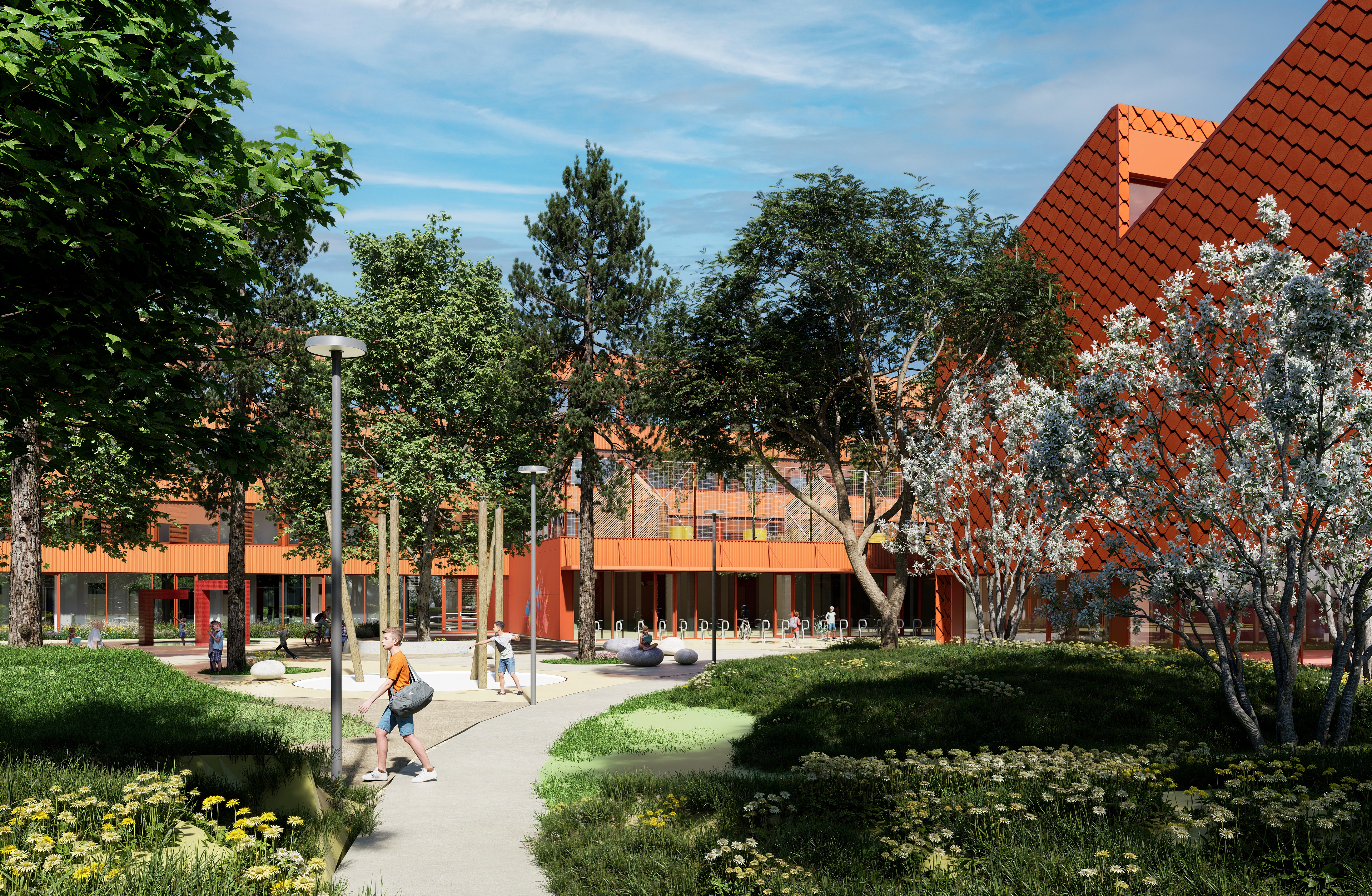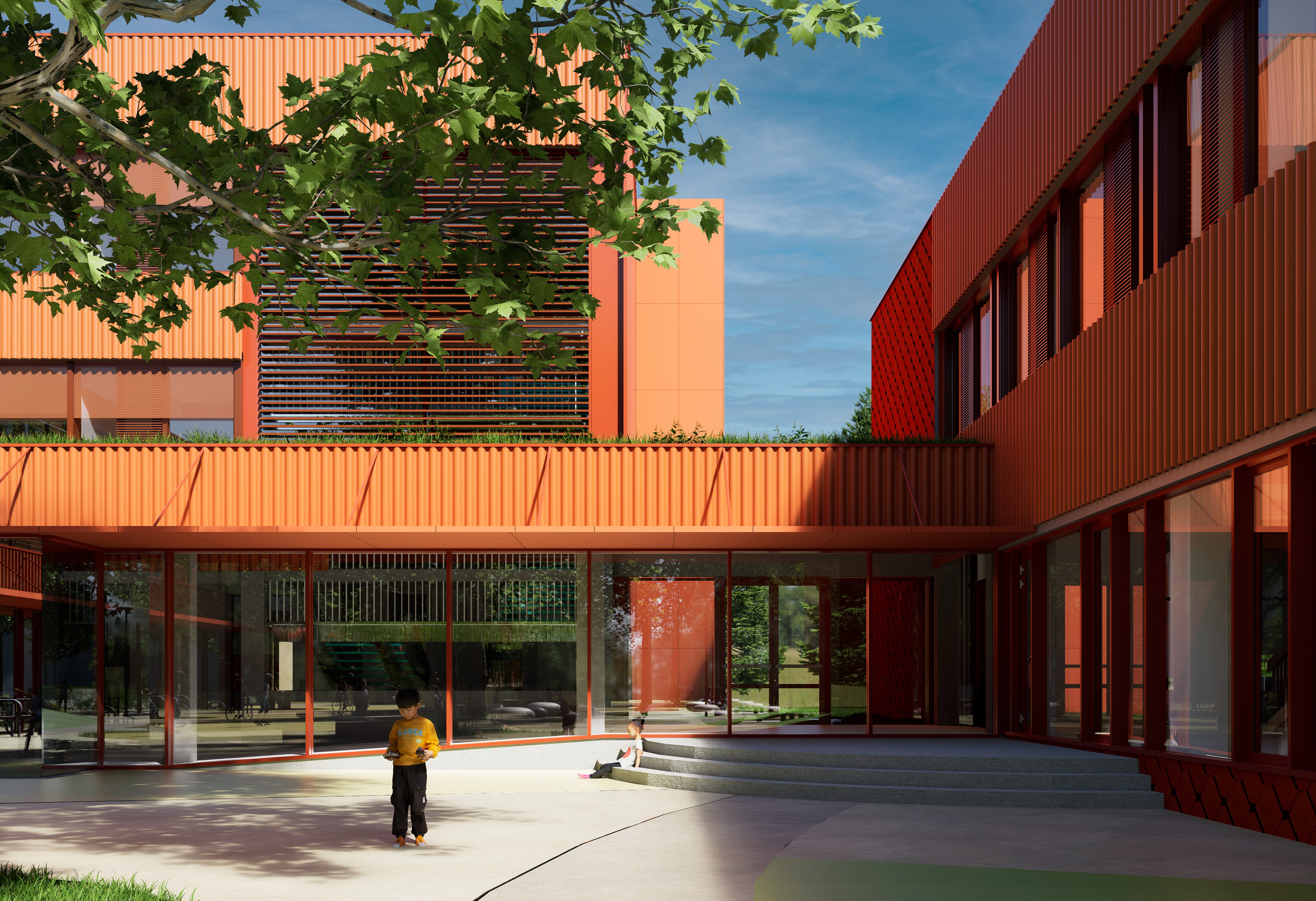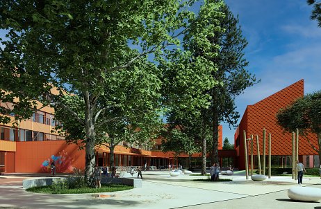 Areál prejde taktiež komplexnou rekonštrukciou. Existujúce uzavreté priestory nahradí aktívny zelený školský park. Pred vstupom do školy vznikne nové školské námestie s vodnými prvklami a celý areál sa maximálne otvorí pre obyvateľov z celého územia, čím sa zo školy stane nové aktívne centrum. Tým sa potvrdí naše presvedčenie, že moderné školské budovy sa majú otvárať do okolia a komunite, a je potrebné, aby sa stali akýmisi urbanistickými centrami pre všetkých obyvateľov. Podľa nášho názoru by súčasné školy nemali patriť len žiakom, ale mali by sa stať akýmsi všeobecným vlastníctvom obyvateľov svojho okolia.