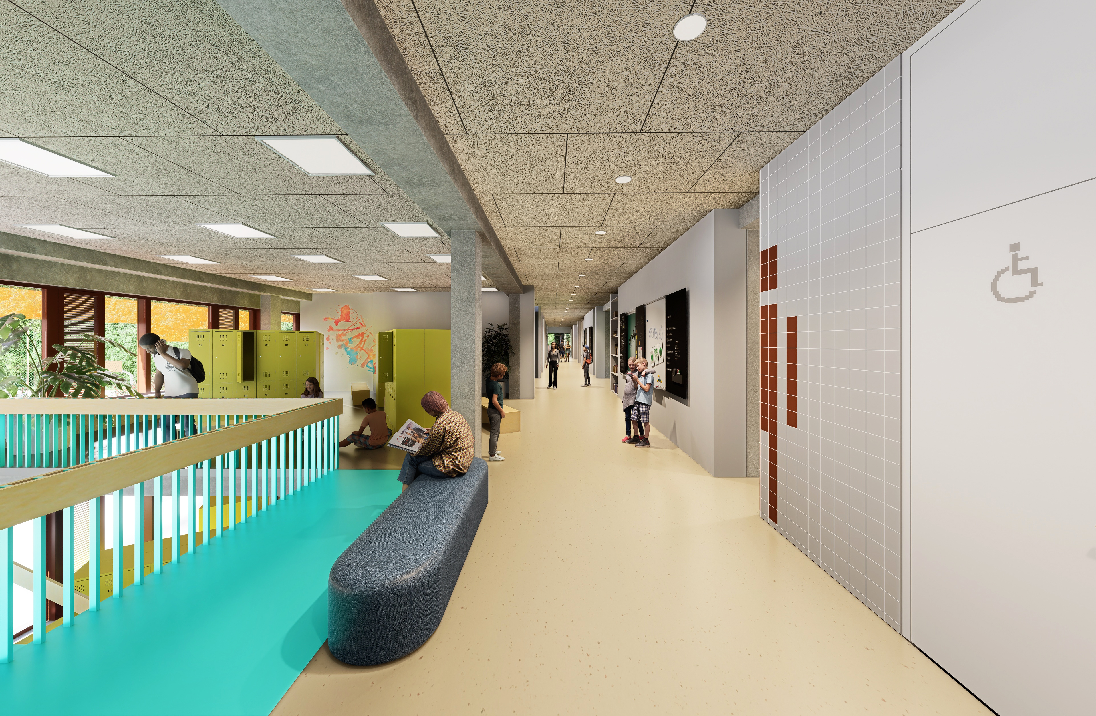 Interiér je riešený maximálne funkčne a ekologicky. Vyhýbali sme sa zbytočným nánosom omietok a bezvýznamným úpravám, povrchy zachovávame maximálne v ich pôvodnom výzore pri zachovaní funkčnosti. Betónový skelet spolu s novými prefabrikátmi chceme priznať v jeho pôvodnej kráse. Pôvodné murované steny zachovávame v ich tehlovej štruktúre bez omietok, len so zakonzervovaním a praktickou maľovkou. Všetky povrchy sú maximálne funkčné a bez zbytočných výstrelkov. Drevo nech je drevo, betón nech je betón, akustická drevená vlna nech je prirodzená. Chceme, aby ekológia bola postavená na racionalite. Každú novú vrstvu sme v projekte dôsledne zvážili, prehodnotili a až potom umiestnili. Prioritou je funkčnosť, ekológia a priestor pre výučbu. Pri verejnej budove, akou je škola platená z verejných financií, je podľa nášho názoru absolútne podstatné, aby bol tento princíp zachovaný.