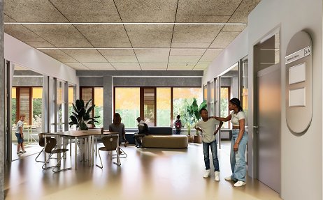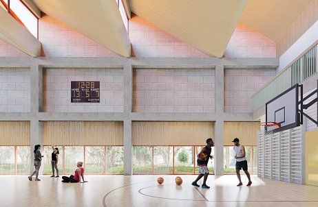 Kompletnou premenou prejde aj v súčasnosti staticky nevyhovujúca telocvičňa. Pôvodnú konštrukciu nahradí nová moderná drevostavba s pílovou strechou, ktorá okrem presvetlenia ponúka aj prirodzené vetranie. Zároveň sa telocvičňa otvára do zrekonštruovaného areálu školy.
