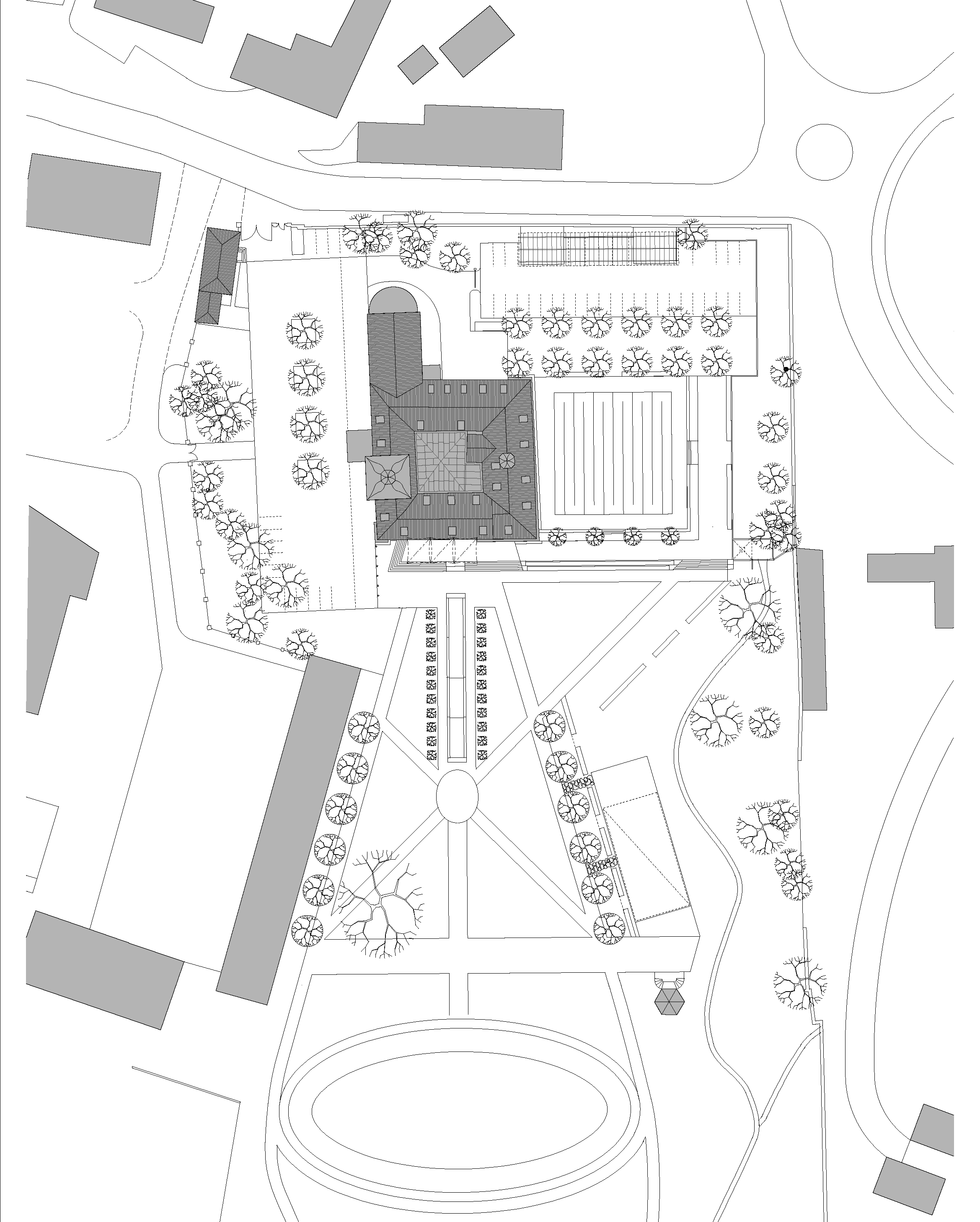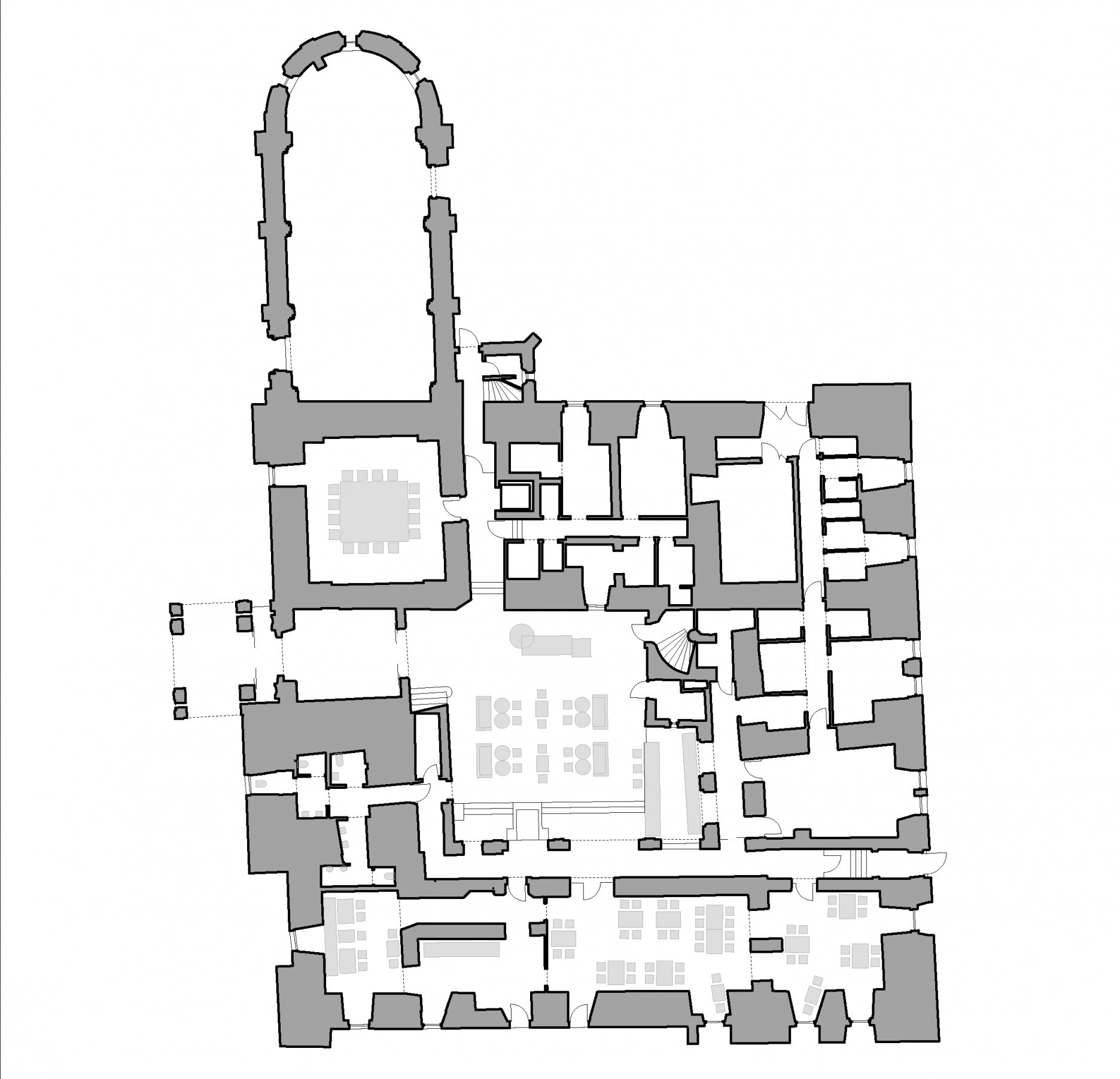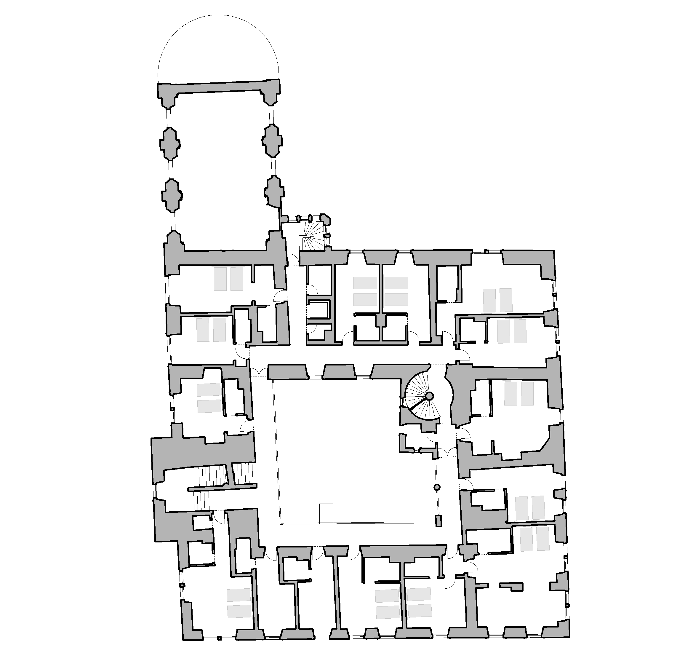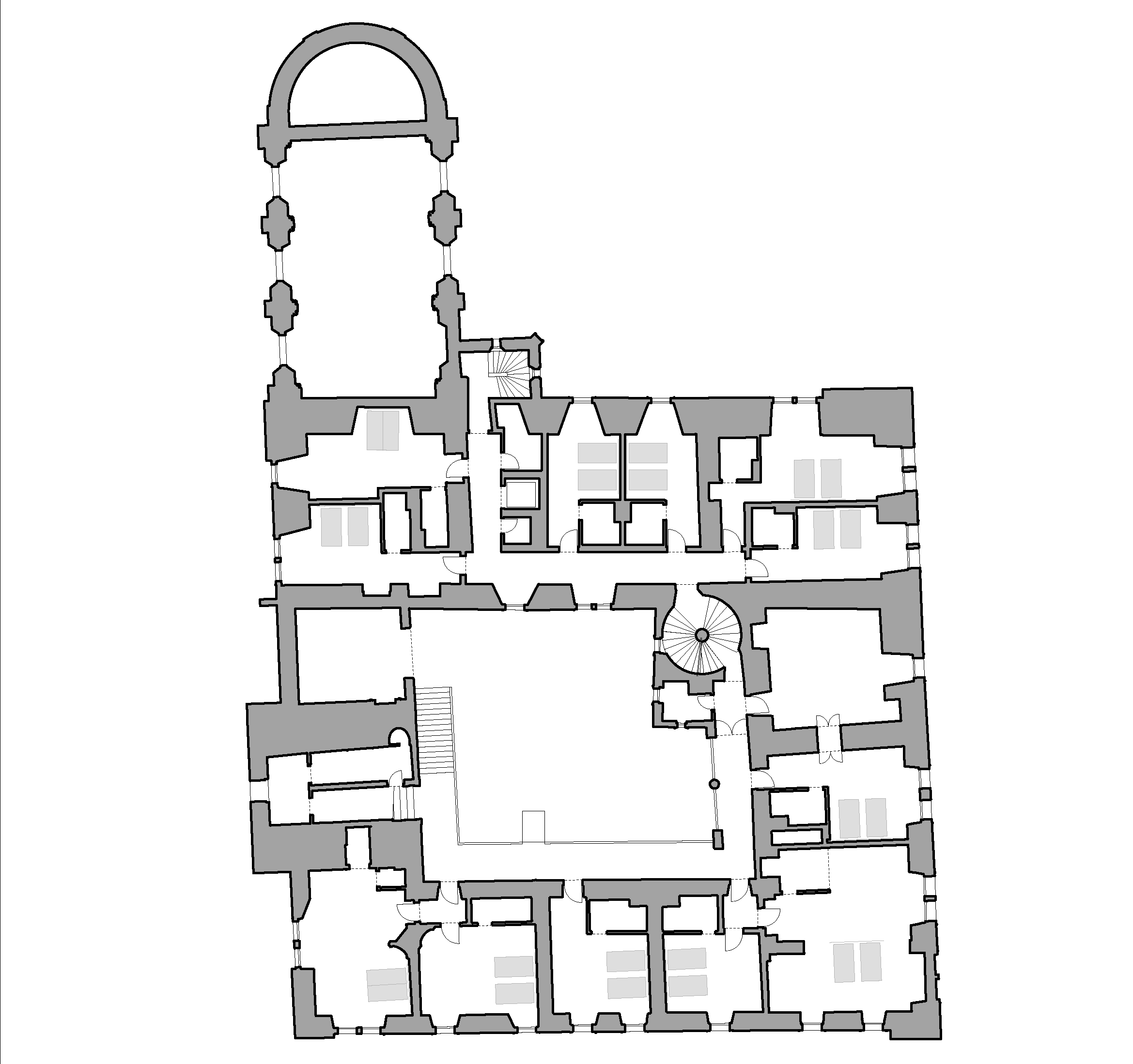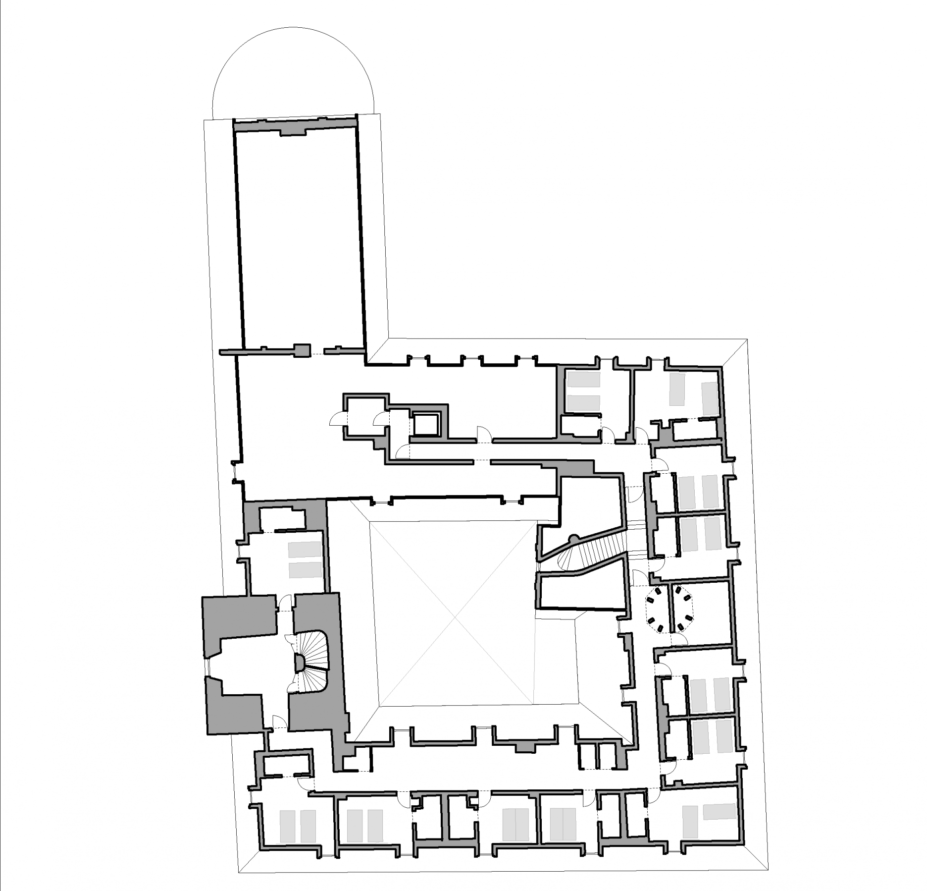 Všetky funkcie hotela sú situované v rámci pôvodných stavebných objektov. K tomuto riešeniu prispelo prestrešenie pôvodne otvoreného nádvoria, ktoré môže byť v súčasnej podobe celoročne využívané. Subtílna konštrukcia presklenej stanovej strechy je umiestnená nad úroveň korunnej rímsy.