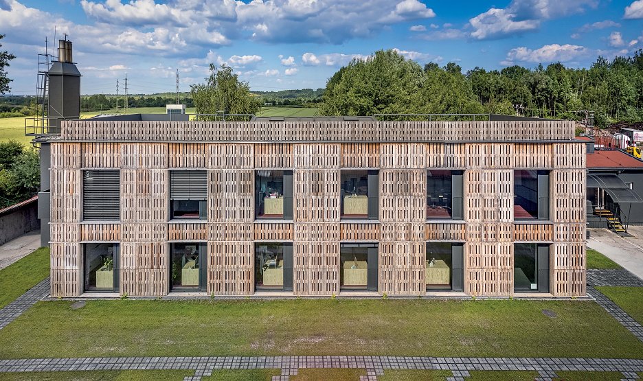 Administratívna budova v priemyselnom areáli výrobcu stavebných hmôt a chémie. Projekt priamo nadväzuje na susedné stavby, vrátane pôvodných kancelárií v objekte z unimobuniek. Architektonické riešenie zároveň počíta s jeho samostatným fungovaním v prípade ich odstránenia. "Investor požadoval v co možná největší míře ekologicky a cenově úsporný model budovy s využitím recyklovatelných materiálů," objasňuje zadanie architekt David Kotek. Strechy oceľového skeletu sú preto ozelenené a obklad fasády tvoria vyradené palety, ktoré zároveň slúžia ako rošt pre popínavé rastliny.