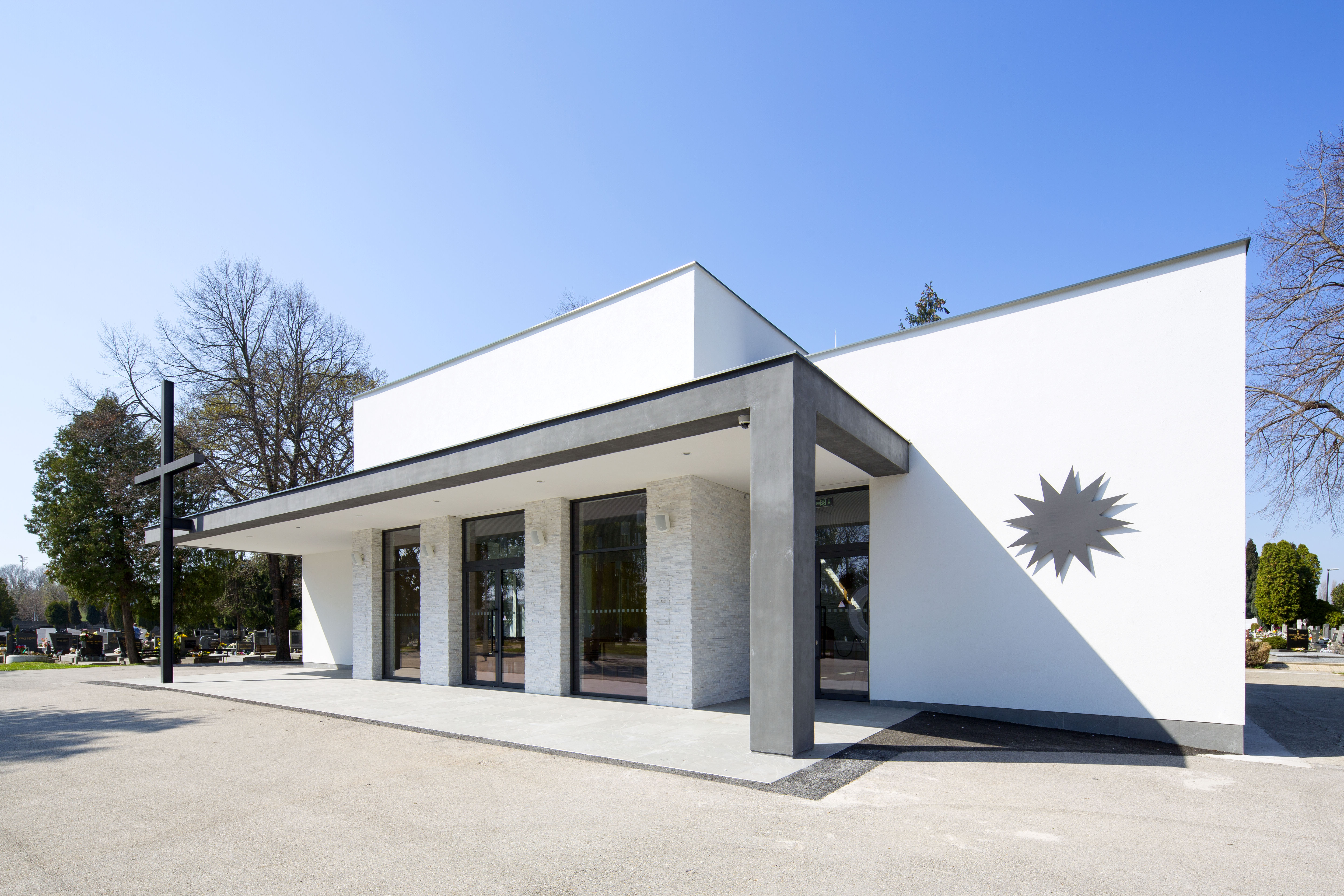 Kompozícia stavby je založená na adícii objemov radených okolo prevýšenej obradnej sály. Dominantné postavenie má symetrické priečelie domu smútku, komponované na os vstupnej komunikácie cintorína. V zadnej, obslužnej časti objektu bolo realizované množstvo neskorších zásahov (napríklad dostavba toaliet…). Úpravy sa dotkli aj čelnej fasády, celkový charakter stavby však zostal zachovaný.