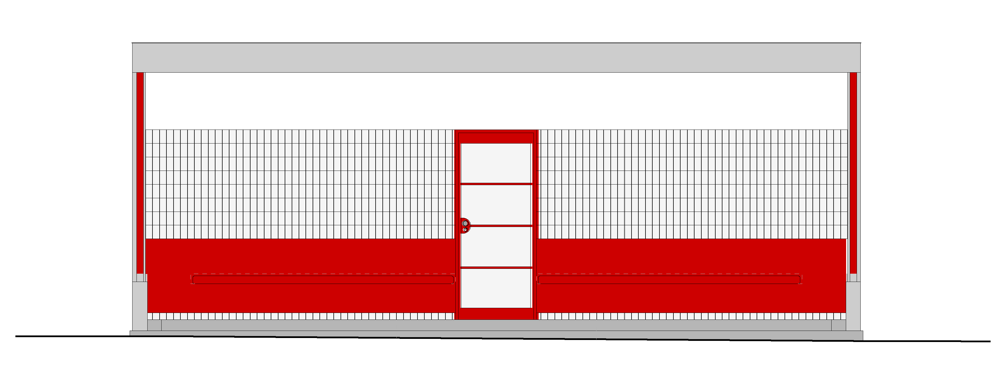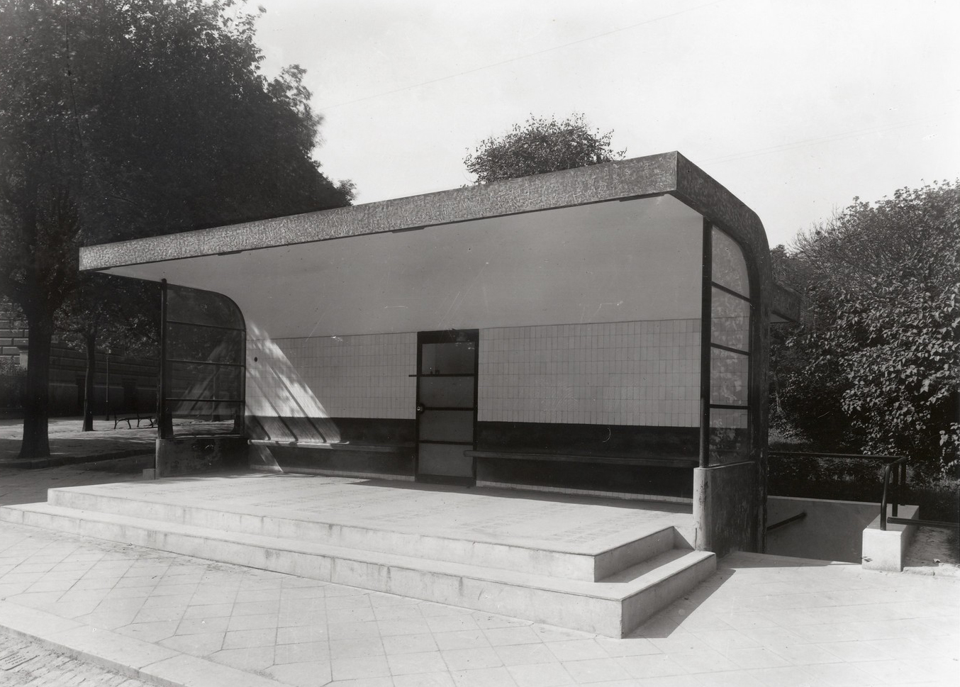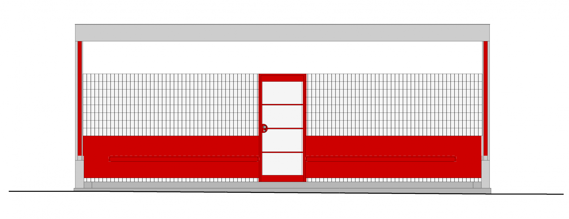 V prístrešku je inštalovaná konzolová lavica z červeného umelého kameňa. Stena nad lavicou je obložená obkladačkami z opaxitového skla s pôvodným formátom. Do podlahových stupňov s povrchom z brúseného umelého kameňa sú vložené sklobetónové tvárnice a dilatačné mosadzné pásiky.