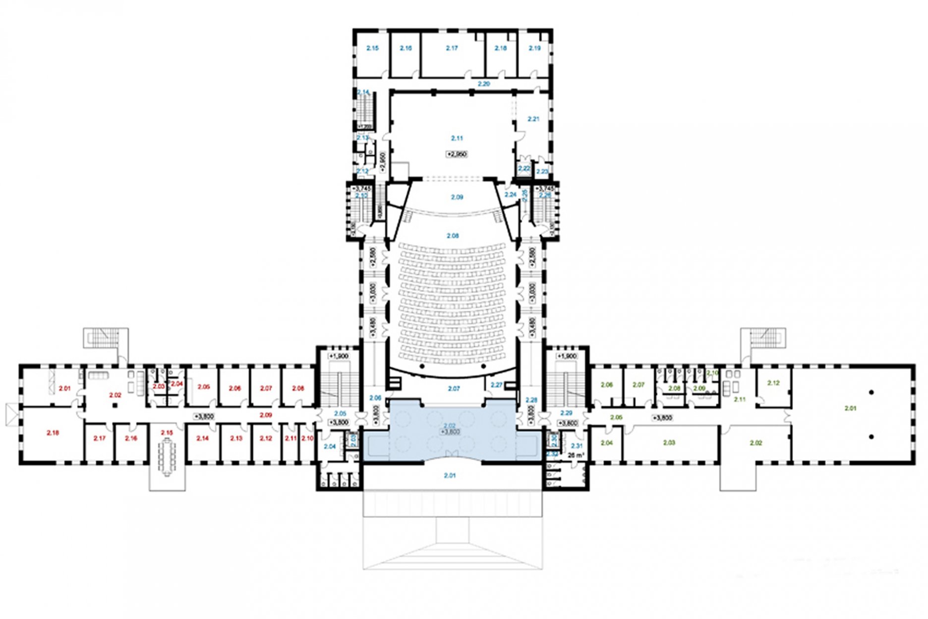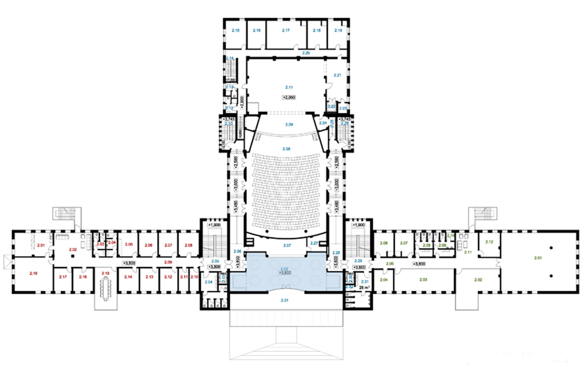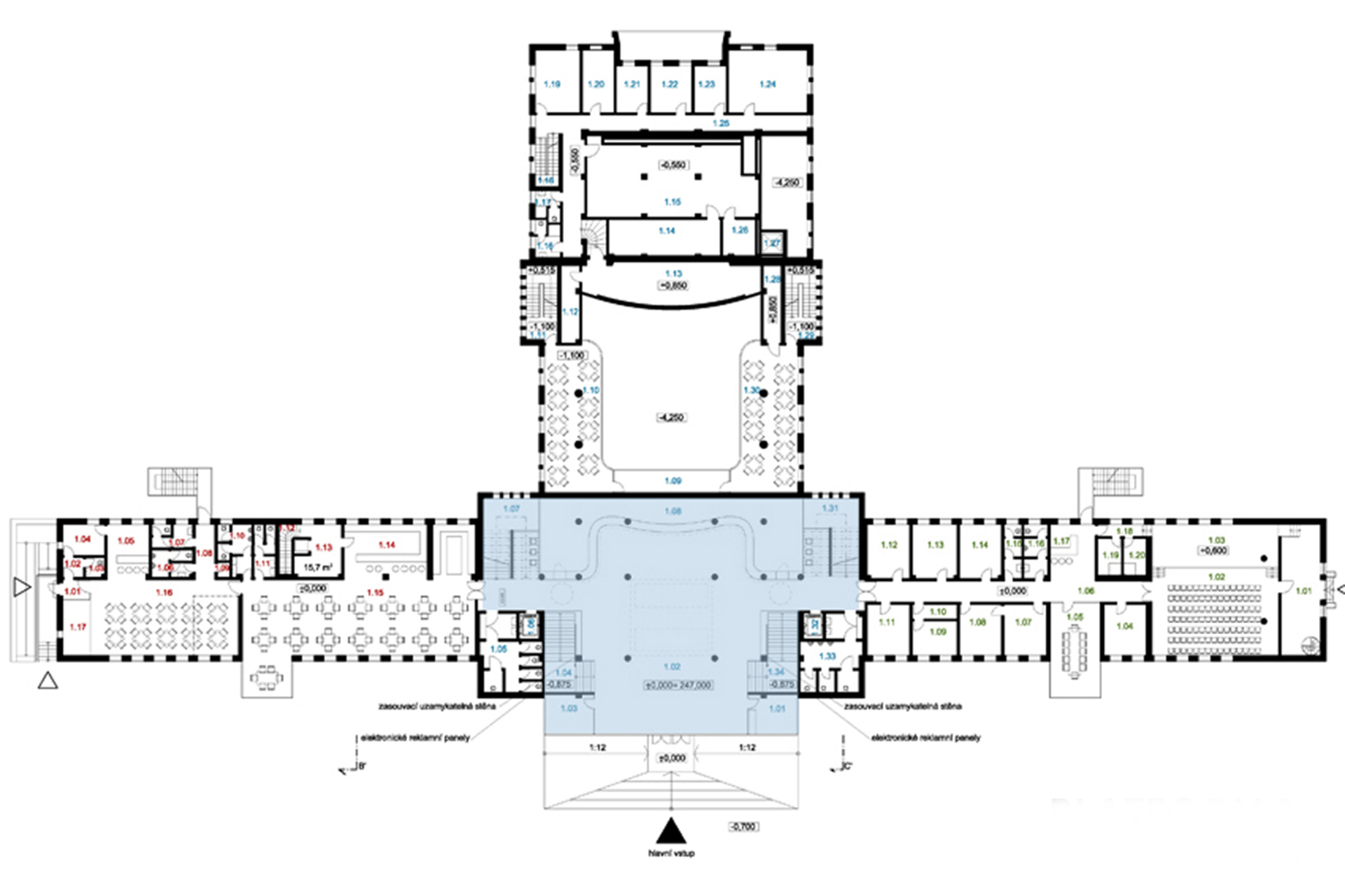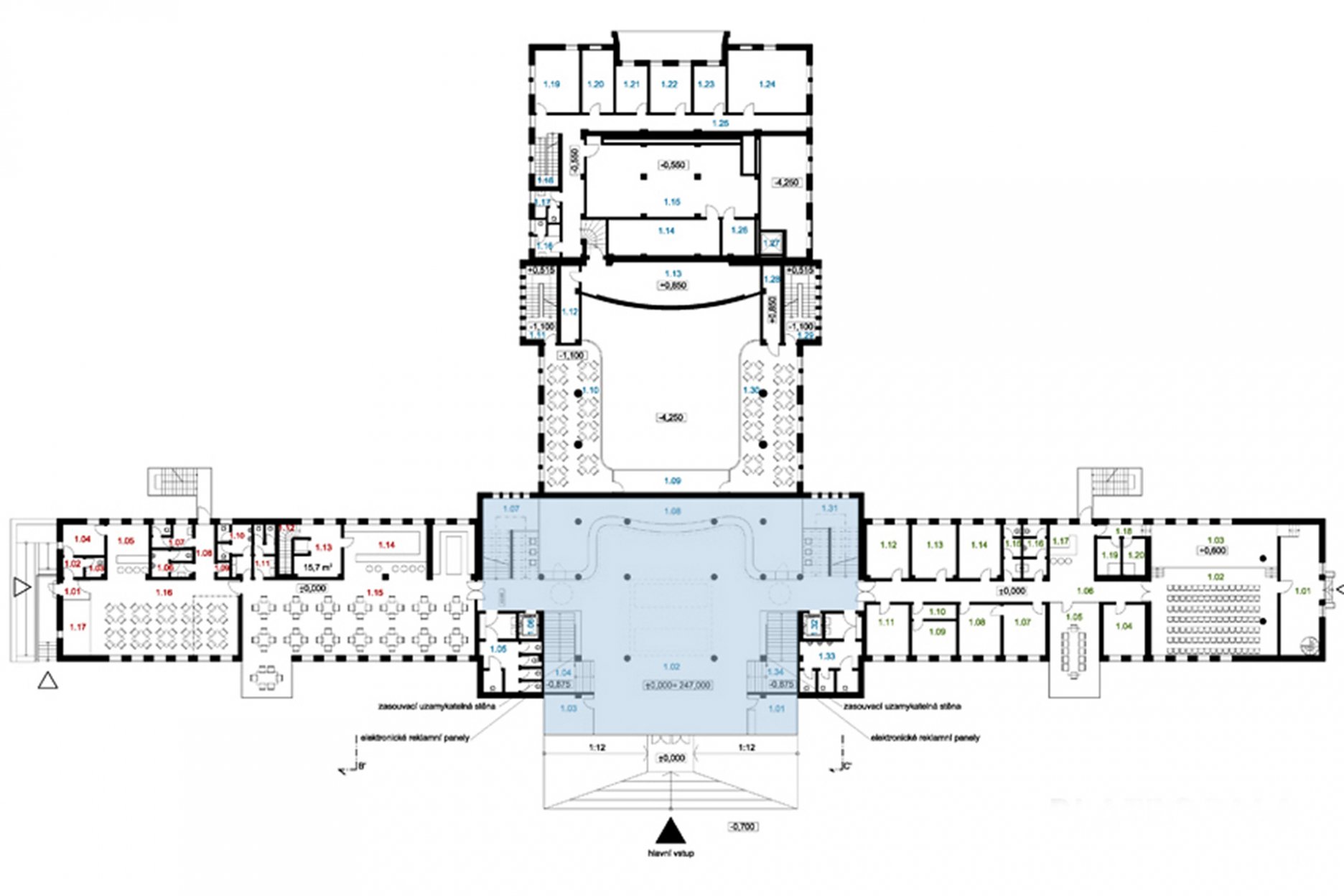 Pôvodné vstupy v bočných krídlach, rovnako ako vnútorné schodiská nahradili výraznejšie transparentné hmoty, riešené vo väzbe na vstupnú zasklenú fasádu.