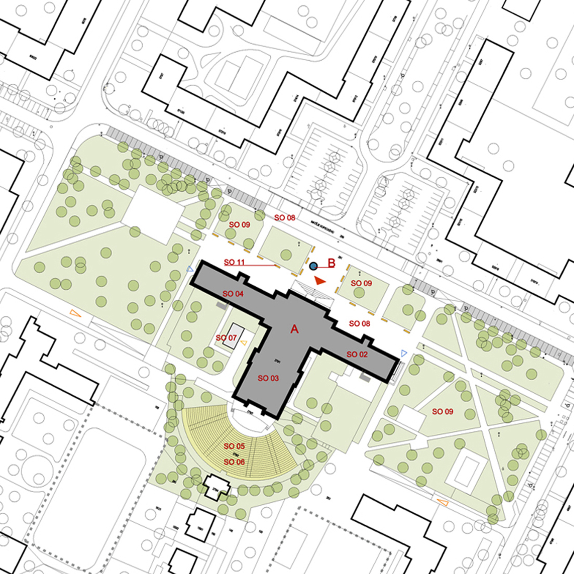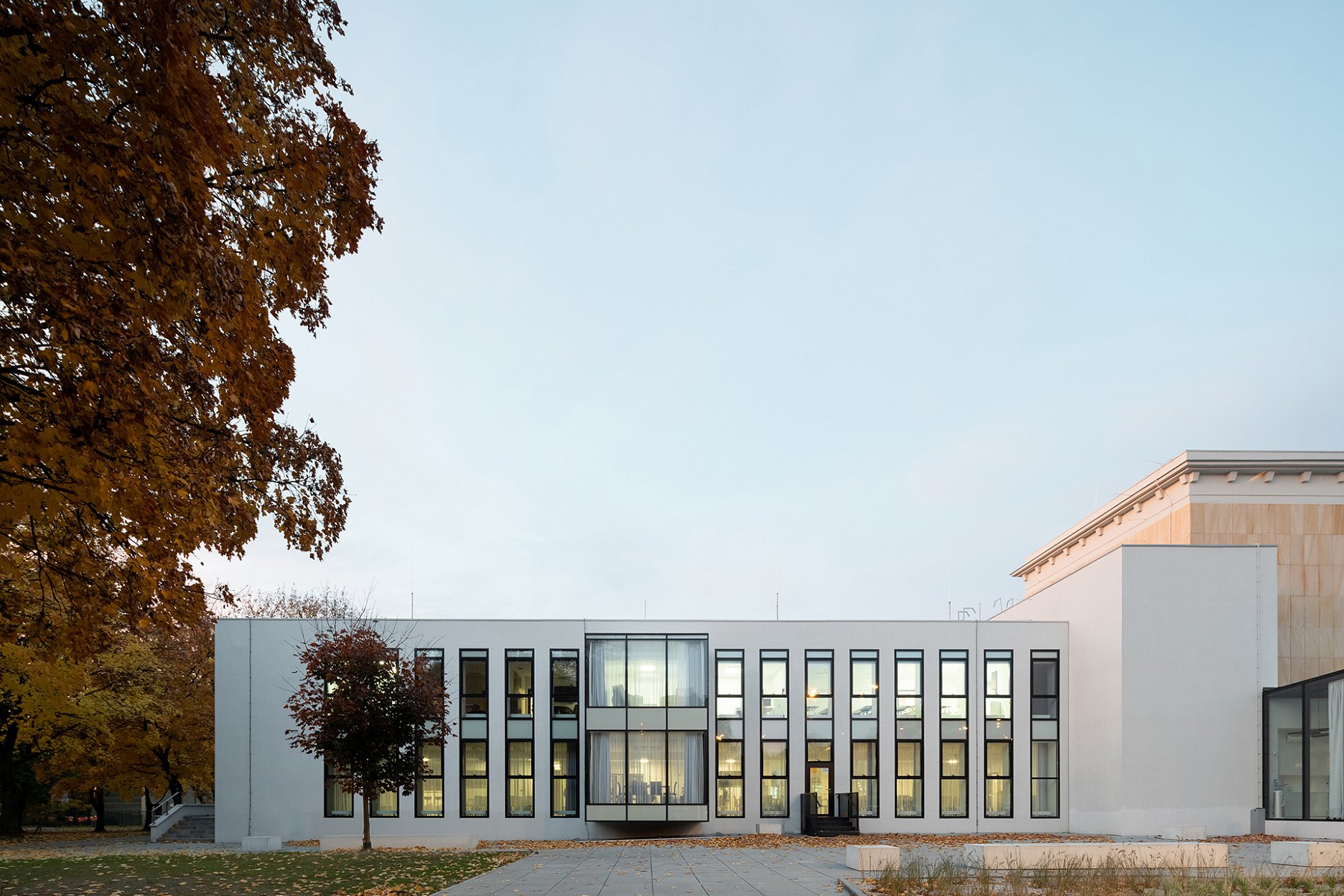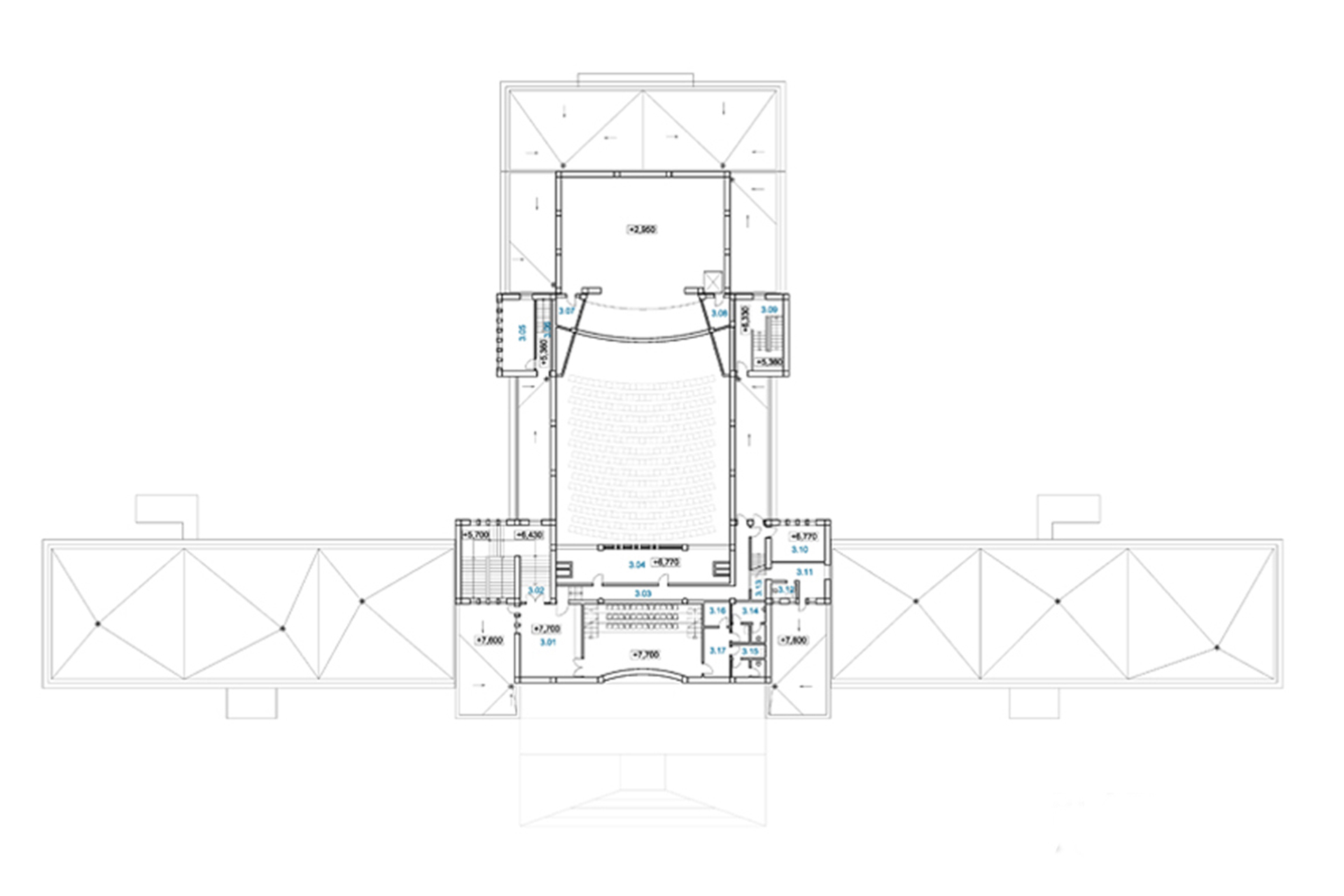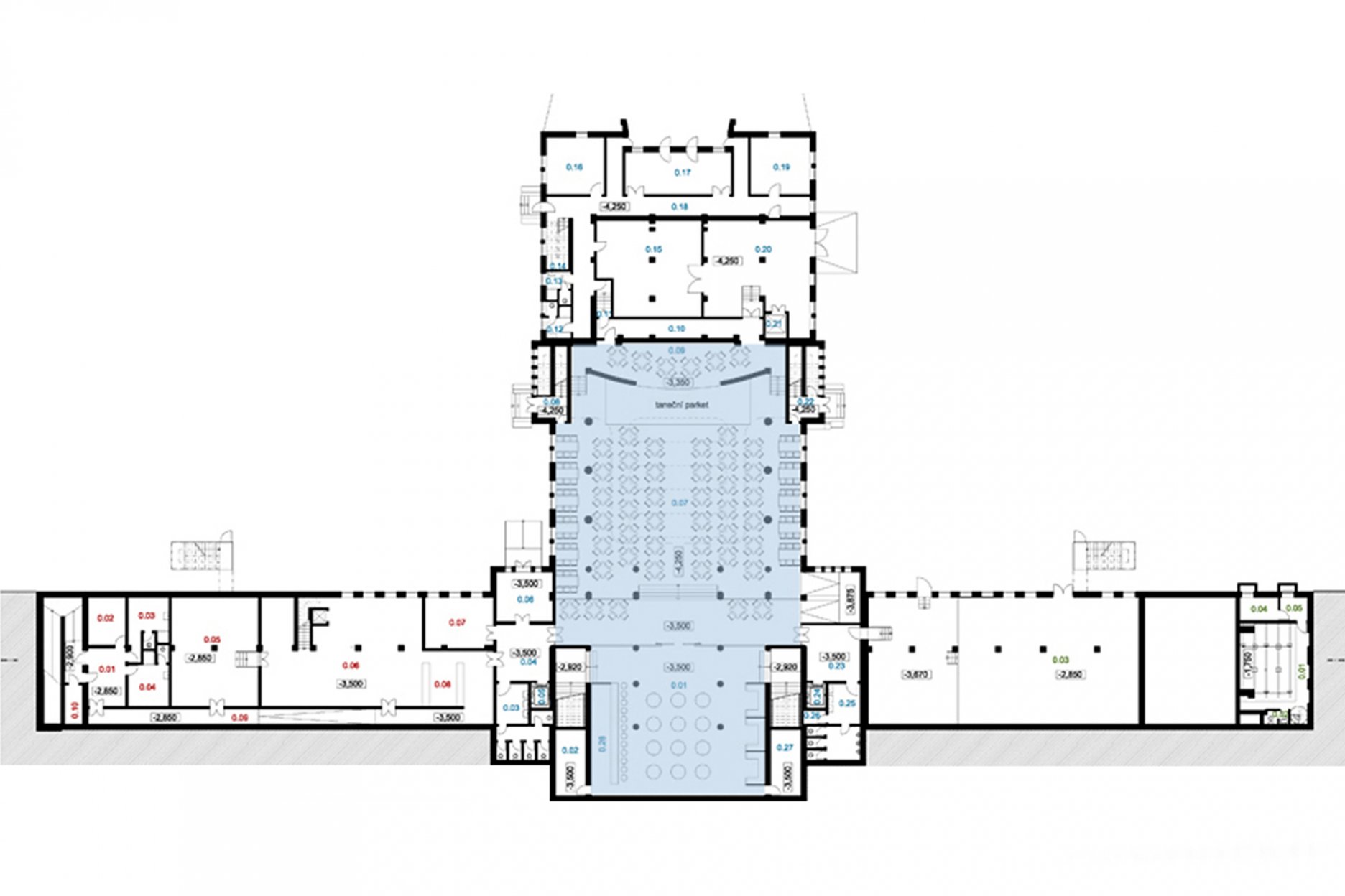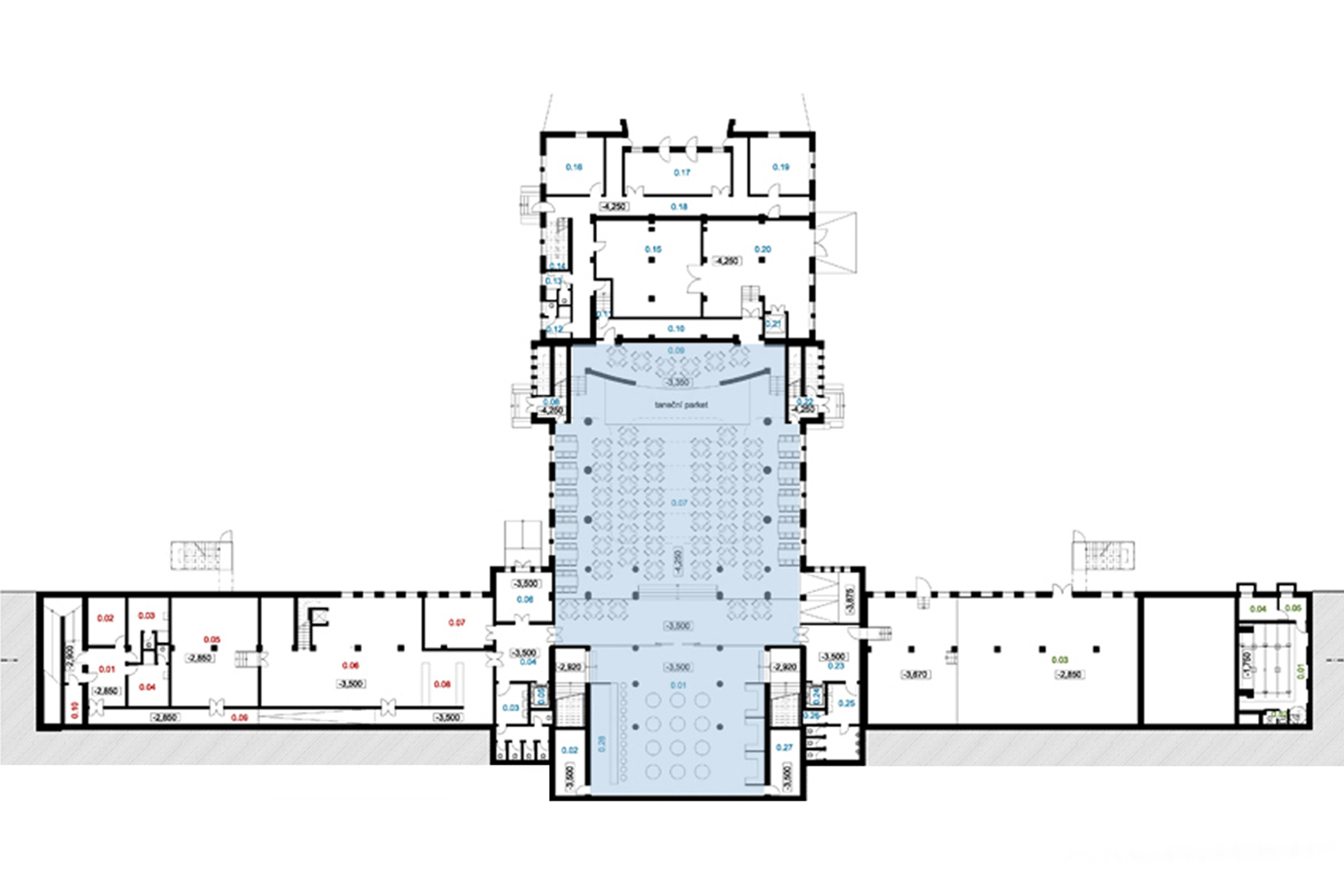 Pôvodné vstupy v bočných krídlach, rovnako ako vnútorné schodiská nahradili výraznejšie transparentné hmoty, riešené vo väzbe na vstupnú zasklenú fasádu.