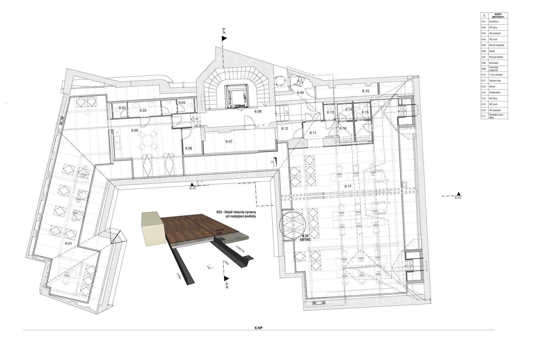 Pri riešení TZB v priestoroch historickej budove však neostalo nič pôvodné. Pre dosiahnutie vysokého štandardu kvality vnútorného prostredia boli kompletne vymenené všetky rozvody zdravotechniky, vykurovania, chladenia a vzduchotechniky. Pri obnove sa nám podarilo demontovať všetky kondenzačné jednotky, ktoré sa v priebehu rokov začali objavovať na fasádach a vo vnútroblokoch. Tým sme docielili čistý vzhľad fasád a nechali vyniknúť jej štruktúru a tvaroslovie, ktoré je viditeľné z hradného kopca a okolitej zástavby. Samostatné jednotky nahradil atypický interiérový VRV systém, v kombinácii so štandardným VRV systémom, umiestneným vo dvore vnútrobloku. Každý kancelársky priestor má zabezpečené užívateľom regulované vykurovanie a chladenie. Parapetné radiátory a teplovzdušné vykurovanie v parteri nahradil nový systém podlahového kúrenia. Spomínaná úprava technológie, spolu so zmenou systému vetrania, umožnila odstrániť parapety a otvoriť priečelie fasády.