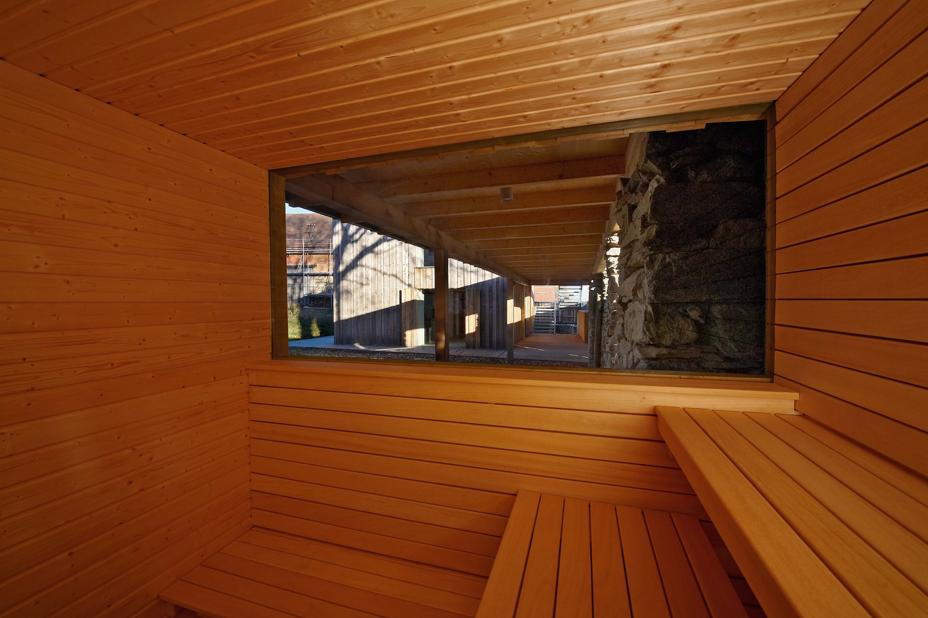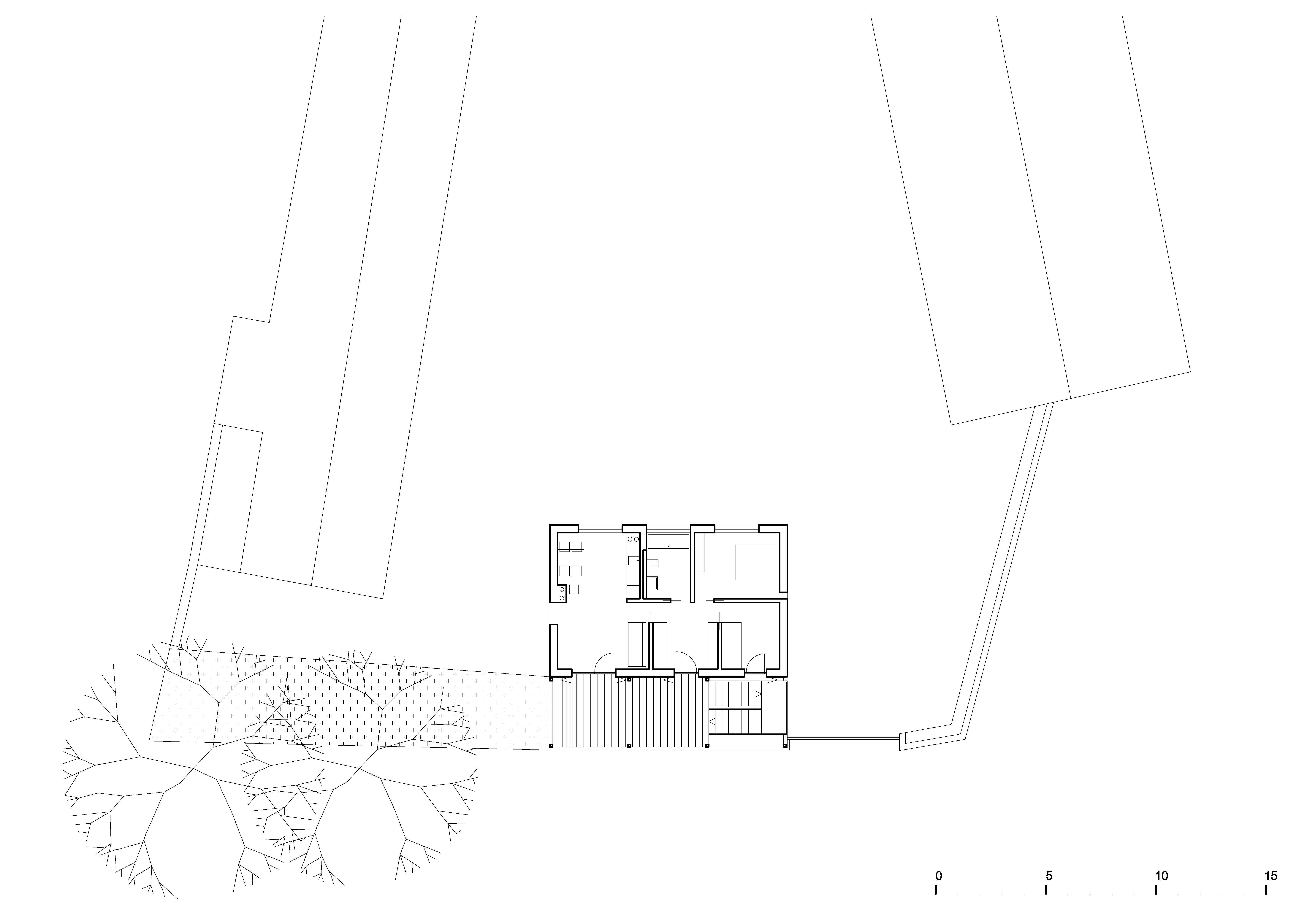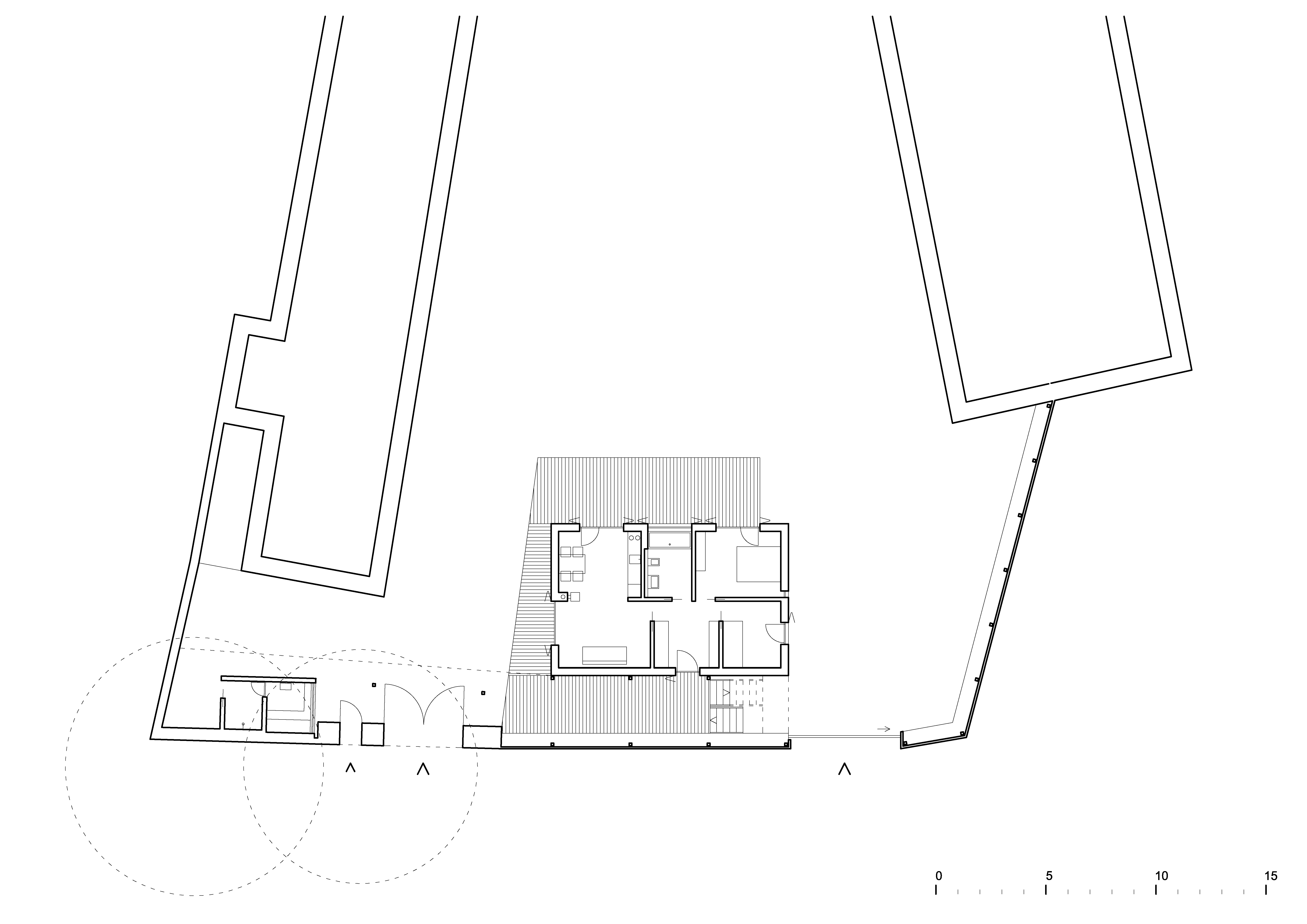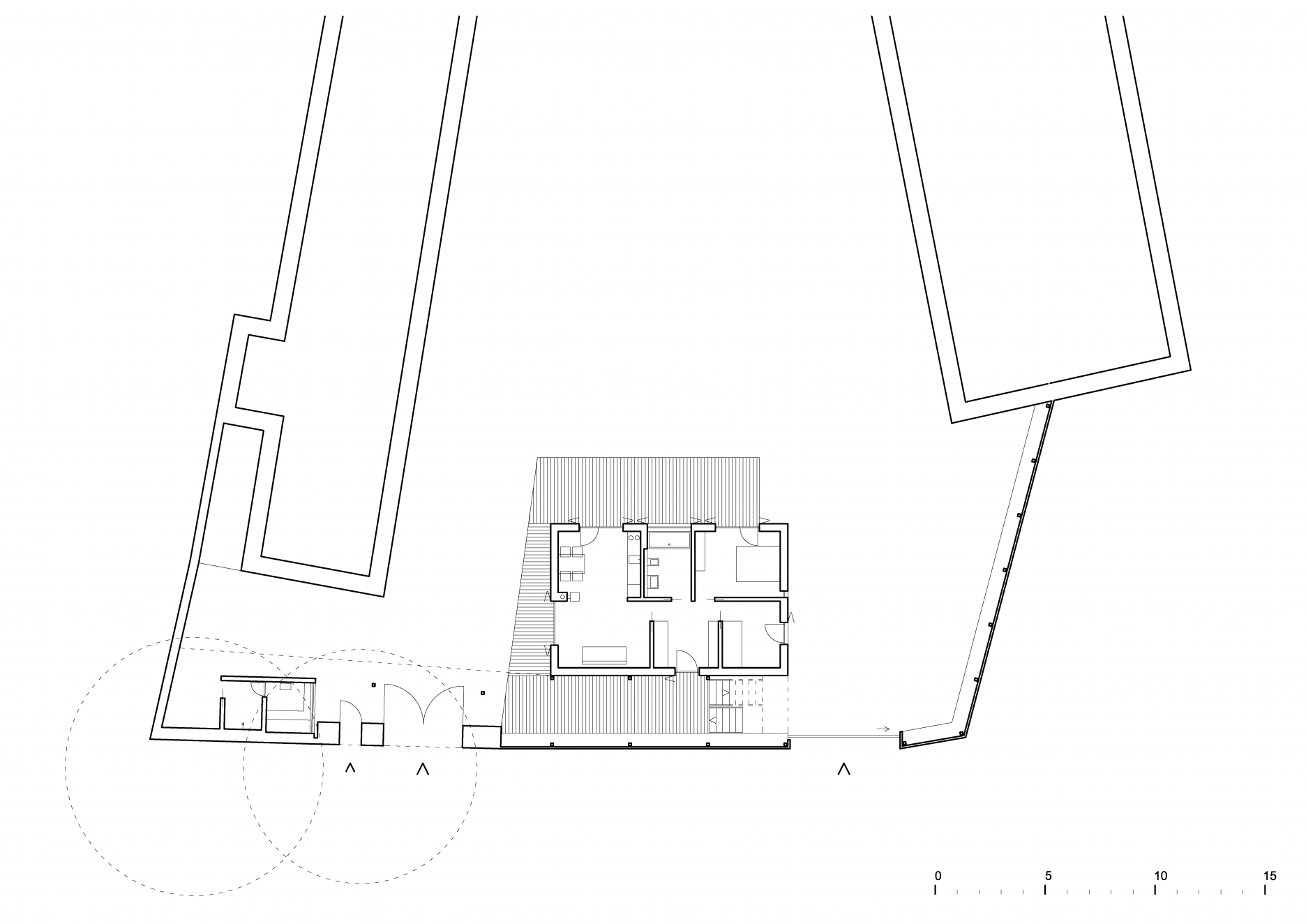 Prízemná horizontálna hmota so saunou vytvára krytý vstup, vjazd a zároveň je prepojená s hmotou poschodia, kde sa nachádzajú apartmány. Dva identické apartmány nad sebou s veľkosťou 3 + kk sú prístupné cez kryté vonkajšie schodisko. Exaktná kubická hmota prístavby kontrastuje s vidieckou zástavbou, ktorú predstavuje archetyp domu so sedlovou strechou. Novostavba, ktorá vznikla v prvej etape výstavby slúži ako zázemie pre rodinu a plánovanú rekonštrukciu stodoly a domu s chlievom.