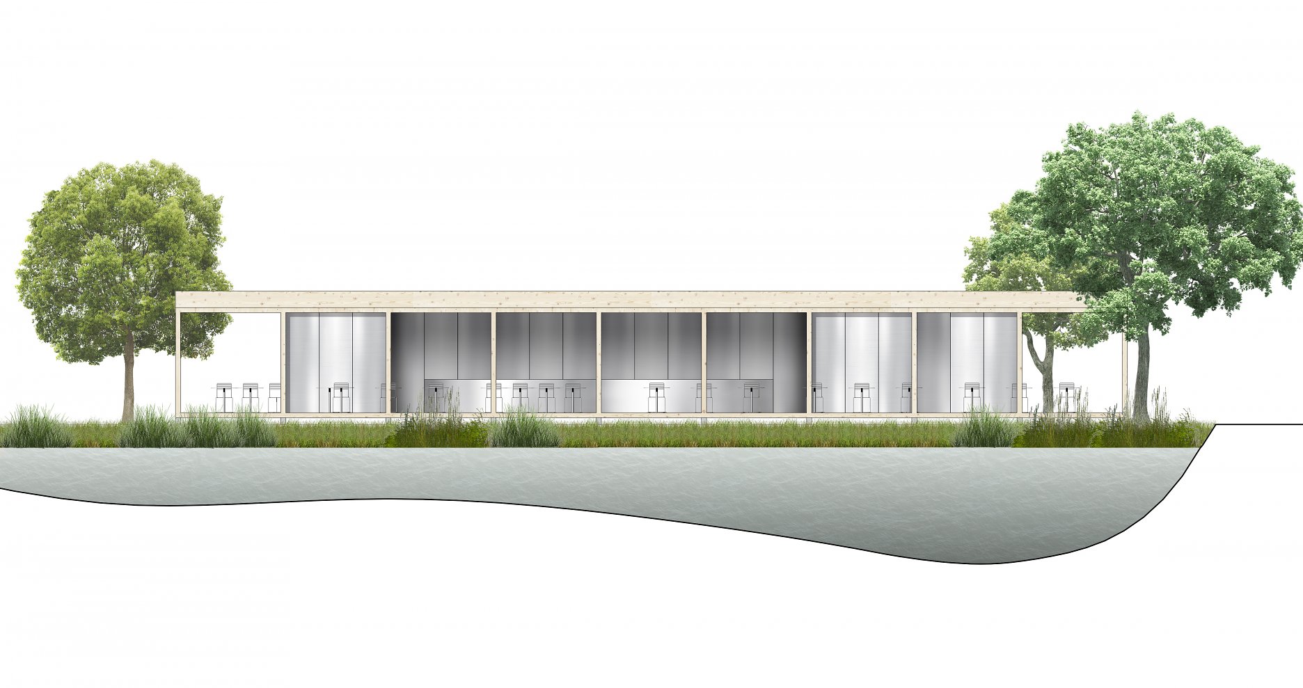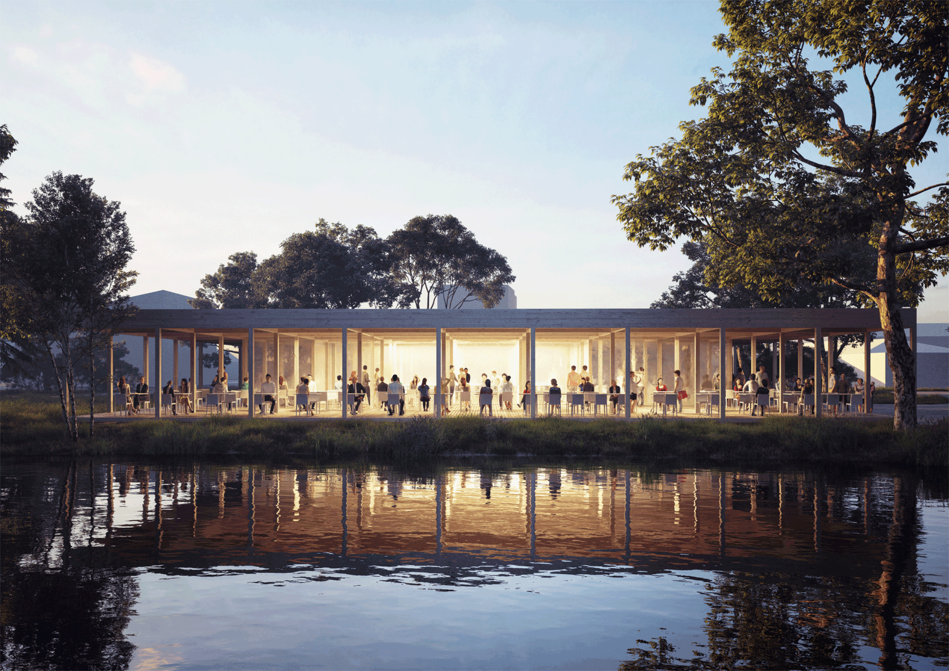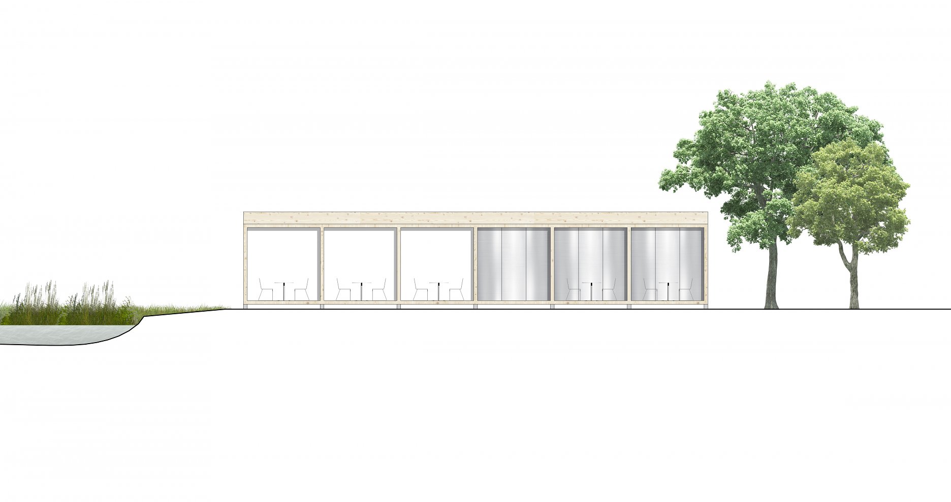 V tomto duchu sa nesie aj realizácia reštaurácie pri jednom z rybníkov v priestoroch výstaviska. Objekt stojí na mieste chátrajúcej drevostavby zo 70. rokov. Zadanie, ktoré počítalo so sezónnou prevádzkou reštaurácie, umožnilo architektom stavbu v maximálnej miere otvoriť do exteriéru, najmä k výhľadom na vodnú plochu. Dispozíciu vymedzujú základné konštrukčné prvky - masívne hranoly - tvoriace priestorové moduly so stranou 3 m. Rozsiahlu terasu / odbytový priestor zastrešuje strop, so svietidlami zavesenými v diagonálach jednotlivých polí. Architektonické riešenie vyzdvihuje konštrukčnú logiku, priznáva použité prvky, riešenia a materiály. Zázemie a kuchyňu uzatvára sivá obálka. Pôvodne navrhované leštené hliníkové panely pri realizácii nahradili cementotrieskové dosky. Optimalizácia nákladov sa prejavila aj na absencii textilných priesvitných roliet, navrhovaných po obvode terasy. Tie mali návštevníkov čiastočne ochrániť pred priamym slnkom, vetrom, dažďom a zároveň, pri úplnom zatiahnutí, umožniť priestor dočasne vykúriť externými zdrojmi tepla. K ich realizácii zatiaľ nedošlo. Po záverečnej je však možné uzavrieť bar prostredníctvom harmonikových dverí a začleniť ho do prevádzkového bloku.