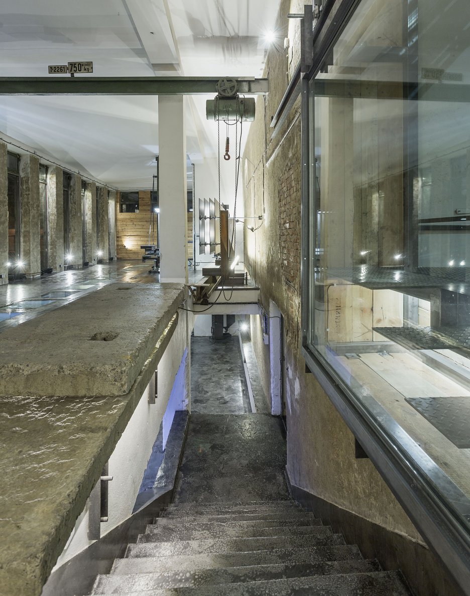 Vstupné schodisko s premostením a riešenie interiéru nadväzuje na industriálnu architektúru existujúceho objektu. Preberá konštrukčné a technické prvky prostredia, vrátane charakteristických montážnych detailov.