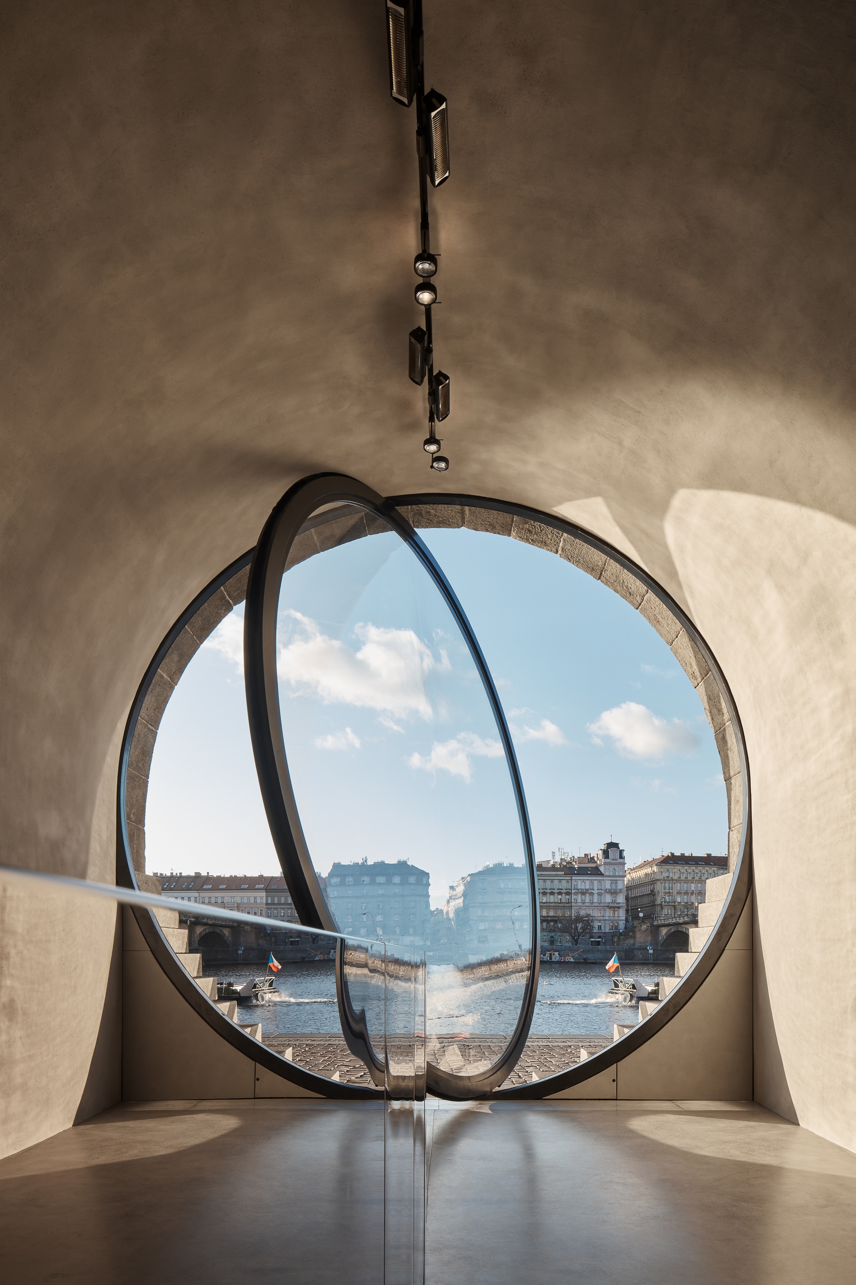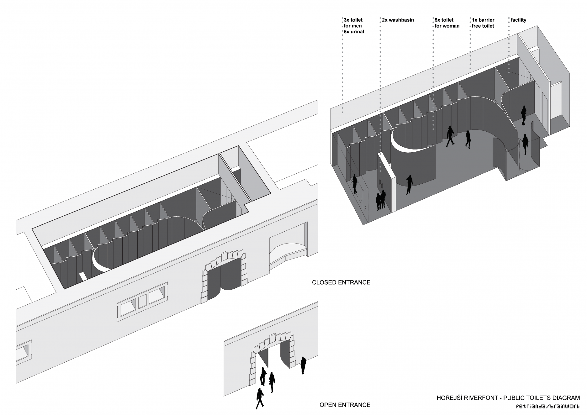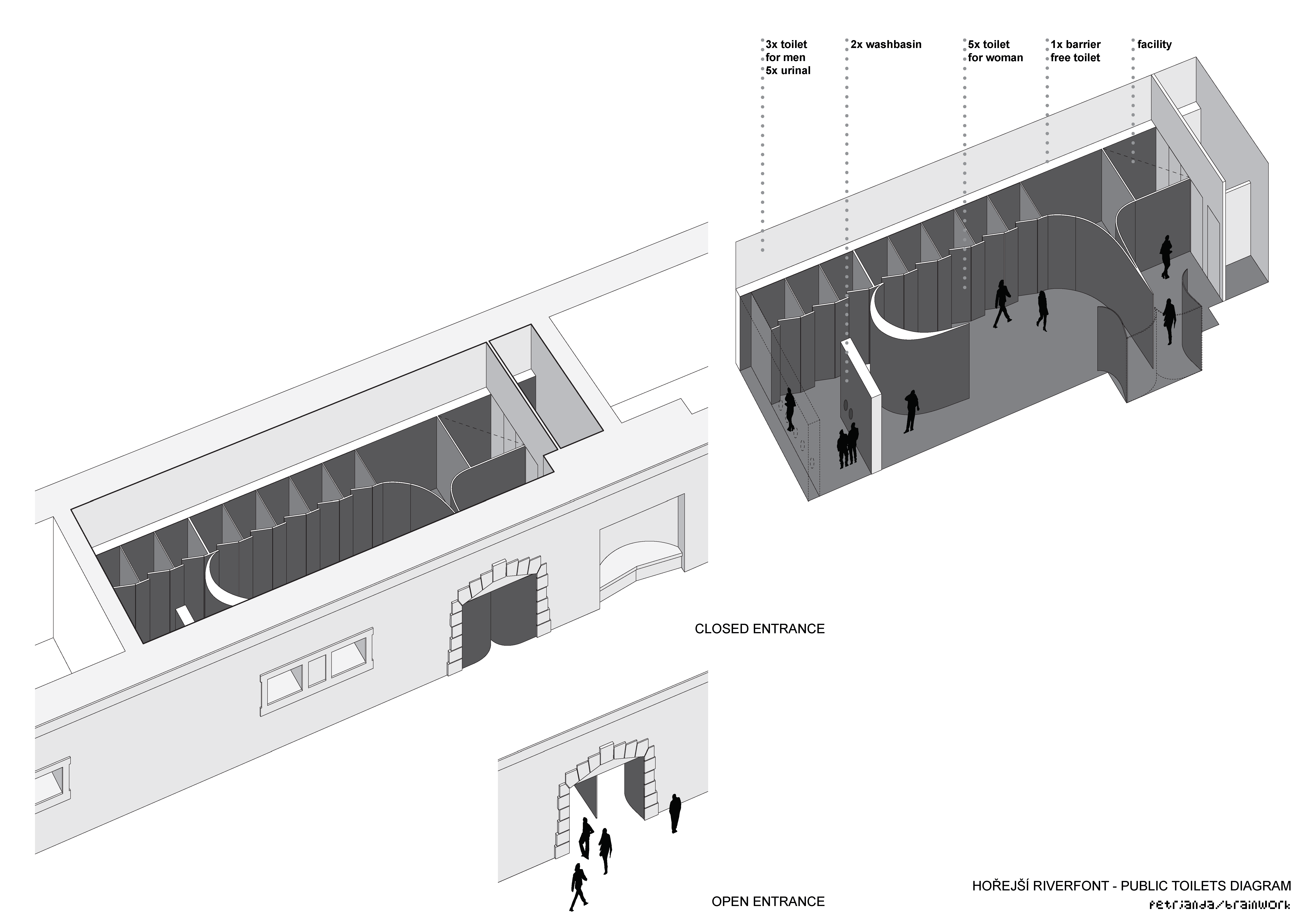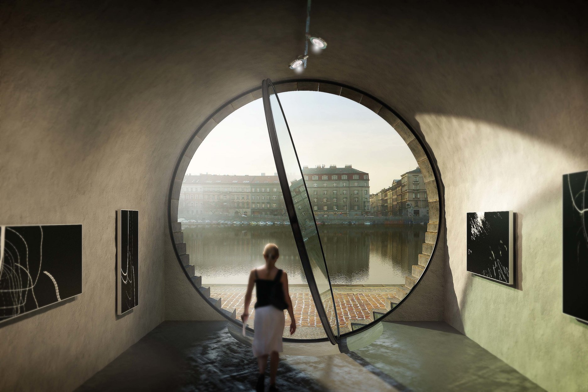 Architektúra šestice kobiek na Rašínovom nábreží je postavená na doplnení (takmer) kruhových ostení. Lapidárny zásah, ktorý viac odoberá než pridáva, zvýrazňuje kruhový portál v nábrežnom múre. Vybúrané steny z ťahokovu a kamenné "zátky", vstavané do pôvodných mostných oblúkov, nahradili veľkoformátové kruhové okná s atypickým mechanizmom otvárania. Vstupné portály sú riešené ako oceľové rámy, s dilatačne osadenými sklami s hmotnosťou 1-1,5 t. Súčasťou kompozície je doplnenie ostenia stupňovitou vostavbou, ktorá integruje prístup do inštalačnej šachty pod portálom, vývody vzduchotechniky a montážne prvky protipovodňového systému. Eliptické pivotové okná majú priemer 5,5 m, hrúbku organického skla 7 cm a hmotnosť približne 2,5 tony. “Každé má unikátní tvar a vzhledem ke své velikosti přesahující možnosti standardního zasklení, jde pravděpodobně o největší pivotová okna na světě,” dopĺňajú autori. Pohyb je riešený motoricky. V prevádzkovej pozícii sú okná zafixovaná v uhle 60°. Ďalšou z možností je automatické senzorické otváranie ovládané pohybovými čidlami, alebo otváranie obsluhou baru. Vstupy do štrnástich kobiek na Hořejšího nábreží definujú oceľové skulpturálne dvere, prehnuté do ostenia tak, aby pri otvorení prepojili kobku a náplavku v celom priereze. V kobkách, s verejnými toaletami, prechádzajú vstupné krídla plynulým oblúkom do interiérovej “membrány”, ktorá oddeľuje kabíny od verejného predpriestoru.