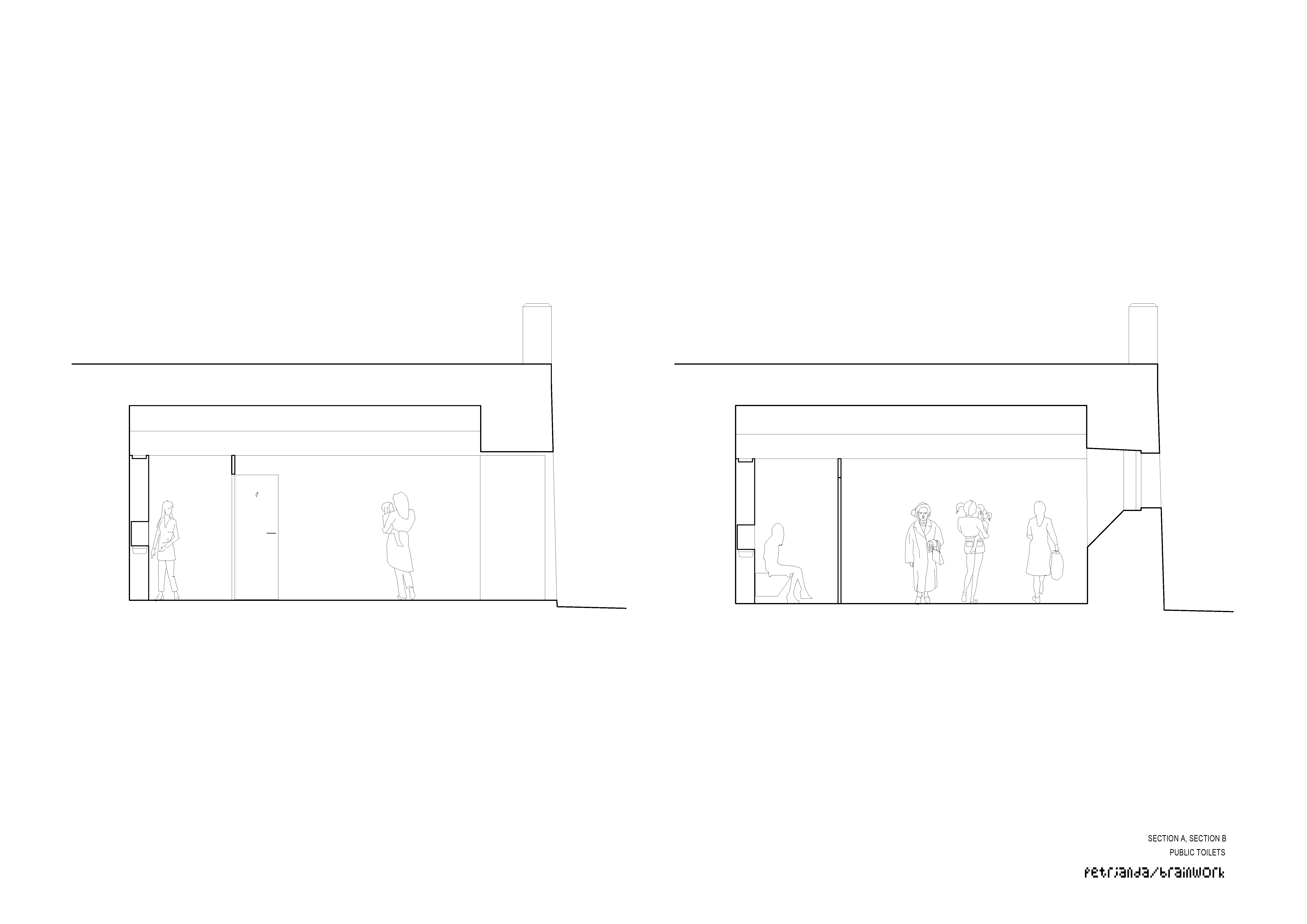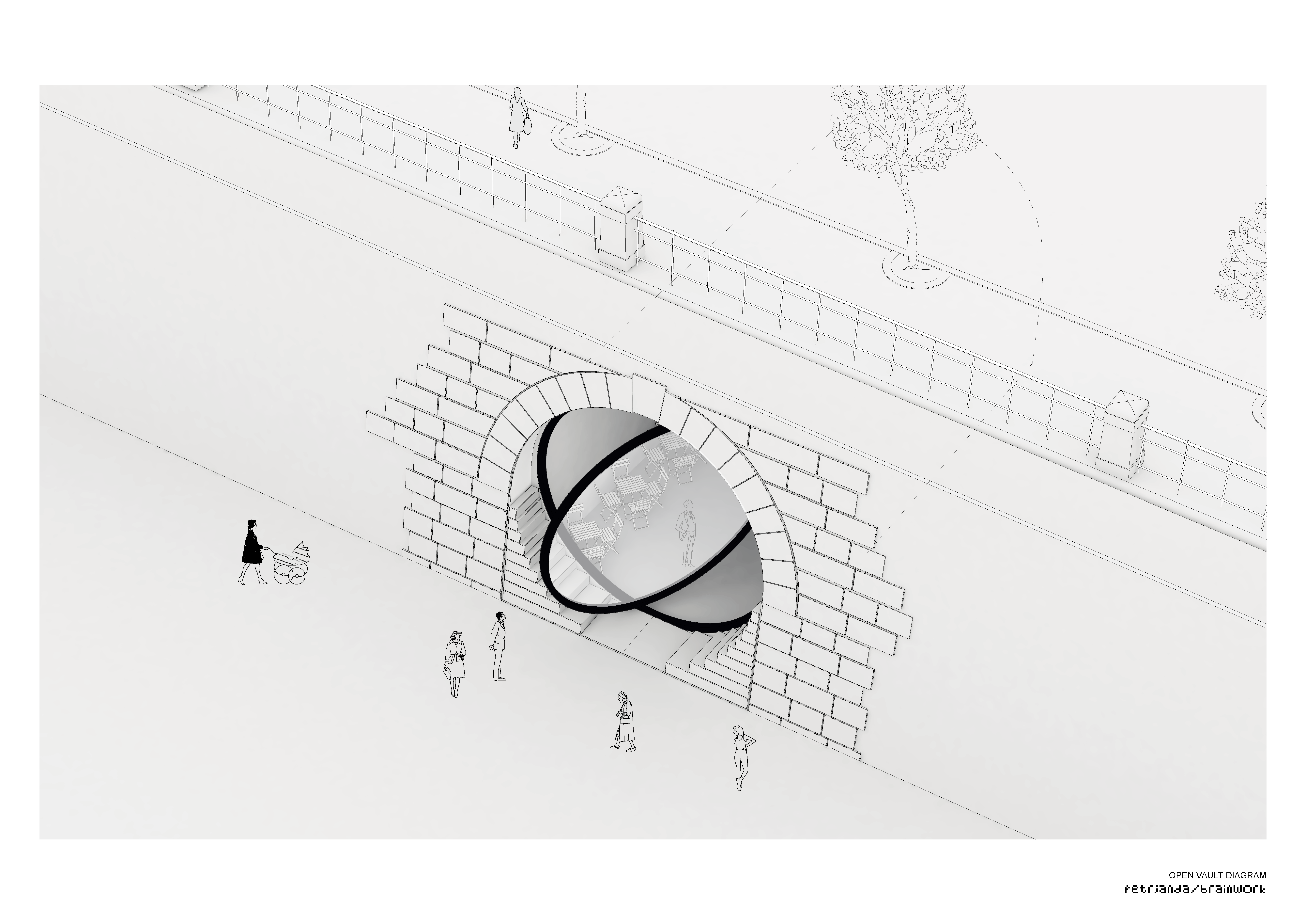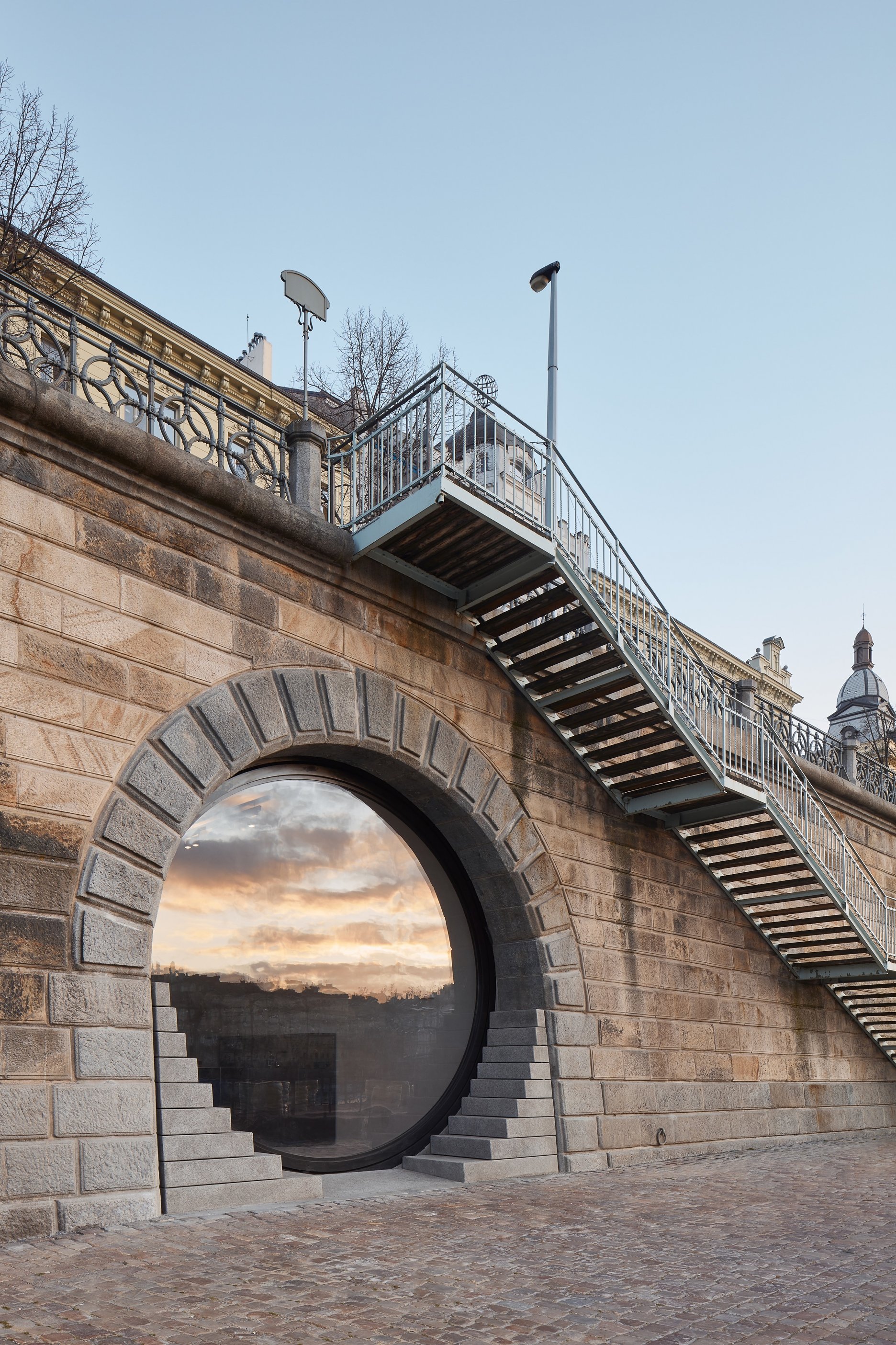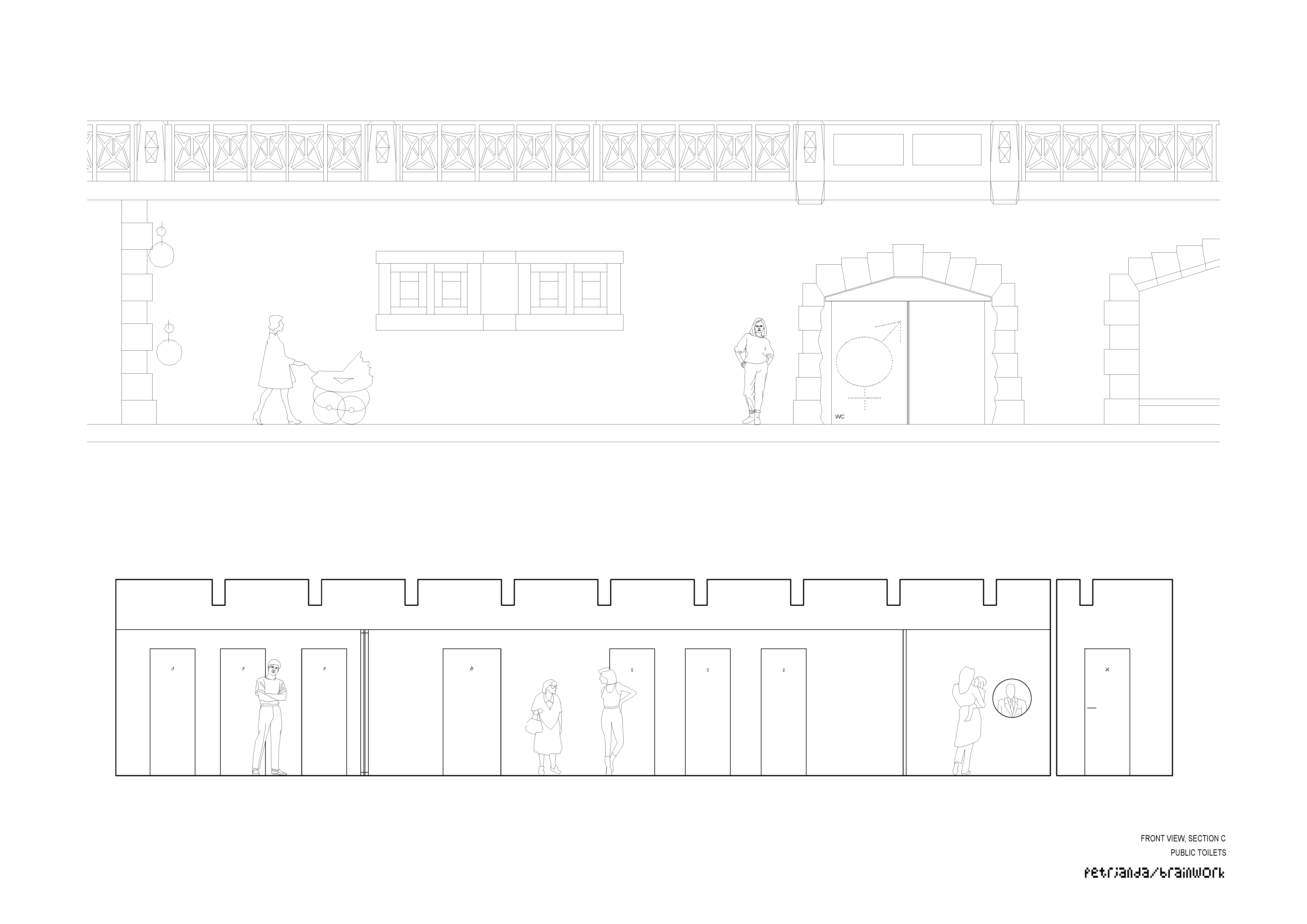 Architektúra šestice kobiek na Rašínovom nábreží je postavená na doplnení (takmer) kruhových ostení. Lapidárny zásah, ktorý viac odoberá než pridáva, zvýrazňuje kruhový portál v nábrežnom múre. Vybúrané steny z ťahokovu a kamenné "zátky", vstavané do pôvodných mostných oblúkov, nahradili veľkoformátové kruhové okná s atypickým mechanizmom otvárania. Vstupné portály sú riešené ako oceľové rámy, s dilatačne osadenými sklami s hmotnosťou 1-1,5 t. Súčasťou kompozície je doplnenie ostenia stupňovitou vostavbou, ktorá integruje prístup do inštalačnej šachty pod portálom, vývody vzduchotechniky a montážne prvky protipovodňového systému. Eliptické pivotové okná majú priemer 5,5 m, hrúbku organického skla 7 cm a hmotnosť približne 2,5 tony. “Každé má unikátní tvar a vzhledem ke své velikosti přesahující možnosti standardního zasklení, jde pravděpodobně o největší pivotová okna na světě,” dopĺňajú autori. Pohyb je riešený motoricky. V prevádzkovej pozícii sú okná zafixovaná v uhle 60°. Ďalšou z možností je automatické senzorické otváranie ovládané pohybovými čidlami, alebo otváranie obsluhou baru. Vstupy do štrnástich kobiek na Hořejšího nábreží definujú oceľové skulpturálne dvere, prehnuté do ostenia tak, aby pri otvorení prepojili kobku a náplavku v celom priereze. V kobkách, s verejnými toaletami, prechádzajú vstupné krídla plynulým oblúkom do interiérovej “membrány”, ktorá oddeľuje kabíny od verejného predpriestoru.