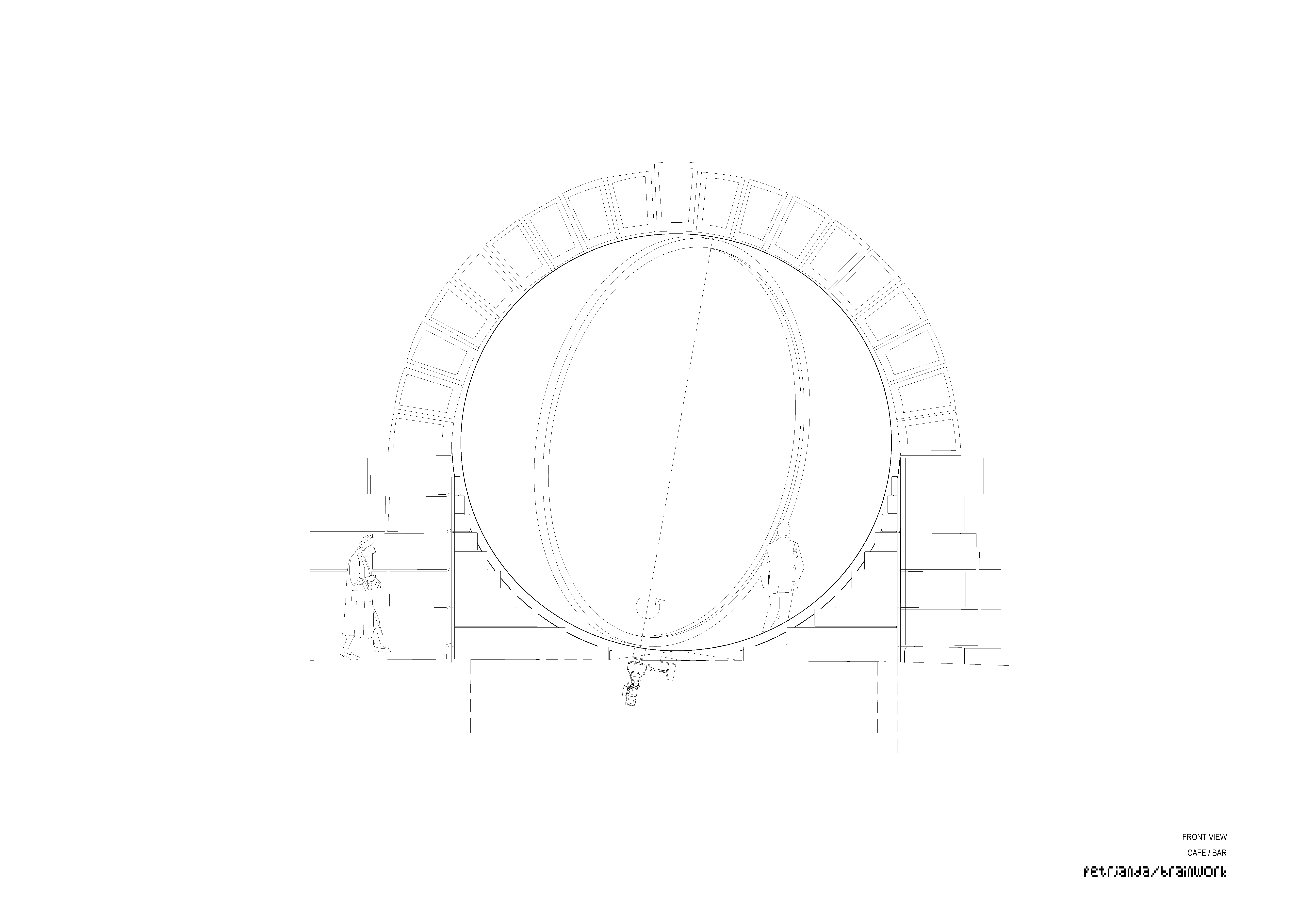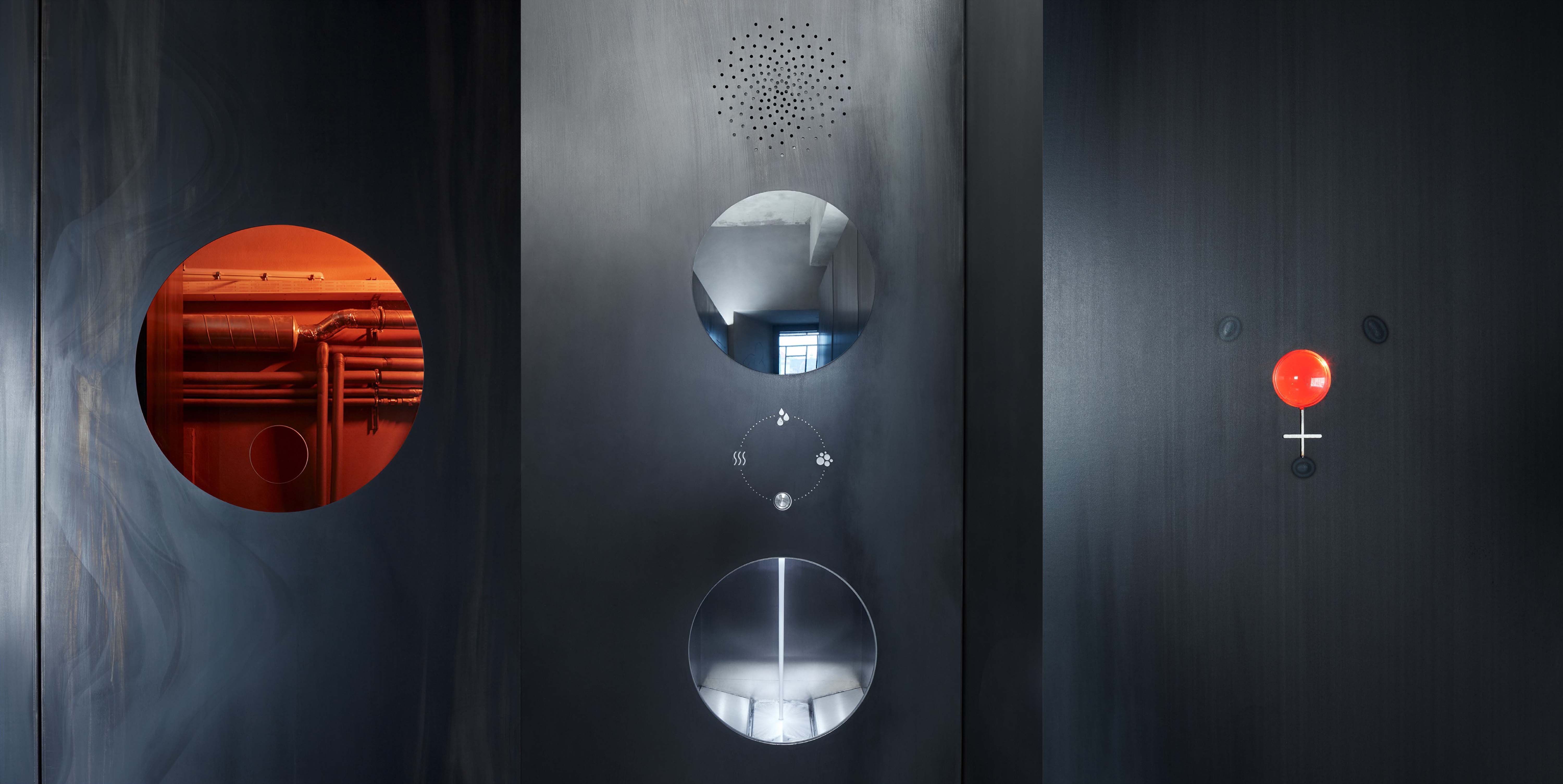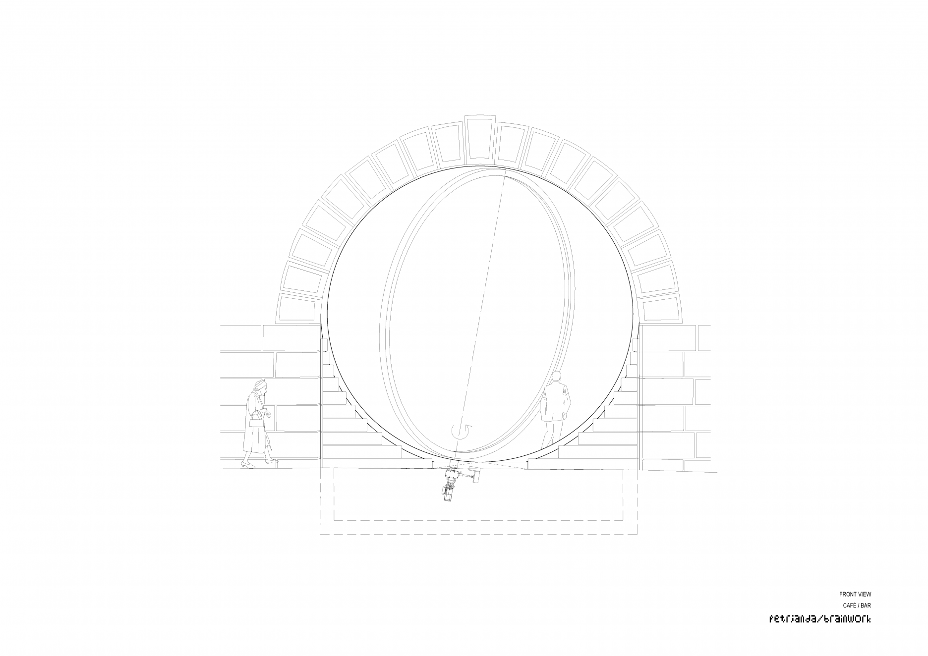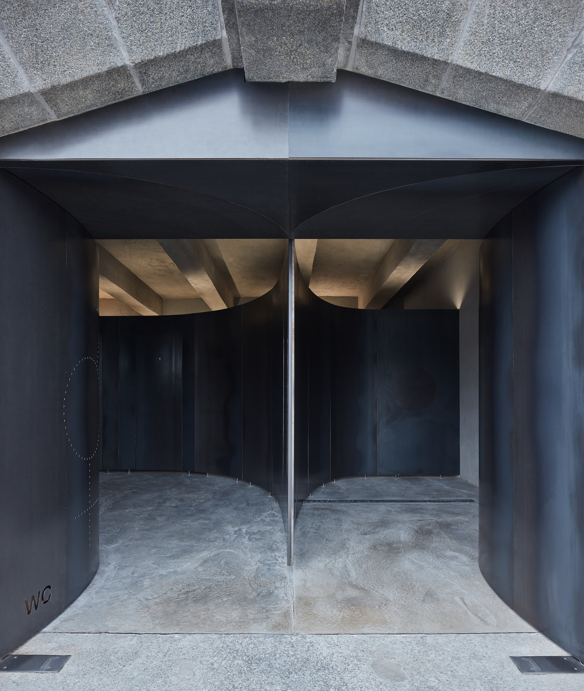 Architektúra šestice kobiek na Rašínovom nábreží je postavená na doplnení (takmer) kruhových ostení. Lapidárny zásah, ktorý viac odoberá než pridáva, zvýrazňuje kruhový portál v nábrežnom múre. Vybúrané steny z ťahokovu a kamenné "zátky", vstavané do pôvodných mostných oblúkov, nahradili veľkoformátové kruhové okná s atypickým mechanizmom otvárania. Vstupné portály sú riešené ako oceľové rámy, s dilatačne osadenými sklami s hmotnosťou 1-1,5 t. Súčasťou kompozície je doplnenie ostenia stupňovitou vostavbou, ktorá integruje prístup do inštalačnej šachty pod portálom, vývody vzduchotechniky a montážne prvky protipovodňového systému. Eliptické pivotové okná majú priemer 5,5 m, hrúbku organického skla 7 cm a hmotnosť približne 2,5 tony. “Každé má unikátní tvar a vzhledem ke své velikosti přesahující možnosti standardního zasklení, jde pravděpodobně o největší pivotová okna na světě,” dopĺňajú autori. Pohyb je riešený motoricky. V prevádzkovej pozícii sú okná zafixovaná v uhle 60°. Ďalšou z možností je automatické senzorické otváranie ovládané pohybovými čidlami, alebo otváranie obsluhou baru. Vstupy do štrnástich kobiek na Hořejšího nábreží definujú oceľové skulpturálne dvere, prehnuté do ostenia tak, aby pri otvorení prepojili kobku a náplavku v celom priereze. V kobkách, s verejnými toaletami, prechádzajú vstupné krídla plynulým oblúkom do interiérovej “membrány”, ktorá oddeľuje kabíny od verejného predpriestoru.